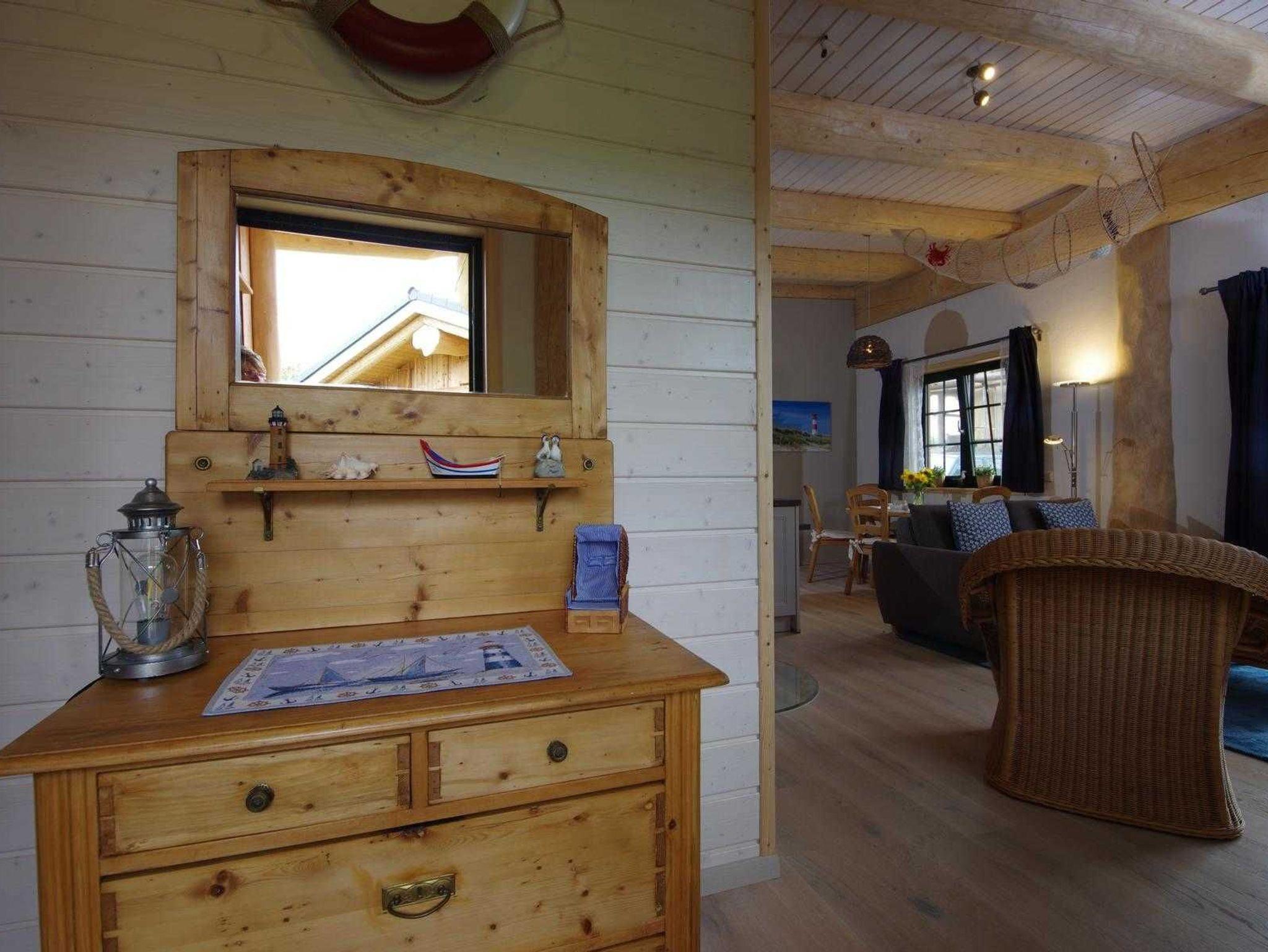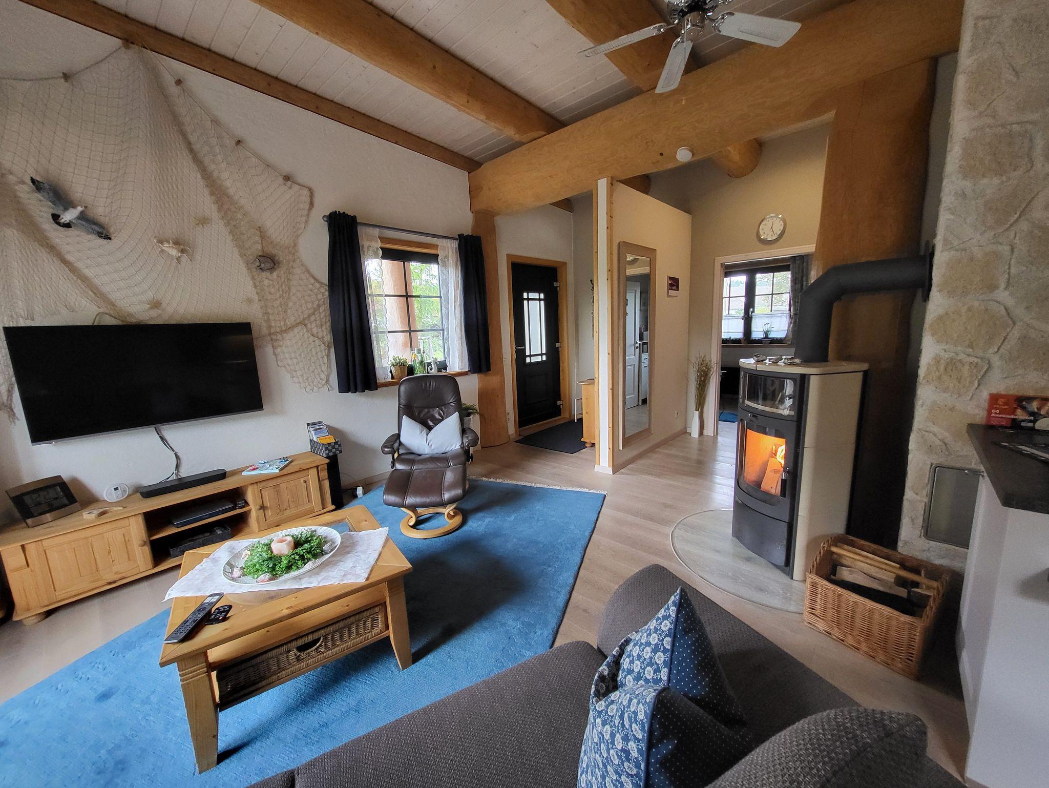Urlaub im Ferienhaus Fischerhütte aus über 100 Jahre alten Naturstämmen, barrierearm gebaut, mit gemütlicher Einrichtung im maritimen Stil
