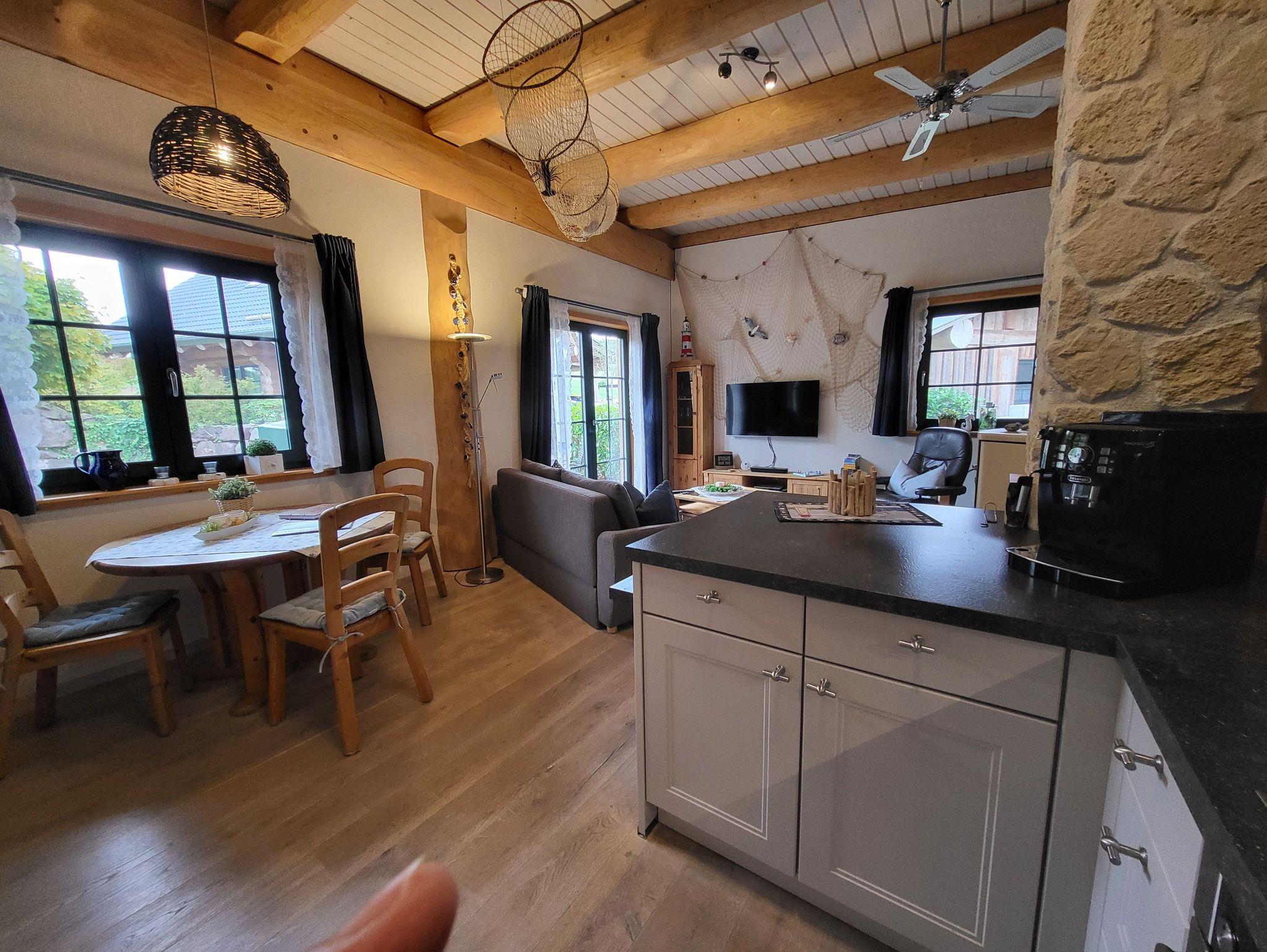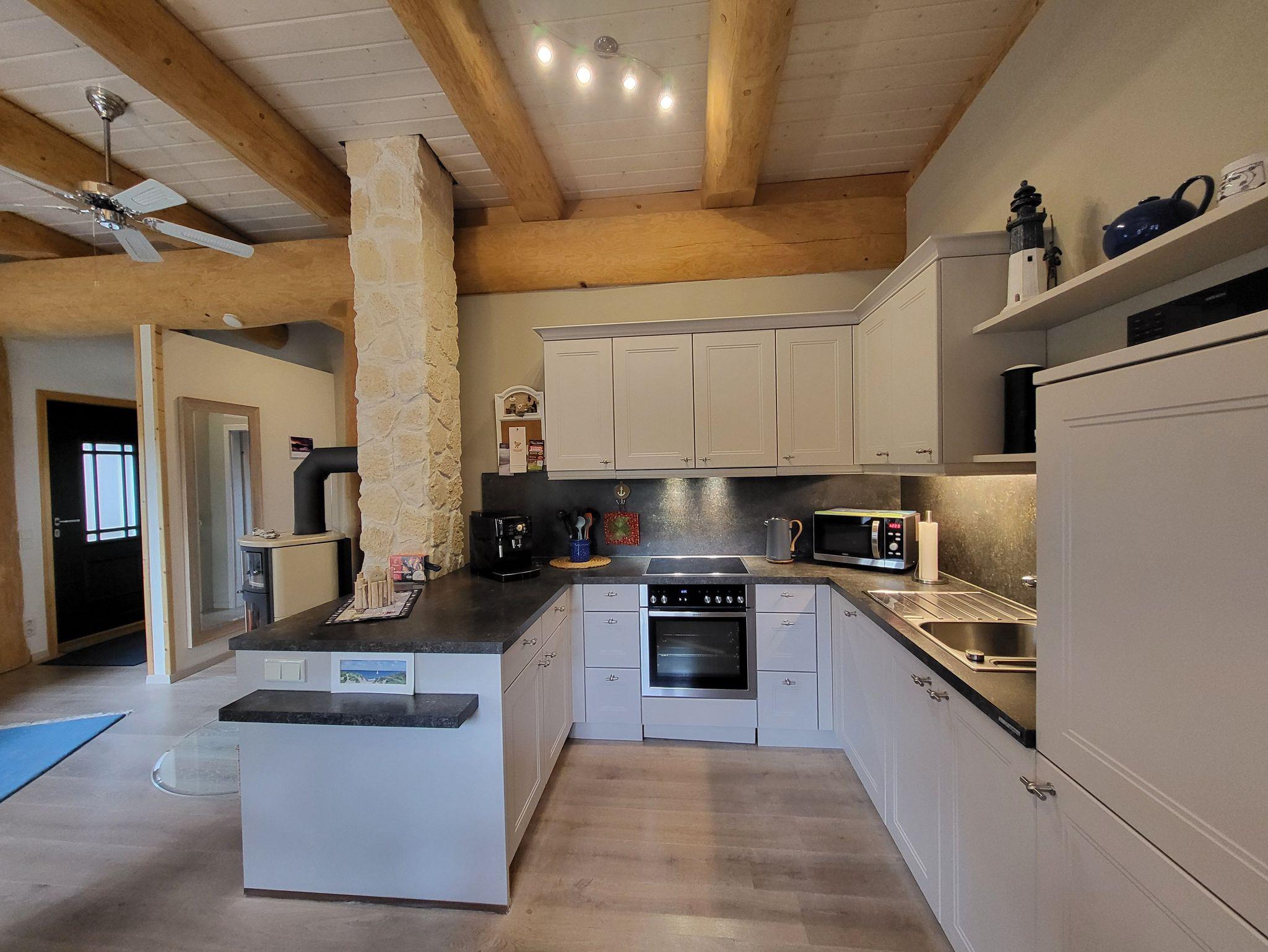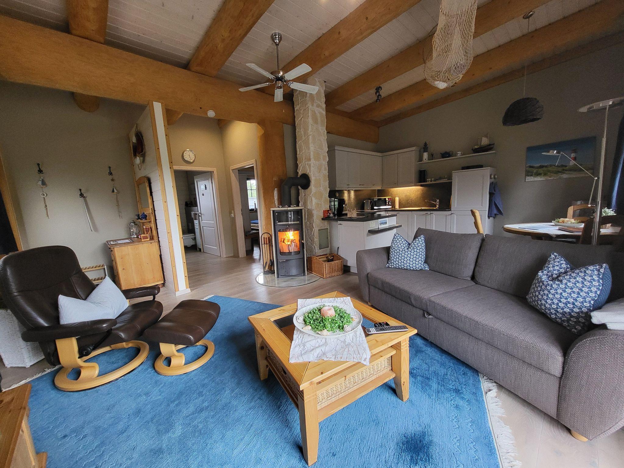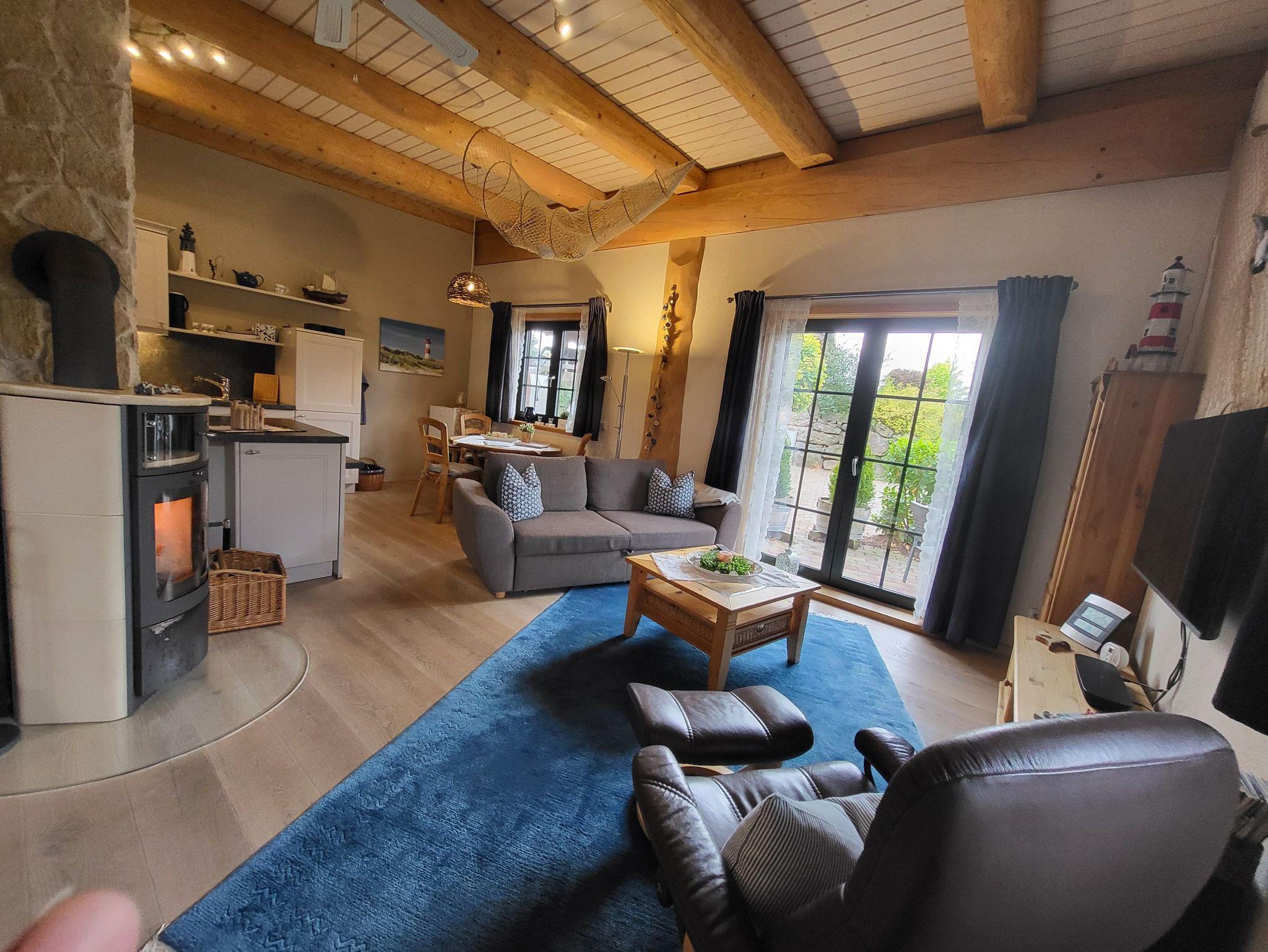 Das Haus verfügt über einen offenen Wohnraum mit Kaminofen, einem hochwertiges Schlafsofa (1,60 x 2,0 m ), 46 Smart TV mit Soundbar sowie einem Esstisch mit Stühlen. Die Nolte Einbauküche ist mit Spülmaschine, Ceranfeld, Dunstabzugshaube, Backofen, Mikrowelle, Kühlschrank mit 0°-Fresh-Safe, einem kleinen Gefrierschrank, Kaffeevollautomat, Toaster und Eierkocher ausgestattet.