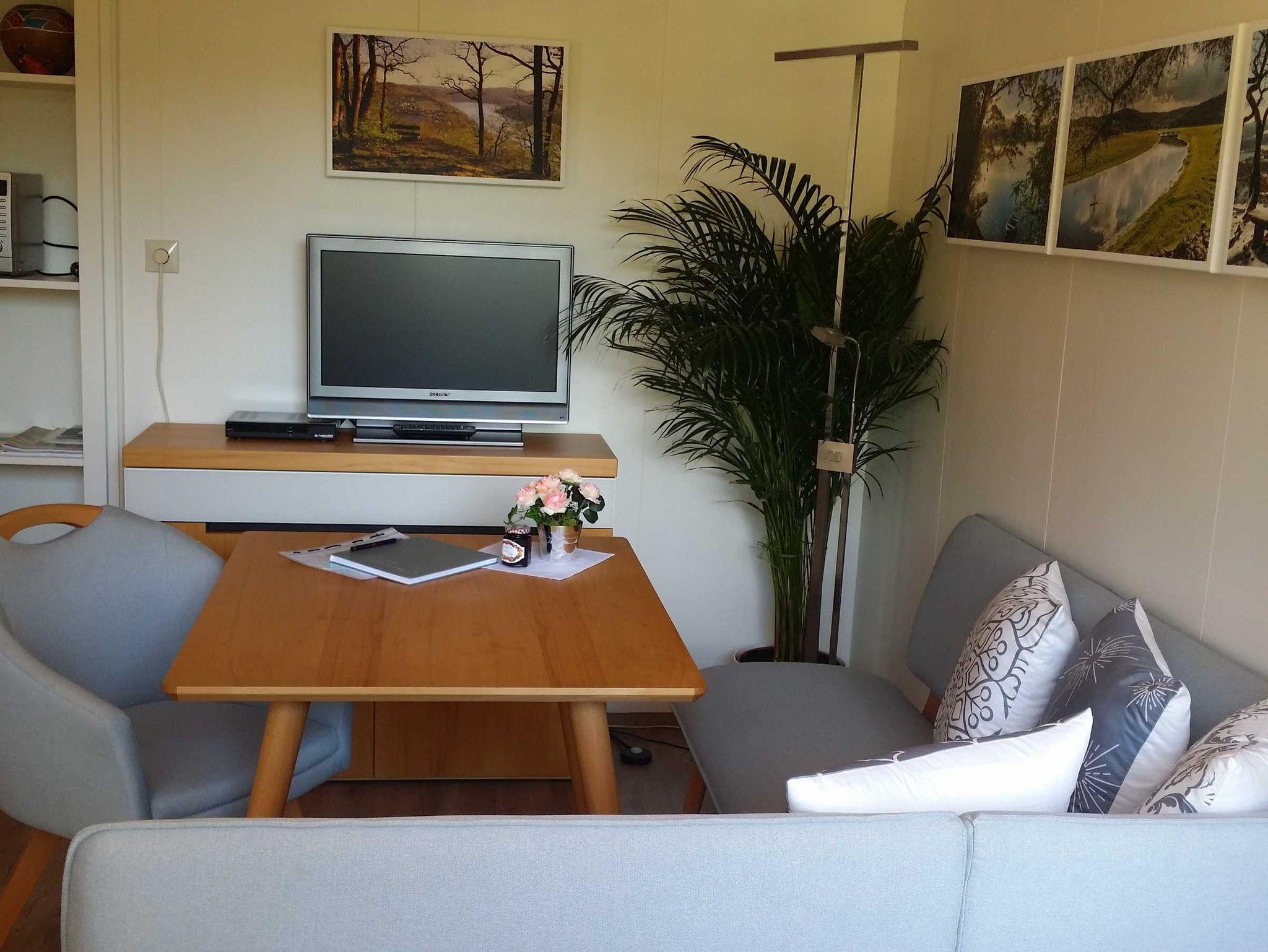 Die kleine gemütliche 50m2 Ferienwohnung/Apartment hat eine Sitzgruppe mit Fernseher, eine offene Küche mit Backofen, einen Herd mit Keramikkochfeld und eine zusätzlicher Mikrowelle. Besteck, Geschirr, Wasserkocher und Kaffemaschine sind vorhanden. Das Schlafzimmer wurde kpl. neu restauriert und liebevoll eingerichtet. Das Bad wurde kpl. erneuert und hochwertig eingerichtet. Die kleine Ferienwohnung hat eine eigene Terrasse mit angeschlossenem Garten.