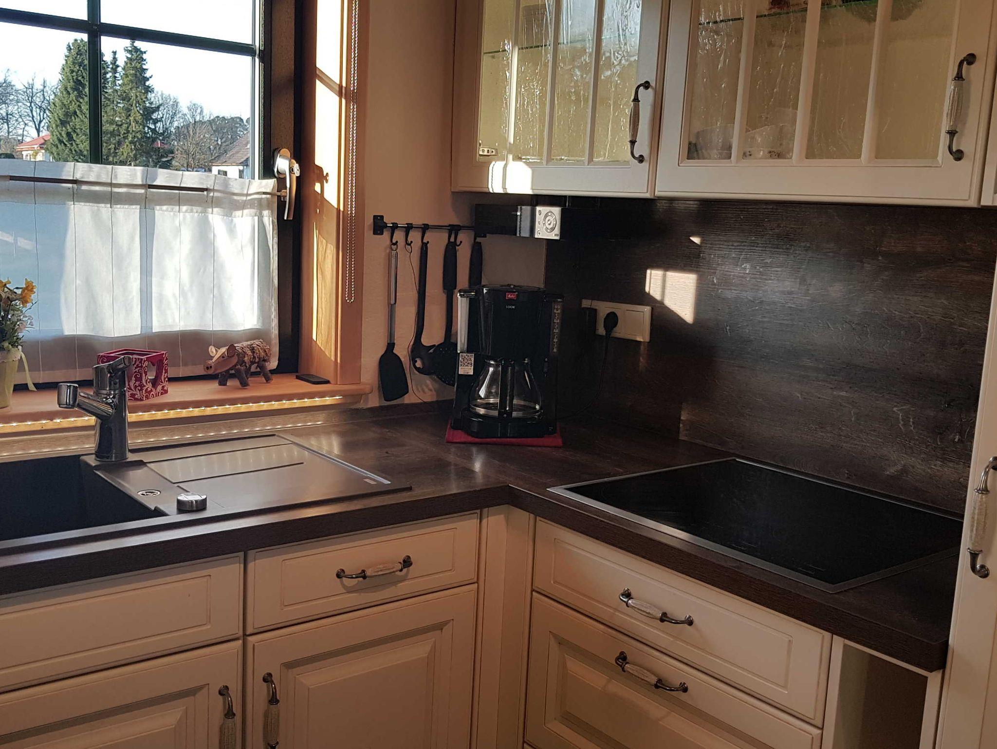 Die Nobilia Einbauküche im Landhausstil hat einen Kühlschrank mit Gefrierfach, Nespresso- Maschine (alternativ Filter-Kaffeemaschine), Induktionskochfeld und Kombi-Backofen mit Mikrowelle. Desweiteren sind Toaster, Wasserkocher und Eierkocher vorhanden.