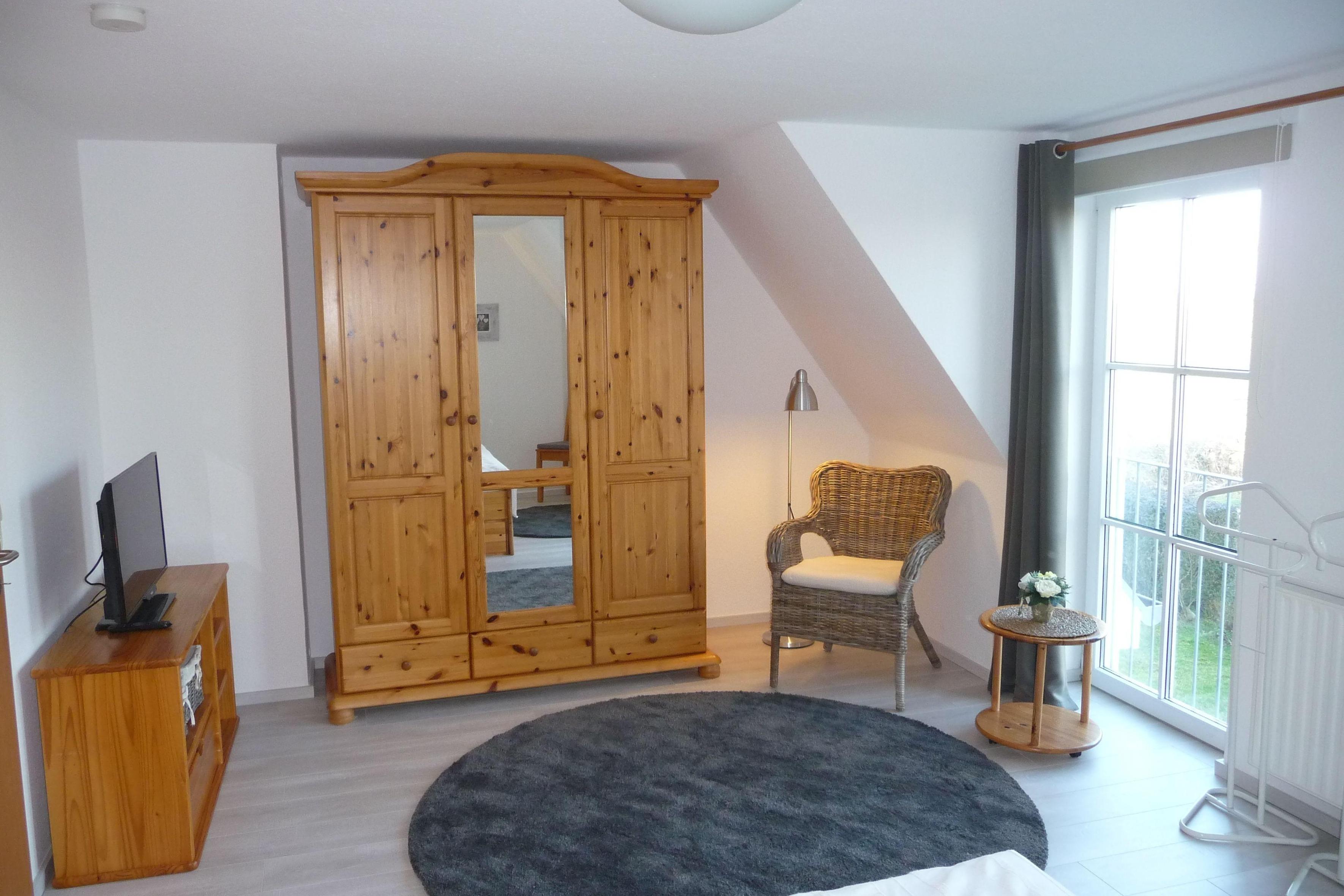 Im Erdgeschoß erreichen Sie über den Hausflur den Wohnraum und die angrenzende offene Küche. Gleichzeitig befindet sich im Erdgeschoß ein Gäste-WC. Über eine Treppe gelangen Sie in das Obergeschoß mit zwei Schlafräumen und ein Duschbad/WC. In einem Schlafraum ist ein Doppelbett und in dem anderen Schlafraum sind zwei Einzelbetten. Weiter geht es über die Treppe in das Dachgeschoß. Hier gibt es ein Studio mit einem Doppelbett.