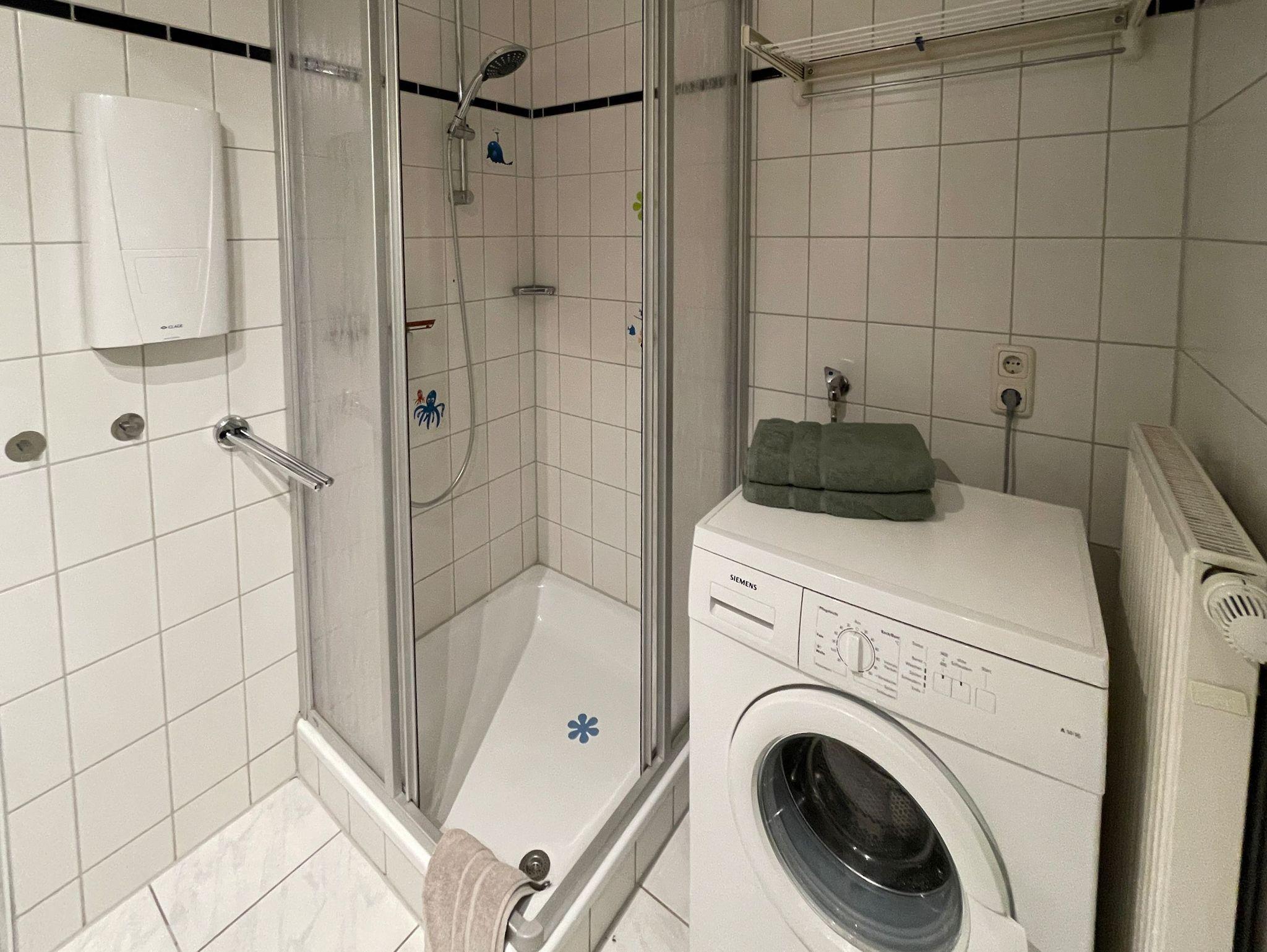 helles Bad mit Dusche (Föhn vorhanden) und mit Waschmaschine