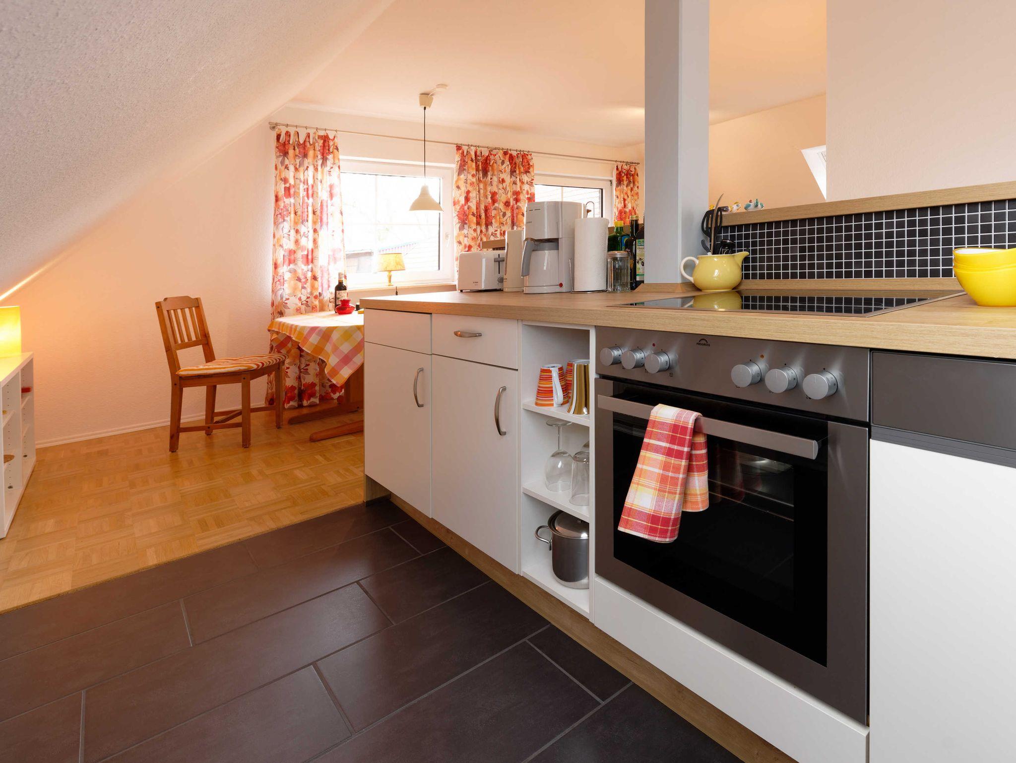 Zum Wohnbereich offene Küche (mit Spülmaschine), Duschbad (mit Fön) mit Tageslicht.