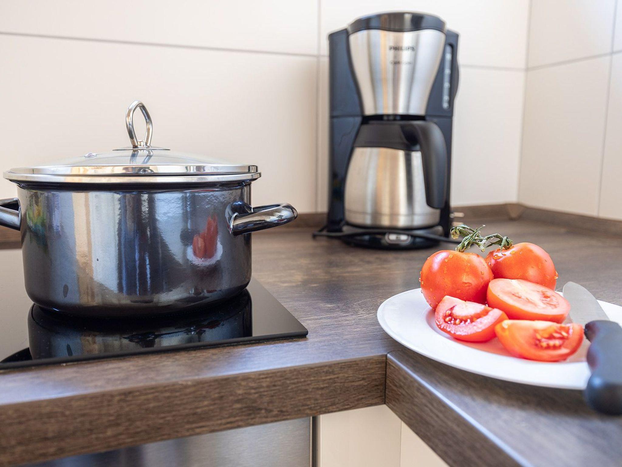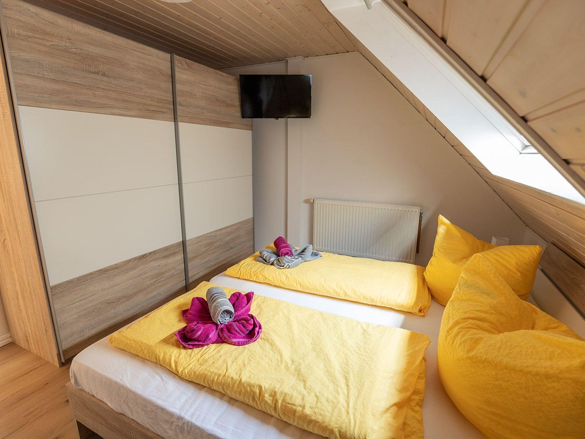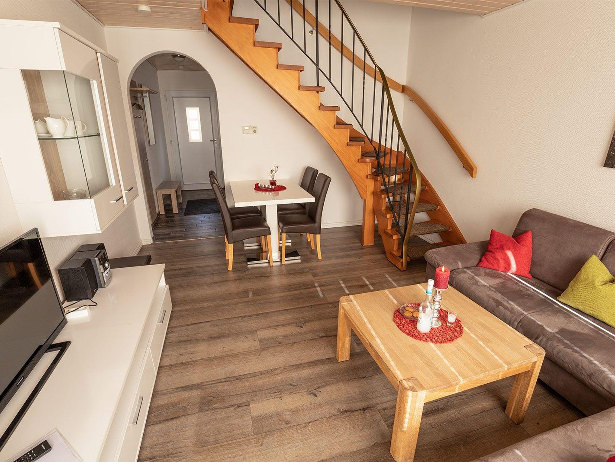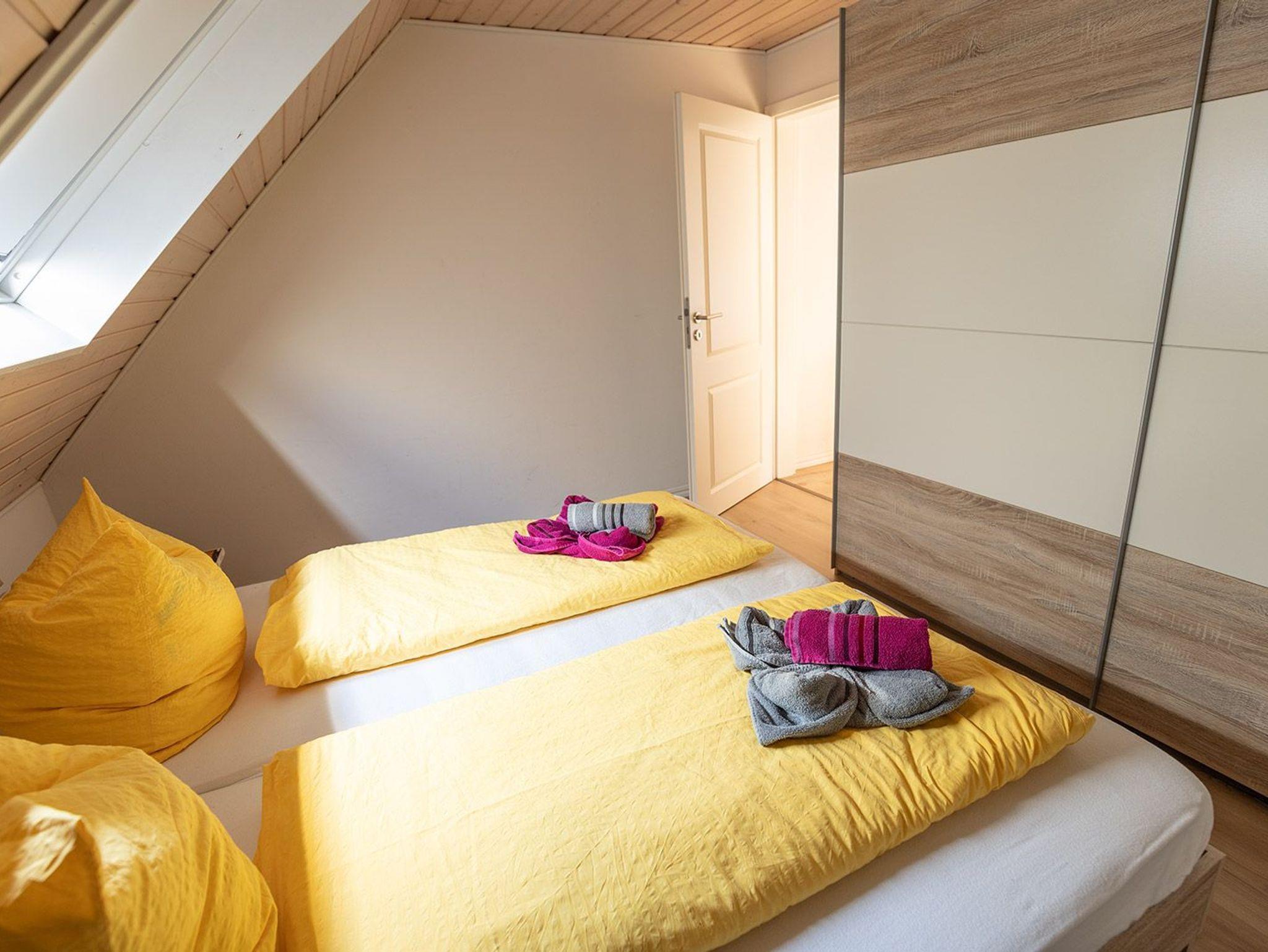 Im freundlichen Flurbereich befindet sich der Eingang zur separaten Küche mit kompletter Ausstattung für ein entspanntes Kochen. Nebenan der Hauswirtschaftsraum mit Trockner und Waschmaschine. Weiter geht es zum hellen Wohn-/Essbereich mit Ausgang zur begrünten Terrasse mit Mobiliar und Sonnenschirm. Im Wohnbereich mit Flachbild-SAT-TV können Sie auf der bequemen Ledereckcouch herrlich entspannen. Im ersten OG befinden sich die beiden Schlafräume mit einem Doppelbett und zwei Einzelbetten sowie das moderne Duschbad. Im Doppelschlafraum bieten wir einen weiteren Fernseher.