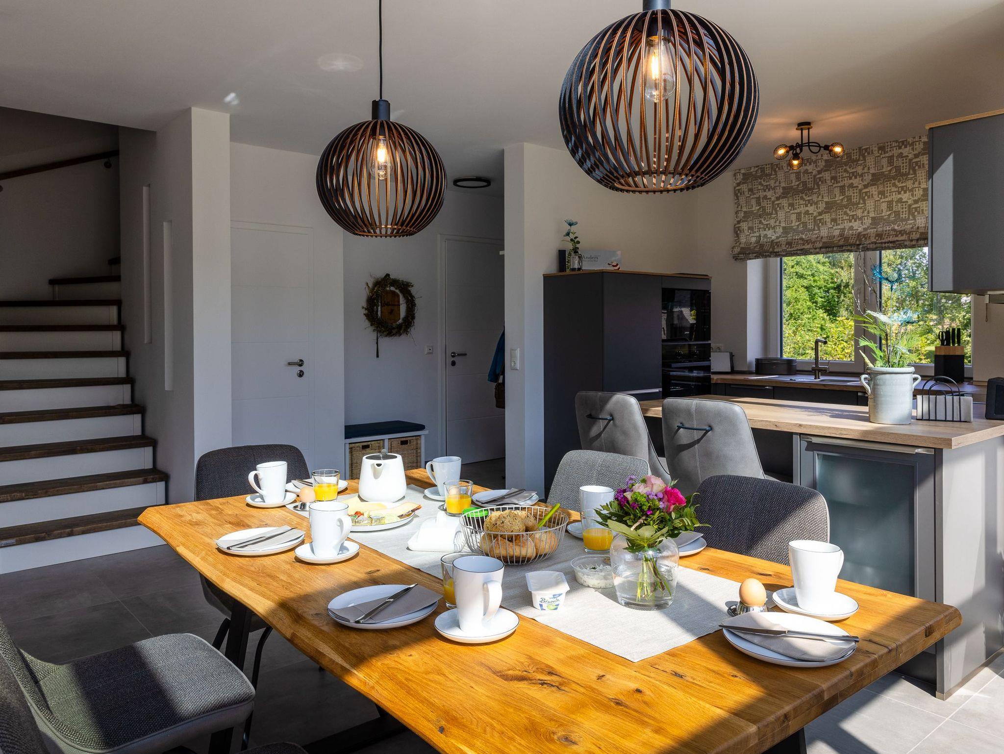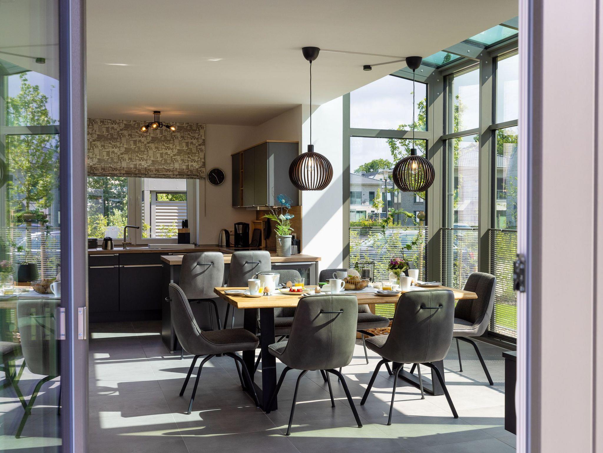 Ein Highlight dieses Ferienhauses ist zweifellos der atemberaubende Ausblick, den Sie von verschiedenen Räumen genießen können. Der helle Wohn- und Essbereich wird im Erdgeschoss durch einen Wintergarten ergänzt, der für eine lichtdurchflutete Atmosphäre sorgt und Ihnen das Gefühl gibt, mitten in der Natur zu sein.