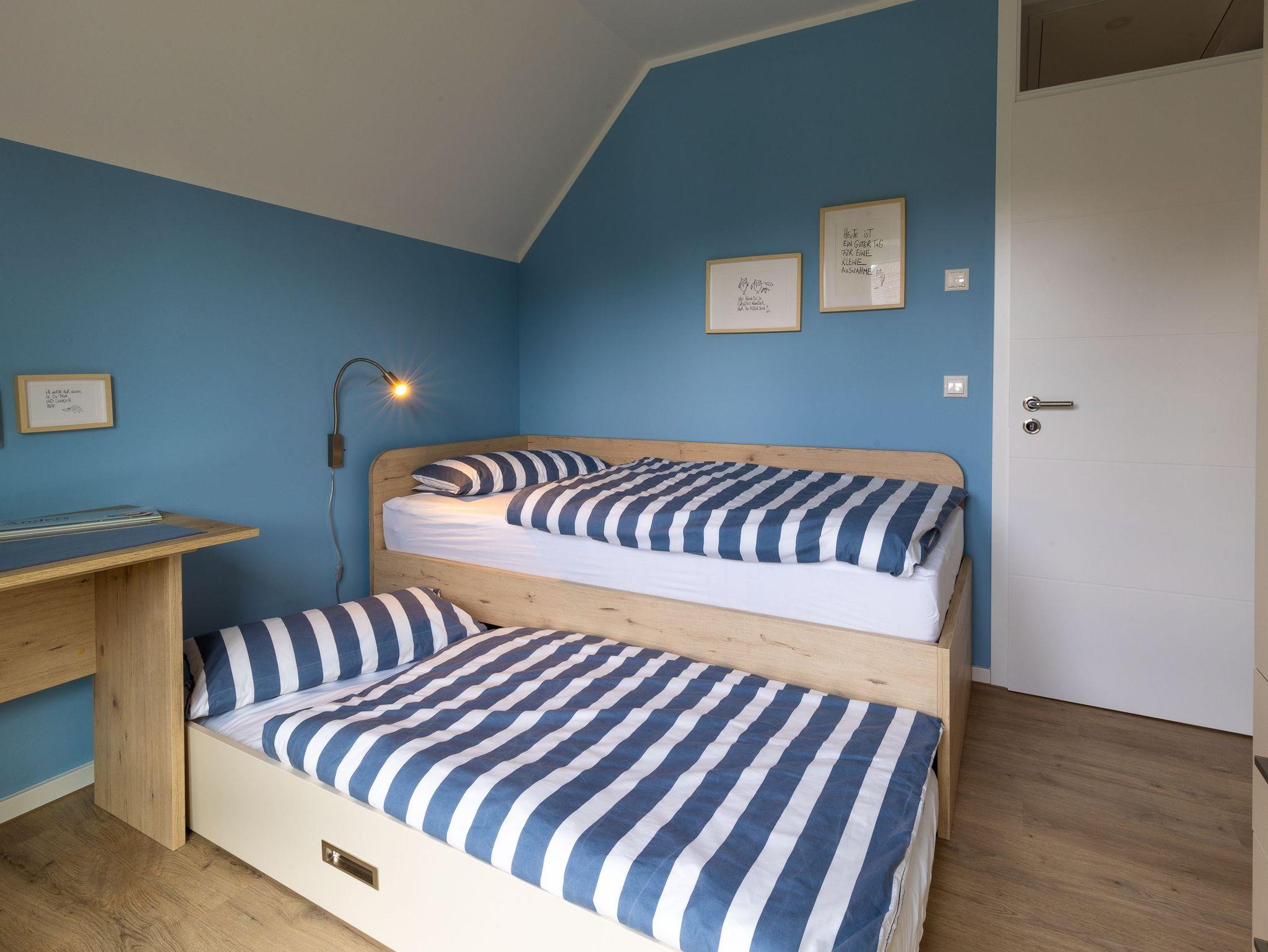 Der Neubau bietet Platz für bis zu 6 Personen und verfügt über 3 gemütliche Schlafzimmer im Obergeschoss, in denen Sie nach einem ereignisreichen Tag zu Ruhe kommen können. Zwei Schlafzimmer verfügen über je ein 1,80m breites Doppelbett sowie je einen Fernseher, das dritte Schlafzimmer ist als mögliches Kinderzimmer mit einem ausziehbaren Bett ausgestattet.