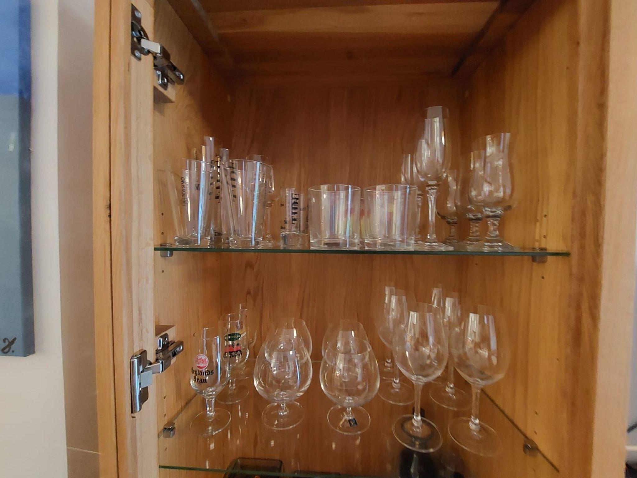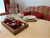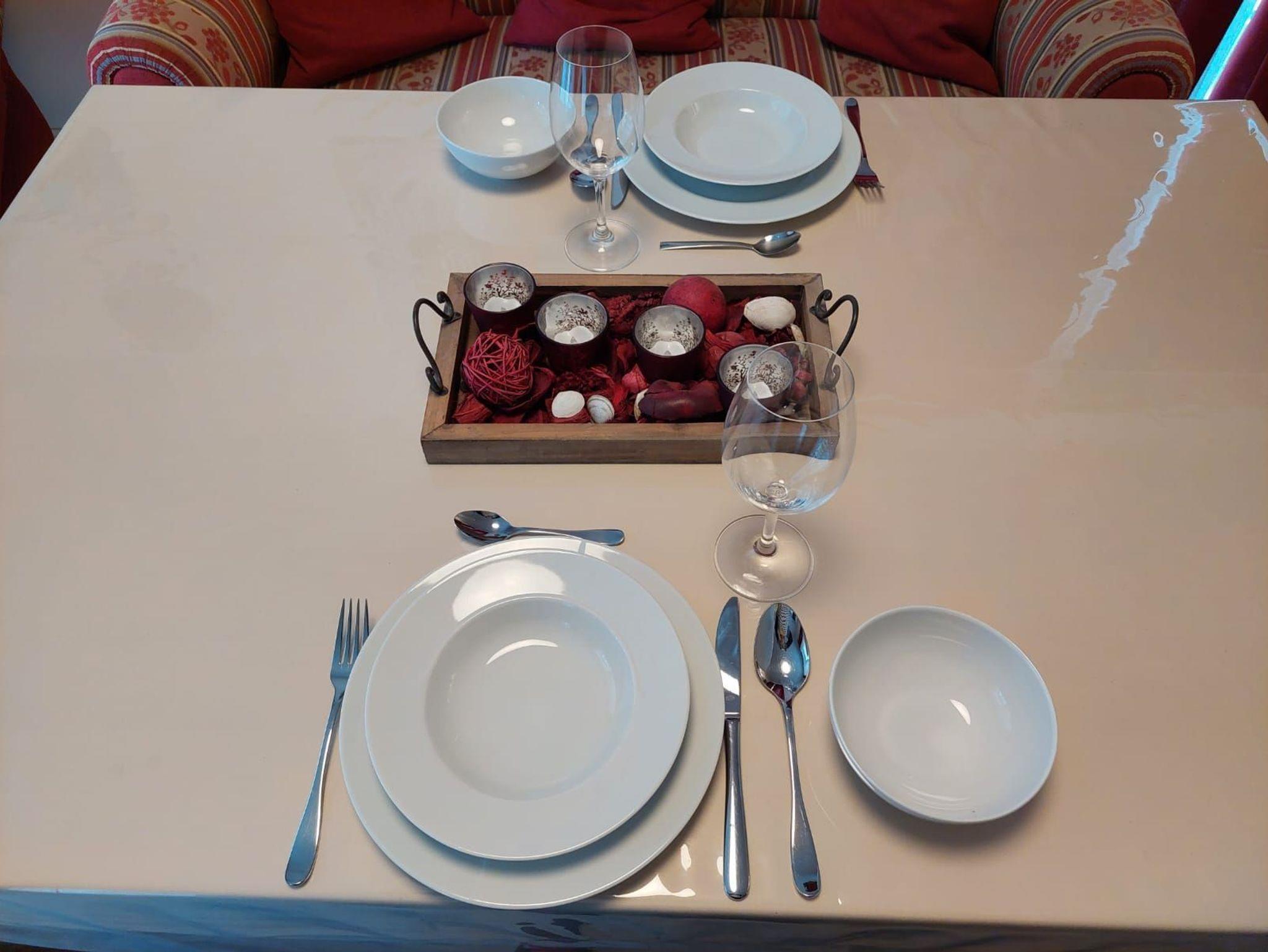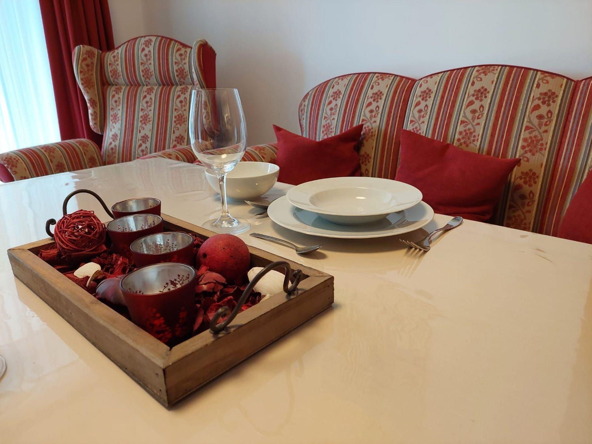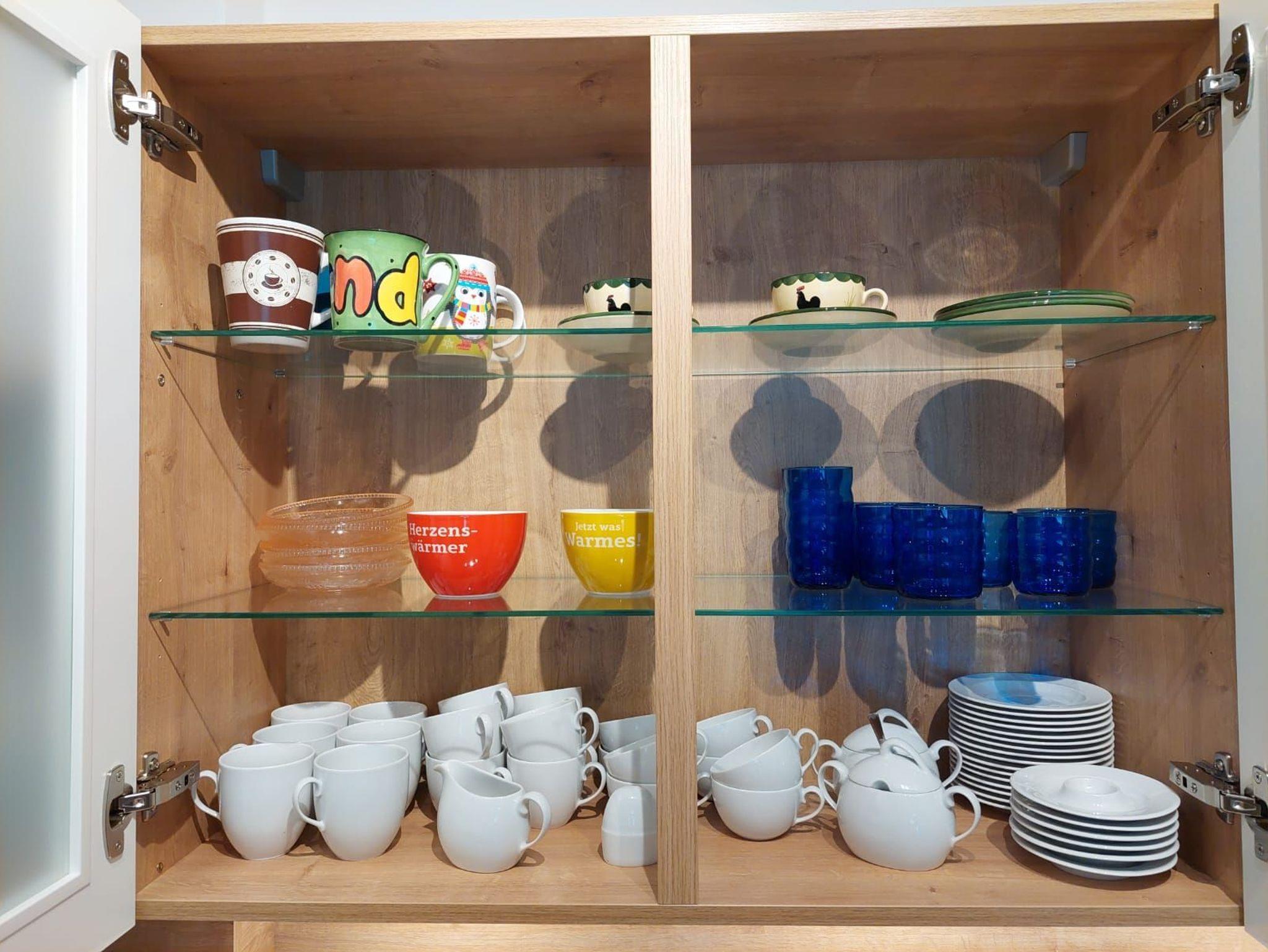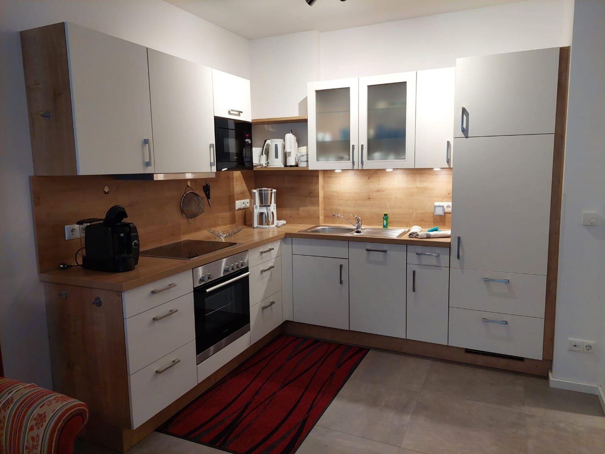 Über den kleinen Flur mit praktischer Garderobe gelangt man in das große Wohnzimmer mit der vollausgestatteten Küche. Schränke, der große Tisch und die Stühle sind aus Vollholz und schaffen eine angenehme Atmosphäre.