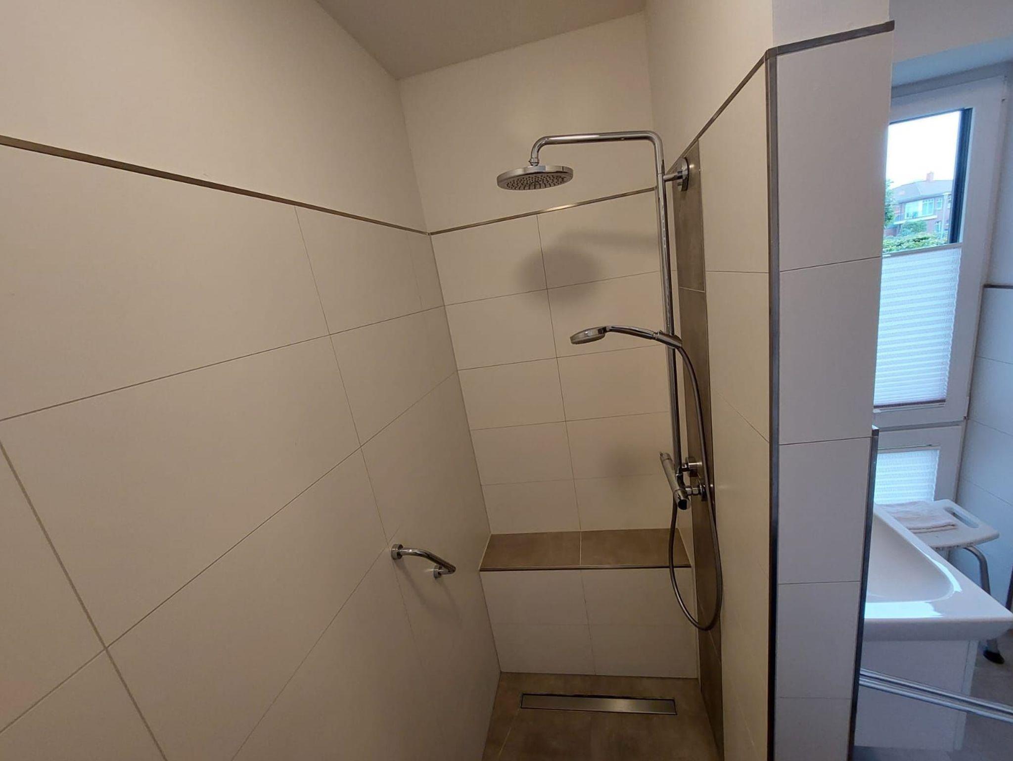 Die Sommerregendusche ist ebenerdig und barrierefrei. Sie verfügt neben der Ablagefläche über einen zusätzlichen Haltegriff.