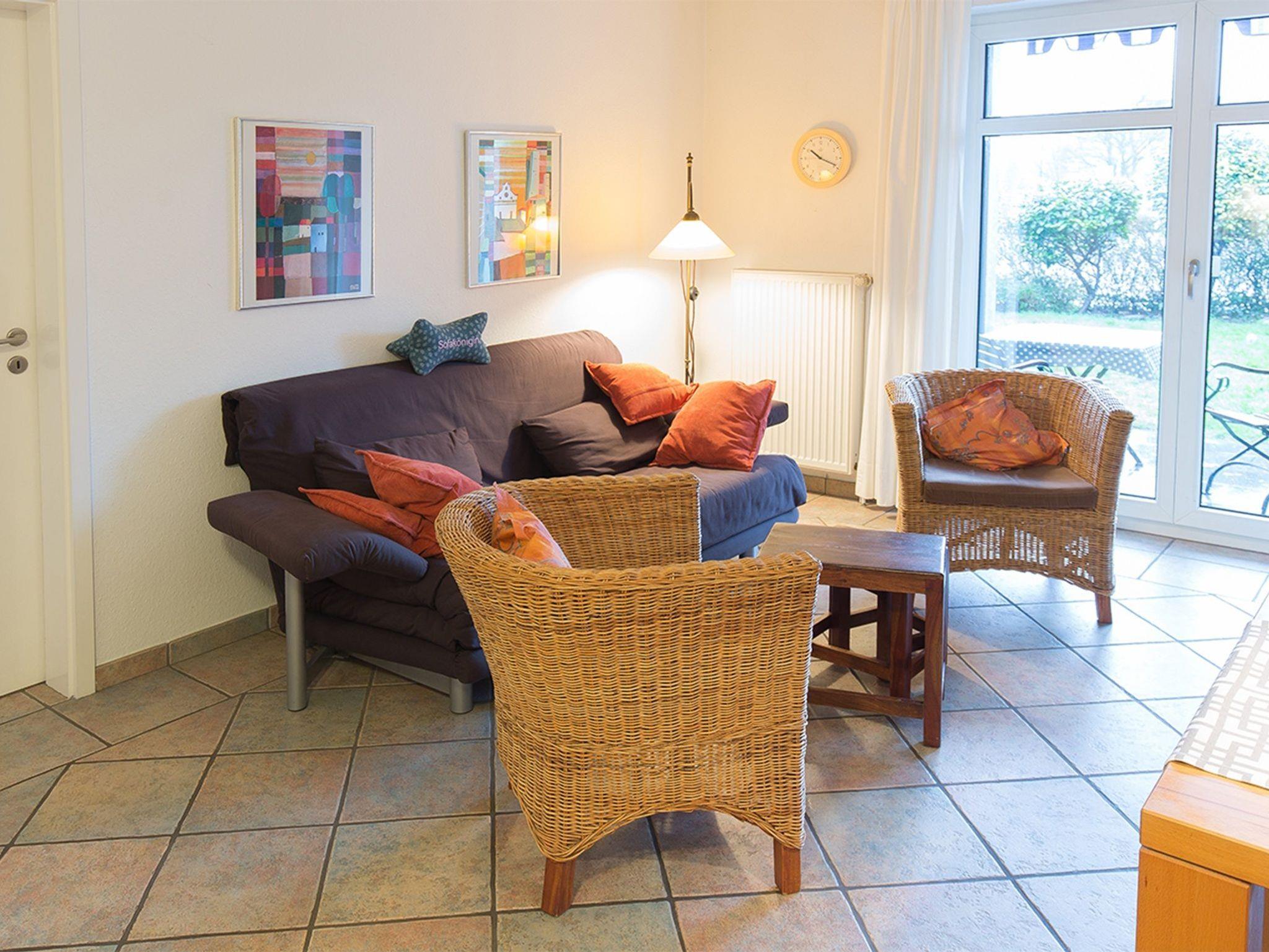 Sie betreten diese freundliche Erdgeschoss-Ferienwohnung durch eine geräumige Diele. Geradeaus gelegen das Fenster-Duschbad mit viel Platz und Stauraum sowie Waschmaschine und Trockner. Nach rechts bieten wir eine komfortable Küchenzeile im Landhausstil mit kompletter Grundausstattung. Geradeaus geht es in den mediterran sonnig gestalteten Wohn-/Essbereich mit Flachbild-TV und Ausgang zur Terrasse. Der Doppelschlafraum bietet ein bequemes Doppelbett mit genügend Kleiderschränken. Es gibt eine zusätzliche Schlafgelegenheit für zwei Personen auf dem ausziehbaren Sofa im Wohnzimmer. Entspannen Sie in der Ferienwohnung auf der geschützten Ostterrasse mit Garten zur Alleinnutzung. Direkt neben dem Haus befindet sich Ihr Fahrzeugstellplatz Nr. 2