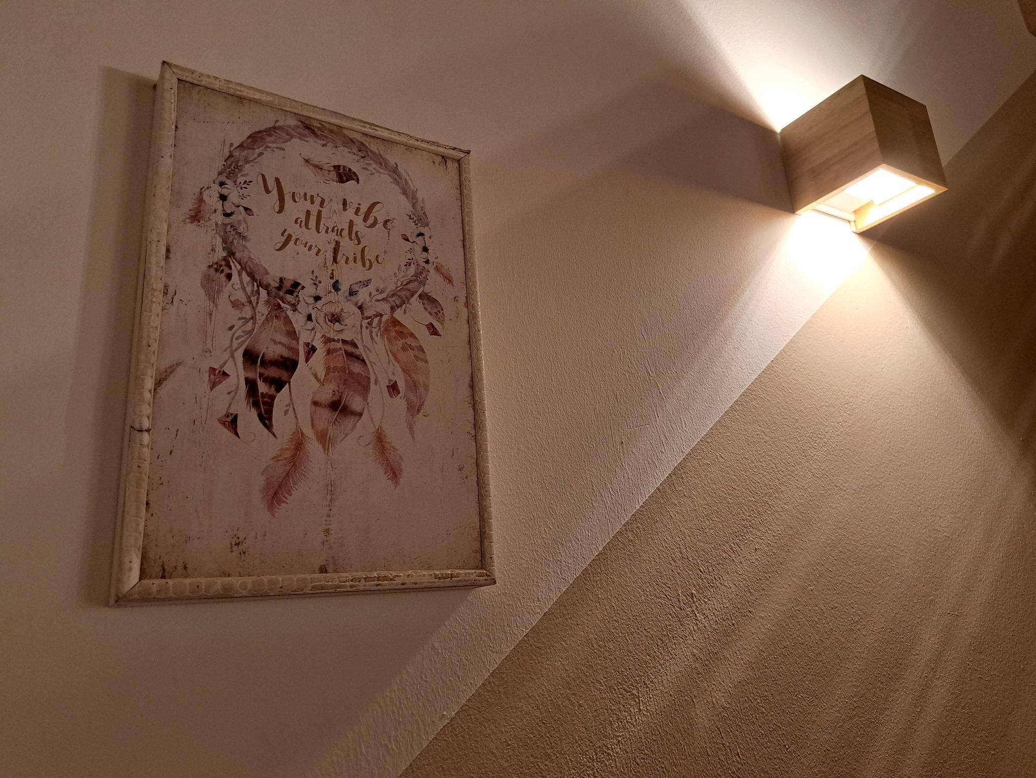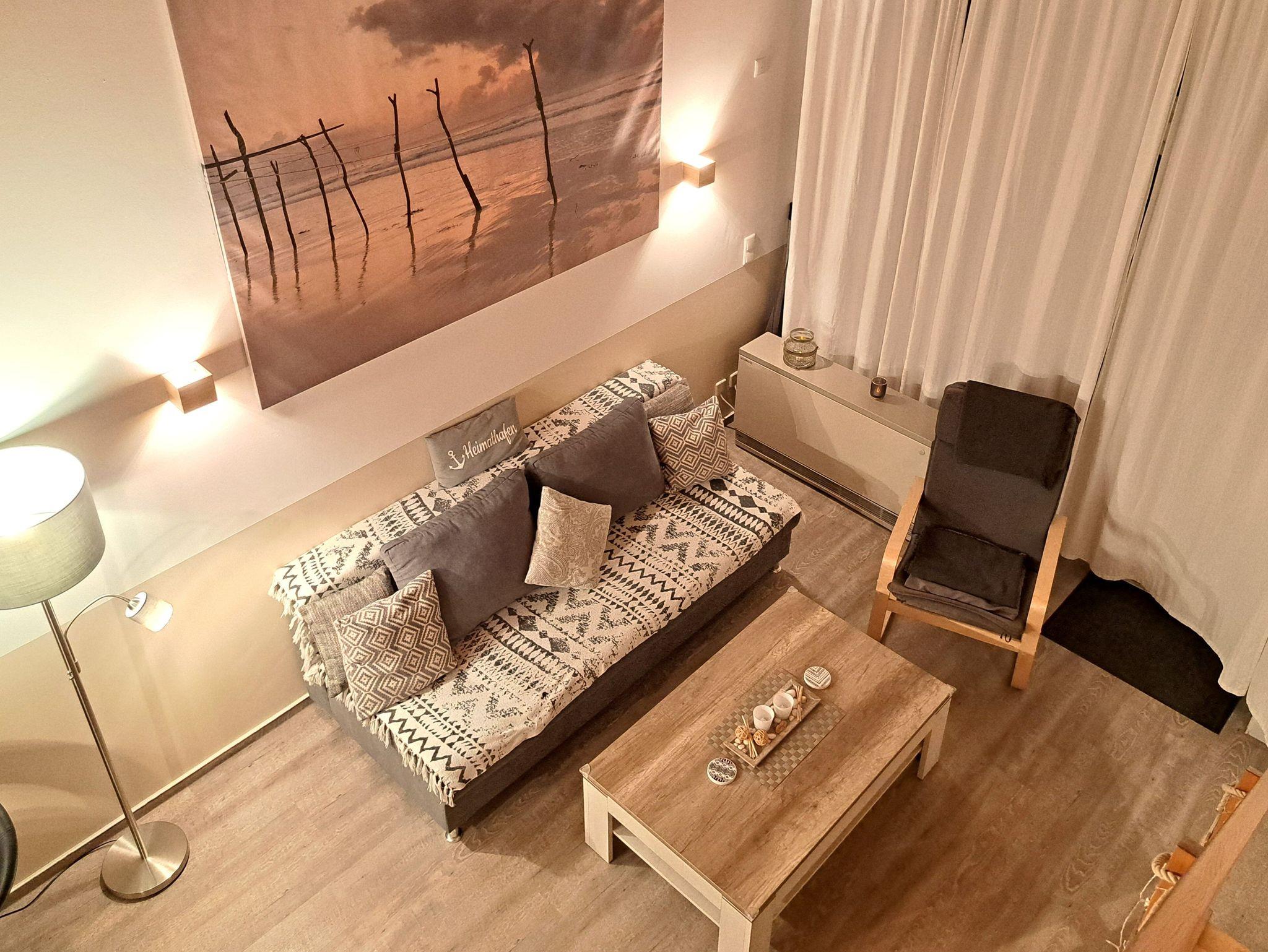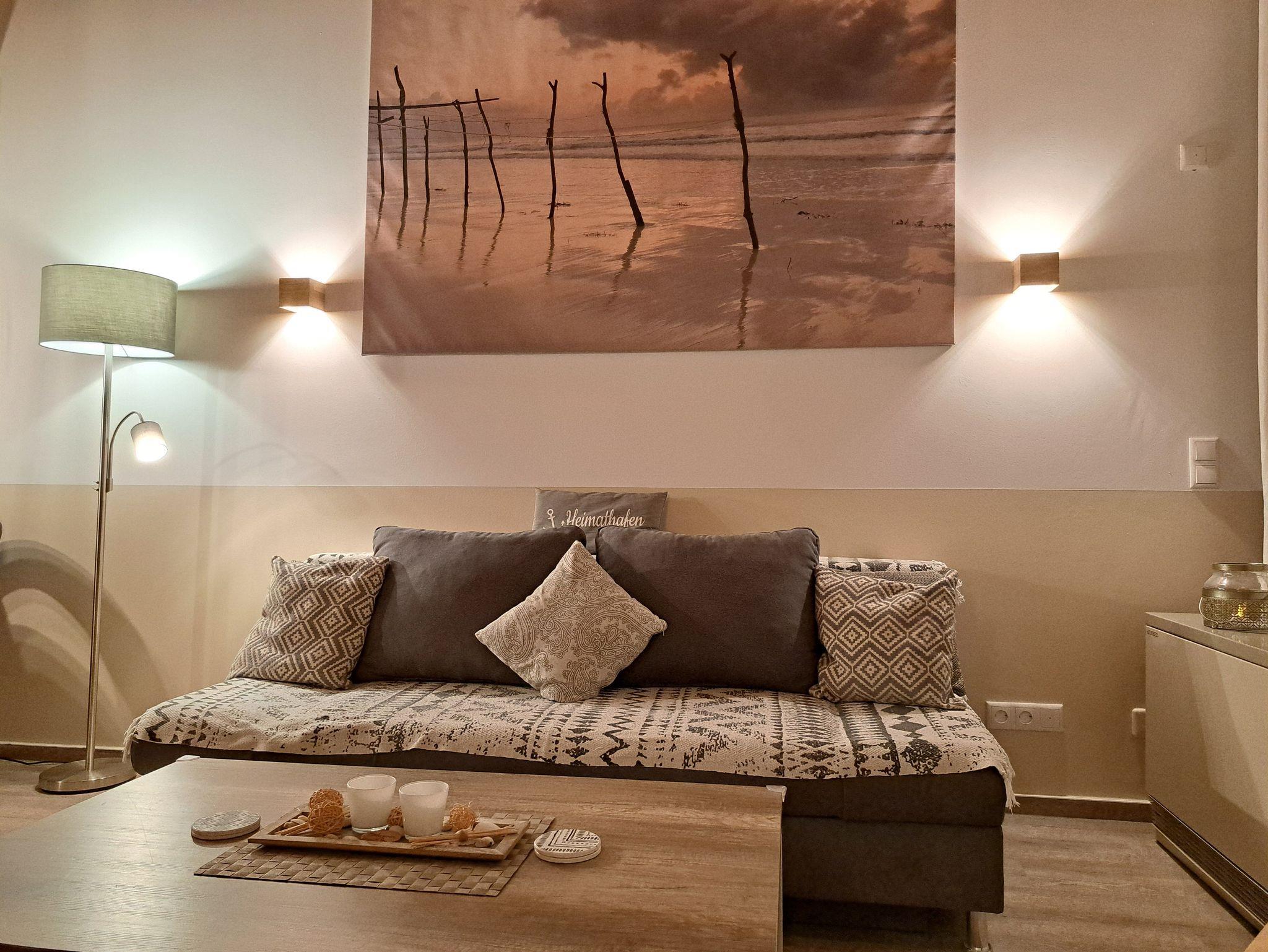 Die gemütliche Wohnung Meerträumerei verfügt über ein separates Schlafzimmer in einer Zwischenetage, ein Wohn- Esszimmer, ein Badezimmer und einen Balkon.