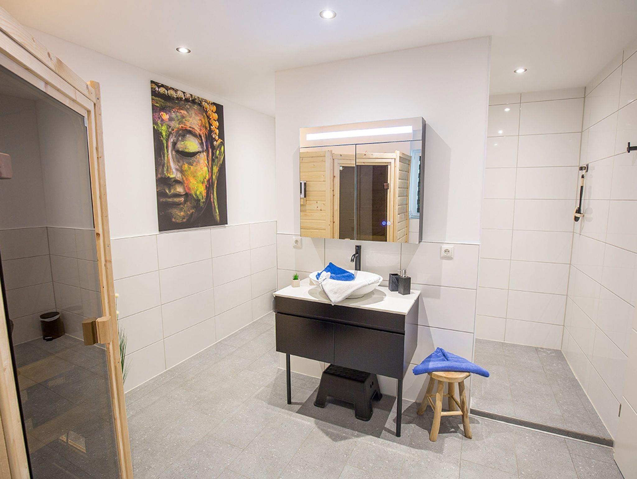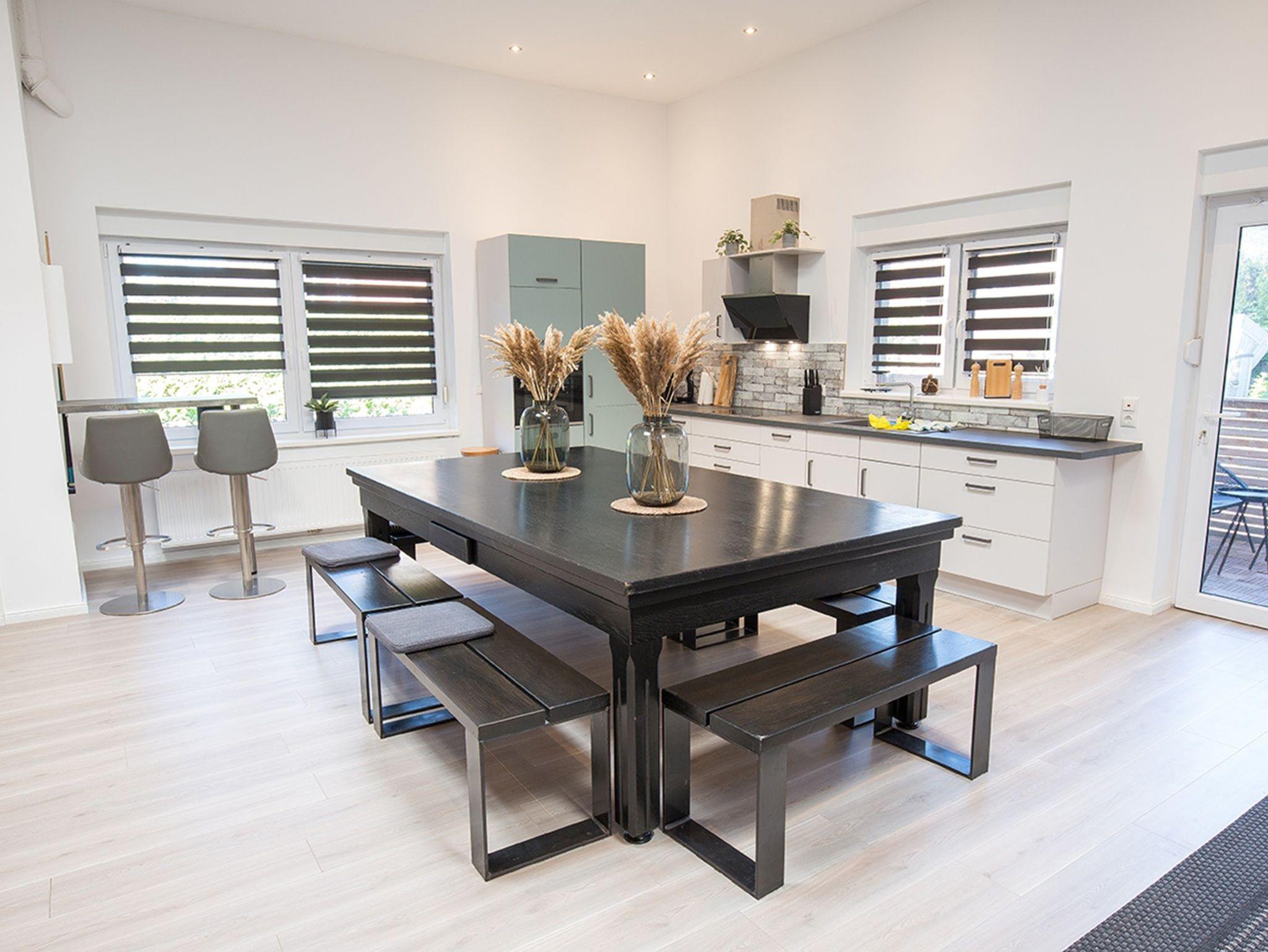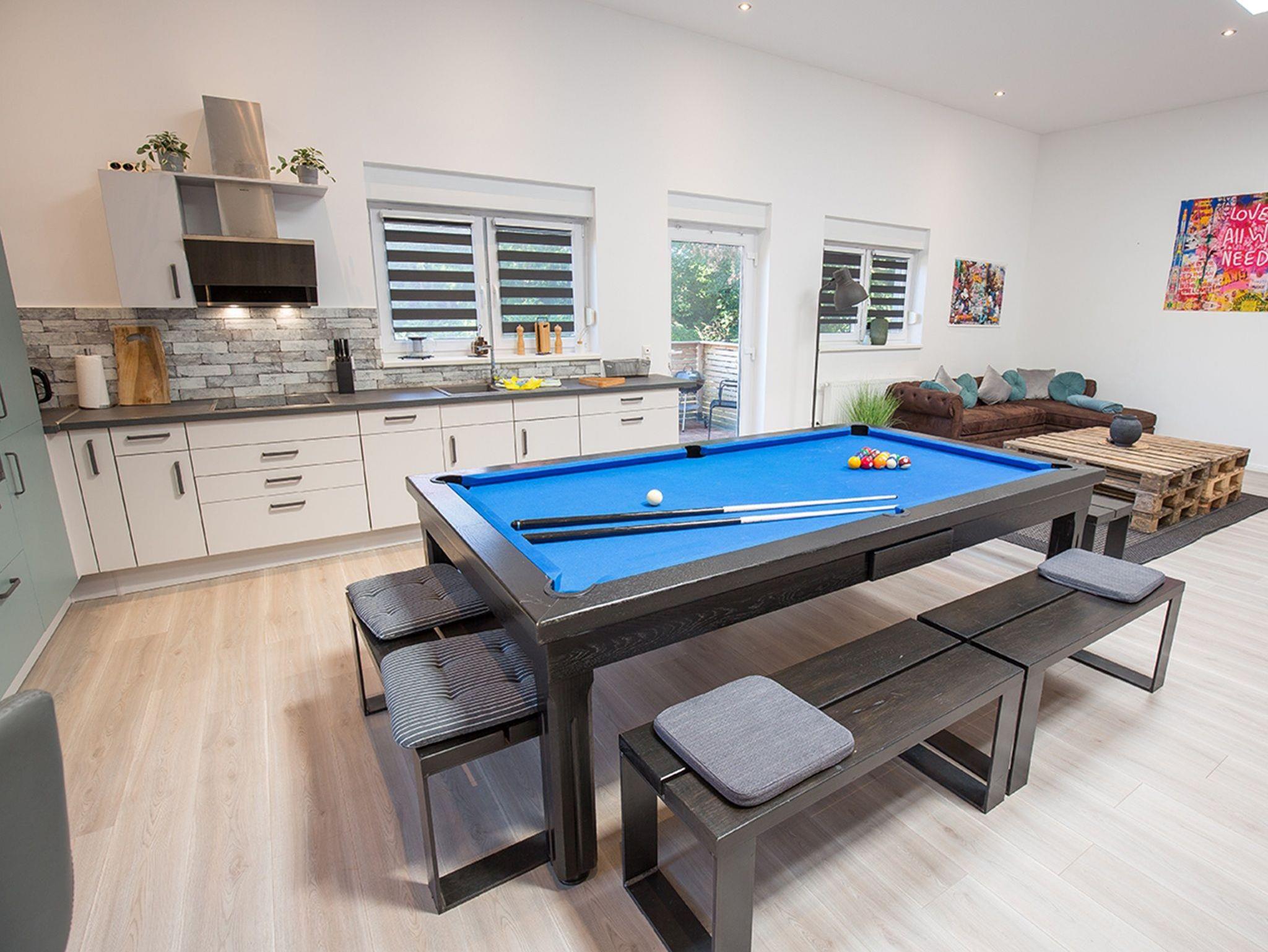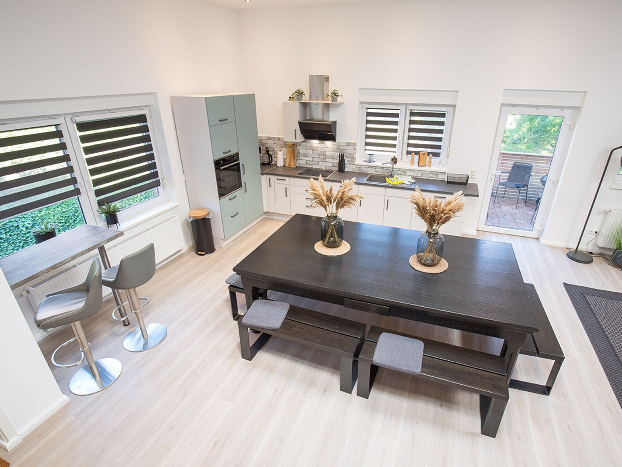 Herzlich Willkommen in unserer Ferienwohnung Jonte mit Loftcharakter - eigener Zugang sowie Balkon und Terrasse versprechen pure Erholung. Der komplette Innenbereich ist offen gehalten und vermittelt insgesamt ein tolles Raumgefühl. Er bietet alles auf modernstem Niveau. Beginnend mit der Garderobe geht es rechts herum zur schicken Küchenzeile mit großem vorgelagerten Essbereich. Der funktionale Esstisch lädt zu einer Partie Billard ein. Rechts befindet sich die gemütliche ausziehbare Couch. Das moderne Bad mit Walk-In-Regendusche und Flacheinstieg hat eine Sauna. Sodann geht es hoch auf die Schlafempore, welche offen und nicht abgesichert über eine Palettentreppe erreichbar ist - hier erwartet Sie ein bequemes Doppelbett mit Garderobennische und einem weiterem TV-Gerät. Die Couch im Wohnbereich ist ausziehbar und bietet mit einer Liegefläche von 120x200 Platz für einen dritten Gast.
