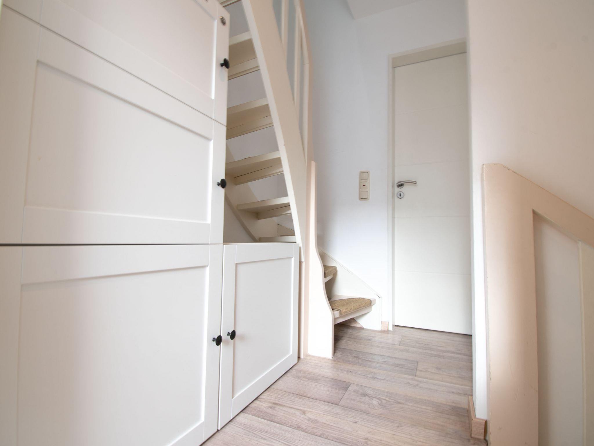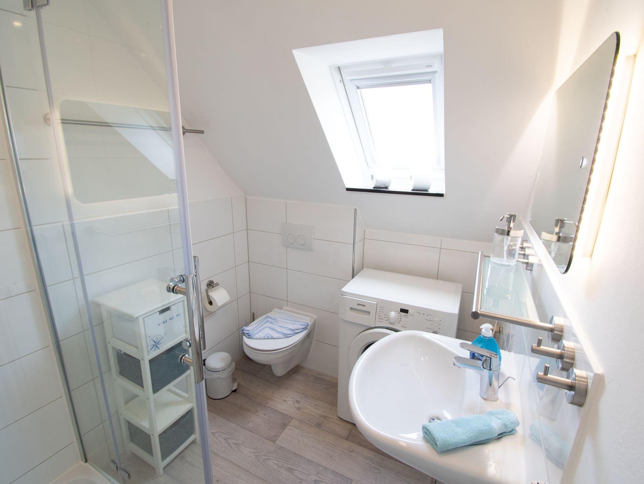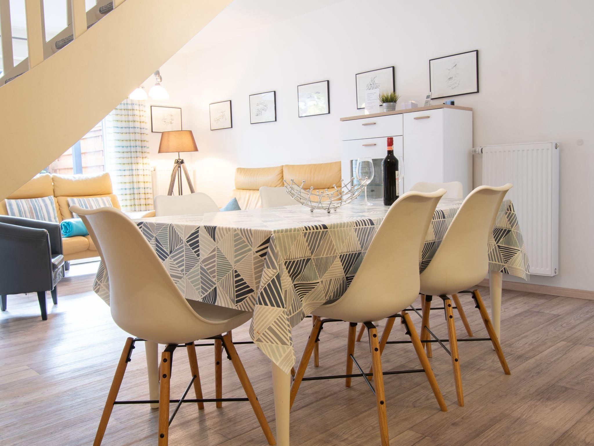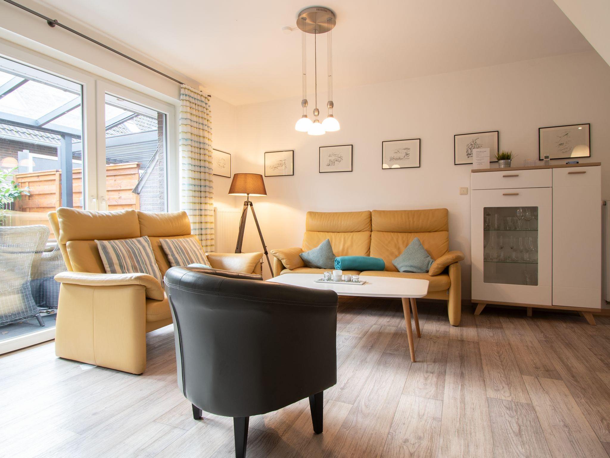 Im Dielenbereich befindet sich das Gäste-WC. Die gemütlich eingerichtete Küche im Wohnbereich bietet genügend Platz zum Klönen und Kochen und hat alles, um den Urlaub genießen zu können. Vom geräumigen Wohnzimmer haben Sie die Möglichkeit, auf der sichtgeschützten möblierten Terrasse zu entspannen. Im 1. Obergeschoss befindet sich ein Schlafzimmer mit Doppelbett und zusätzlichem Fernseher, ein modern renoviertes Tageslichtbad mit Waschmaschine sowie ein zweites Schlafzimmer mit zwei Einzelbetten.