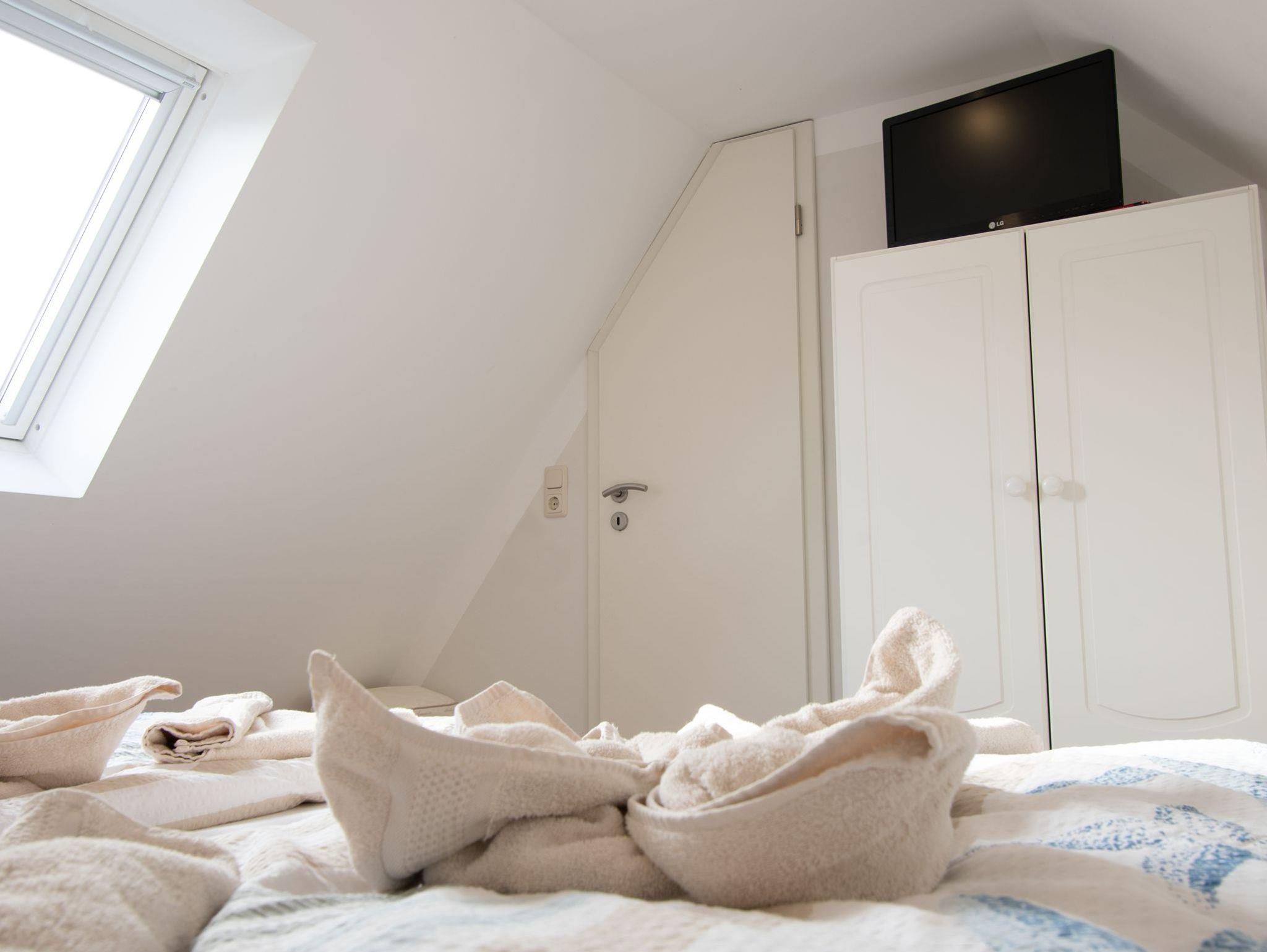 Ein weiteres geräumiges Schlafzimmer mit zwei Einzelbetten liegt im Dachgeschoss. Jedes Schlafzimmer hat ein eigenes TV-Gerät.