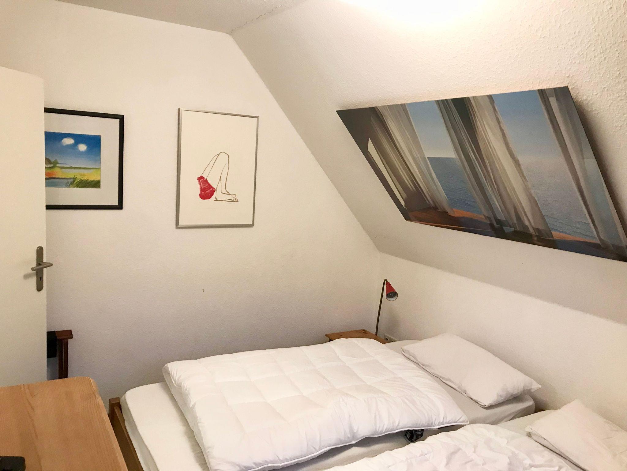 Unsere Ferienwohnung ist im Obergeschoss. Sie ist nach Süden ausgerichtet und immer hell. Es gibt einen großen Wohnraum mit gemütlicher Sitzecke, Essecke und Küchenzeile. Der Wohnraum führt auf den schönen, großen Sonnenbalkon. Auf gleicher Ebene finden Sie ein Schlafzimmer (2 Betten), Toilette und Eingangsflur. Eine Treppe höher finden Sie ein weiteres Schlafzimmer (Kinderzimmer) mit einem Etagenbett und einem Kinderbett. Gleich daneben ist die Dusche mit WC.