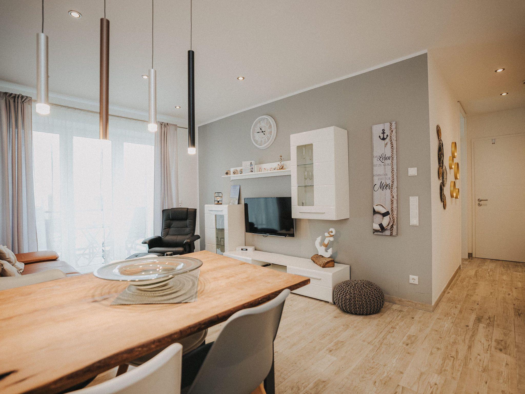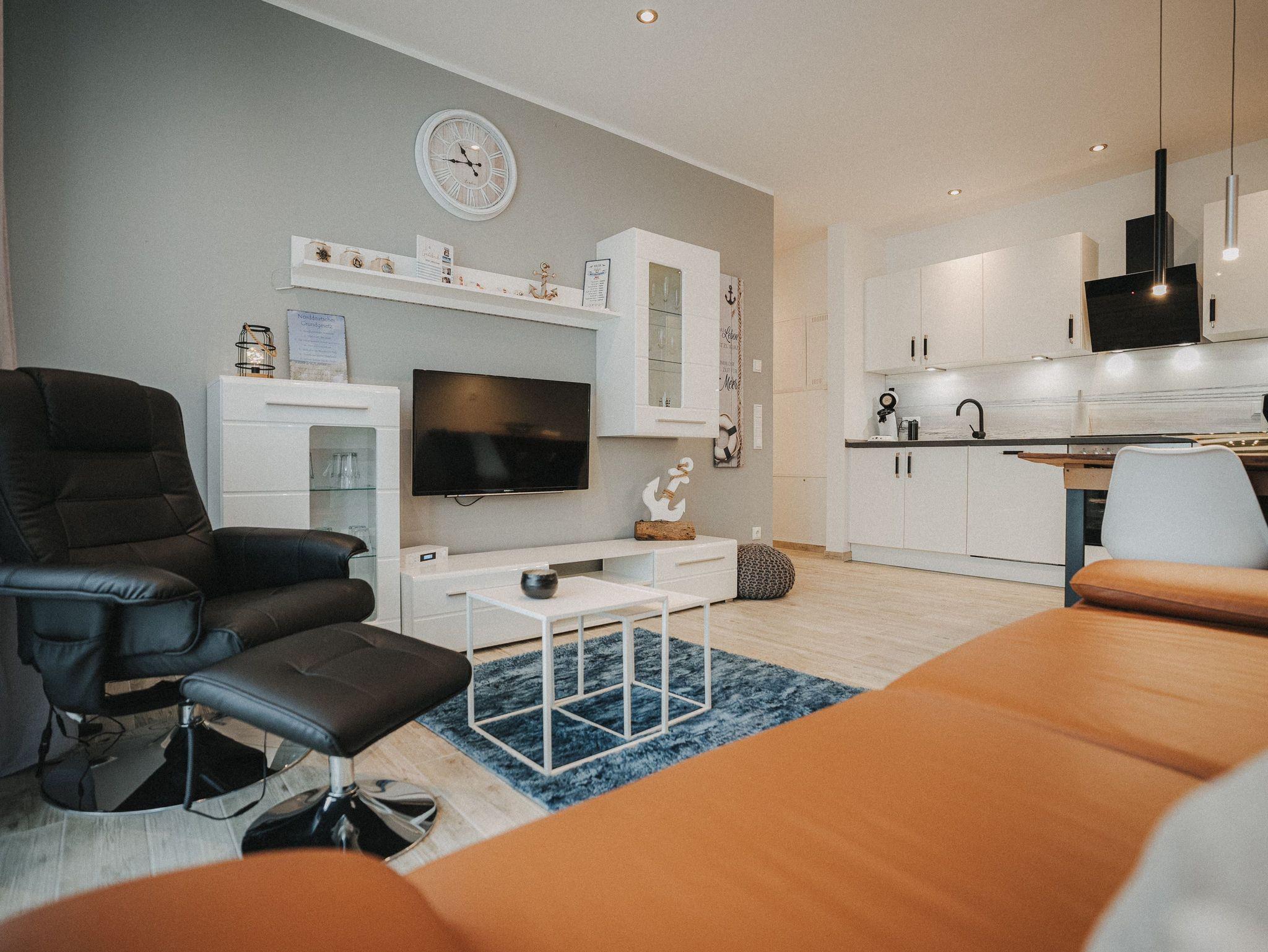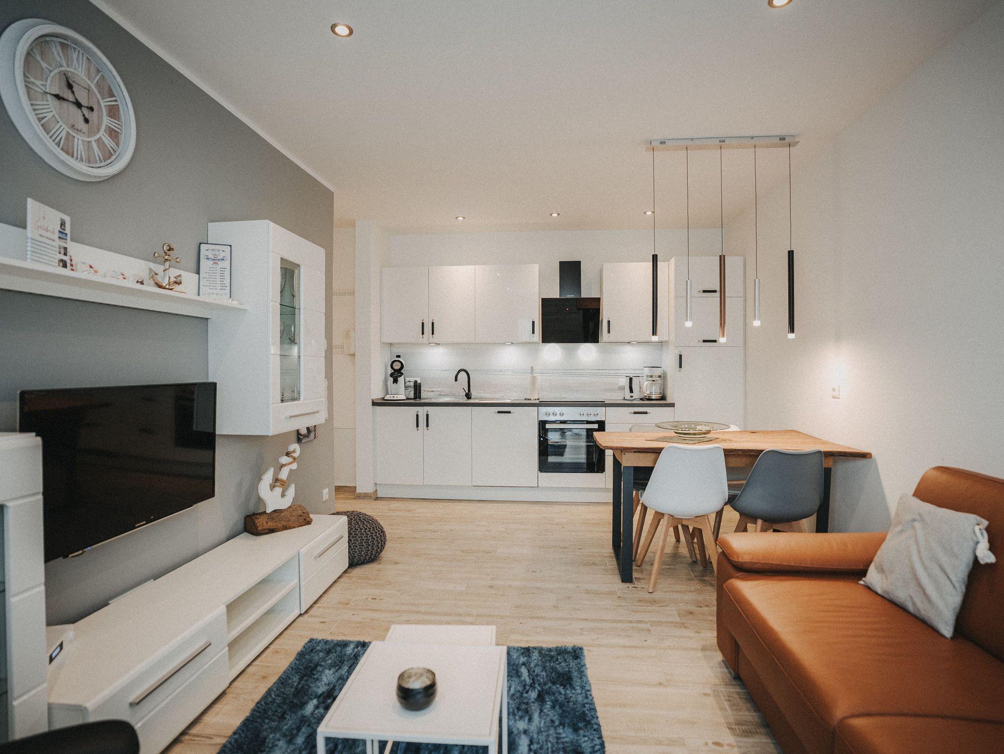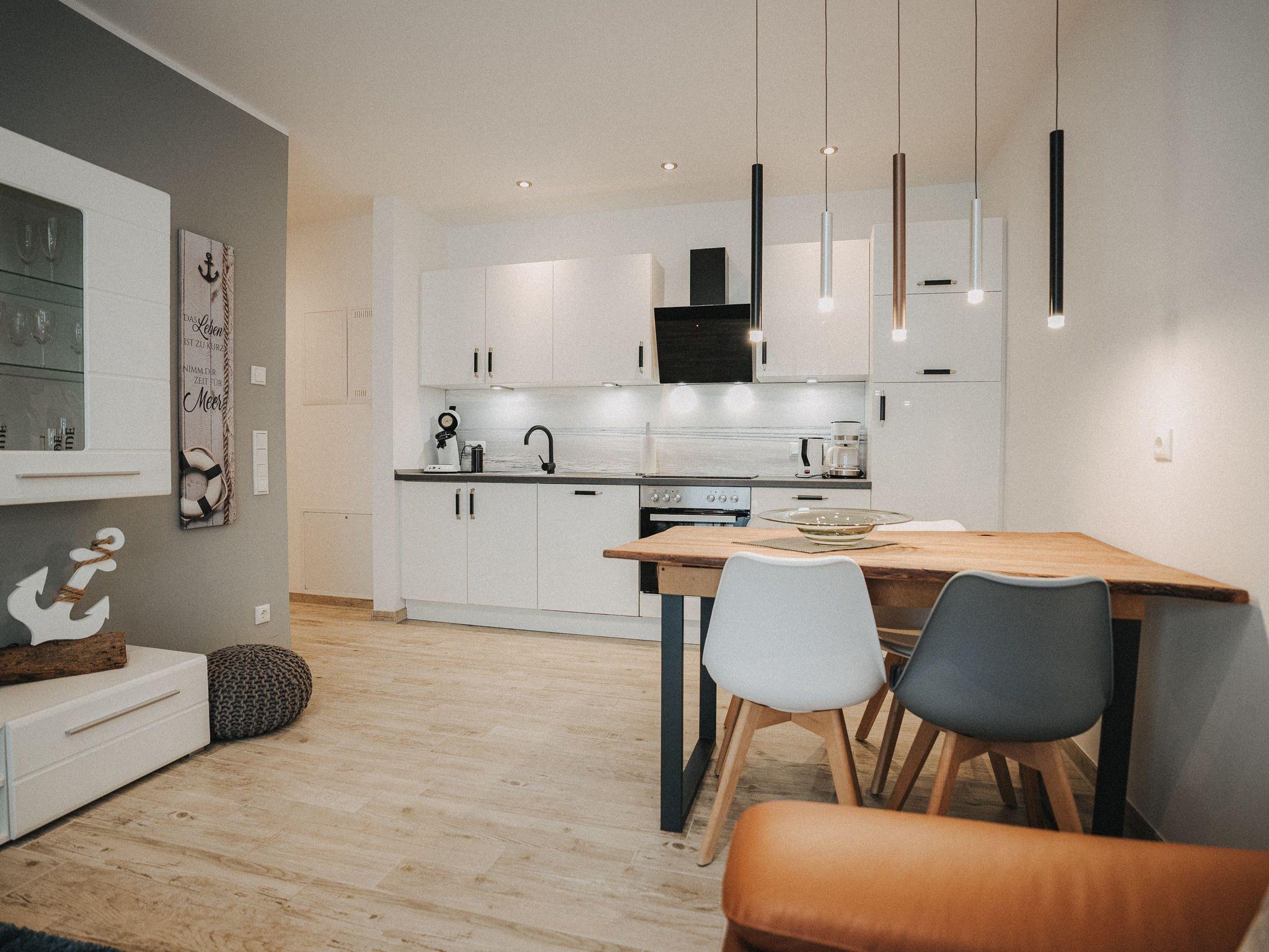 Unsere schicke Ferienwohnung Friedas Friesentraum heißt Sie herzlich willkommen: Es empfängt Sie ein heller Eingangsbereich mit Flur und Garderobe. Stärken Sie sich in der voll ausgestatteten Küchenzeile mit Esstisch in Naturholzoptik - Entspannen Sie im maritim gestalteten Wohnbereich mit großem Flat-TV auf der Ledercouch - Ziehen Sie sich zurück ins Schlafzimmer mit Doppelbett - Konsolen wandhängend - , Kleiderschrank und zusätzlichem Flat-TV. Von hier aus gelangen Sie ins schicke komfortable Duschbad mit Flacheinstieg und Sommerregendusche - Rasten und entspannen Sie auf dem überdachten Balkon mit Mobiliar - Es steht Ihnen ebenfalls ein geräumiger Abstellraum zur Verfügung. Hier befinden sich Waschmaschine und Trockner.