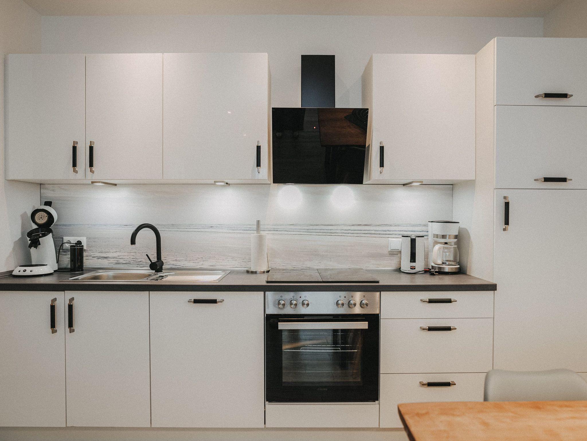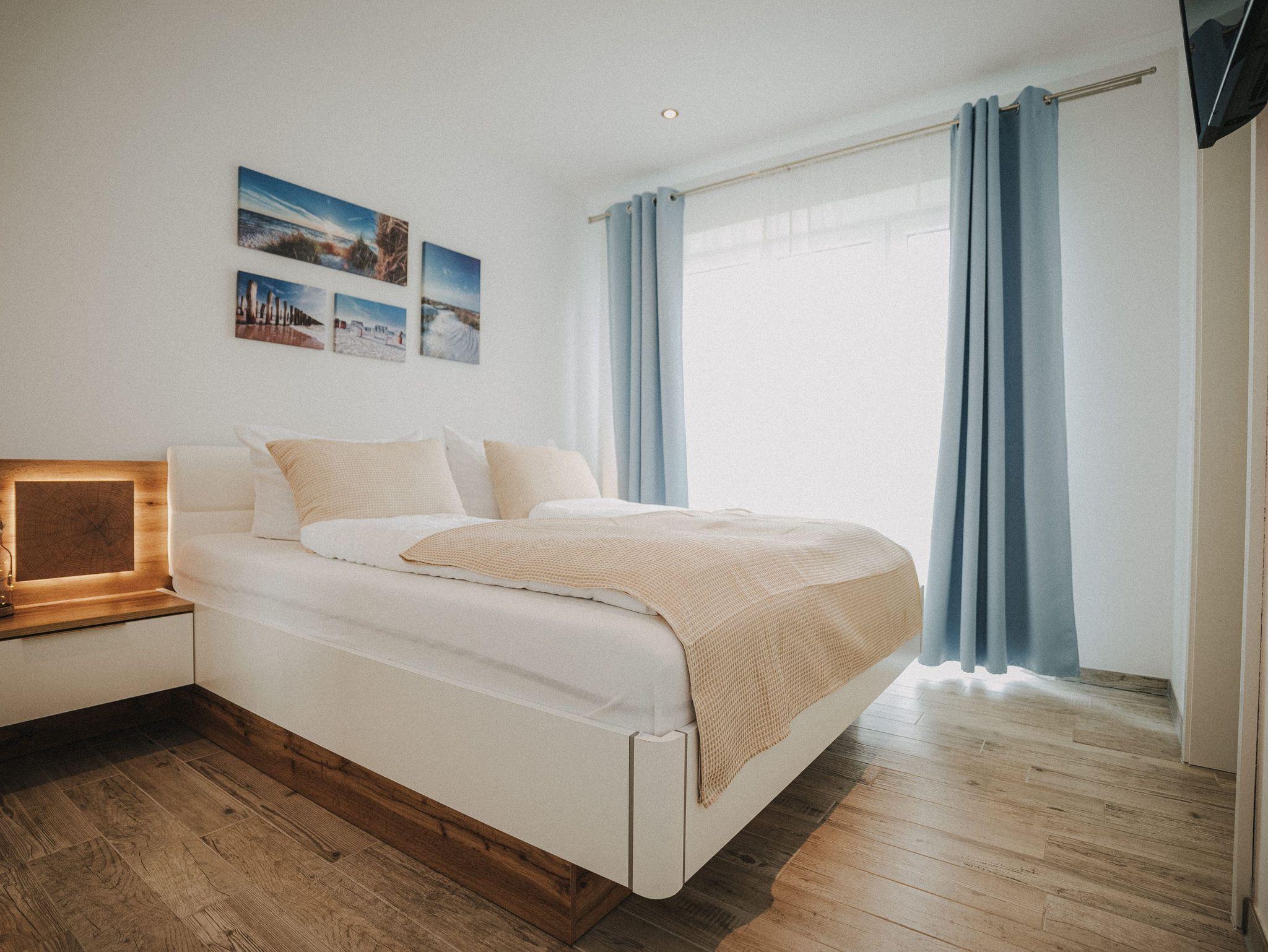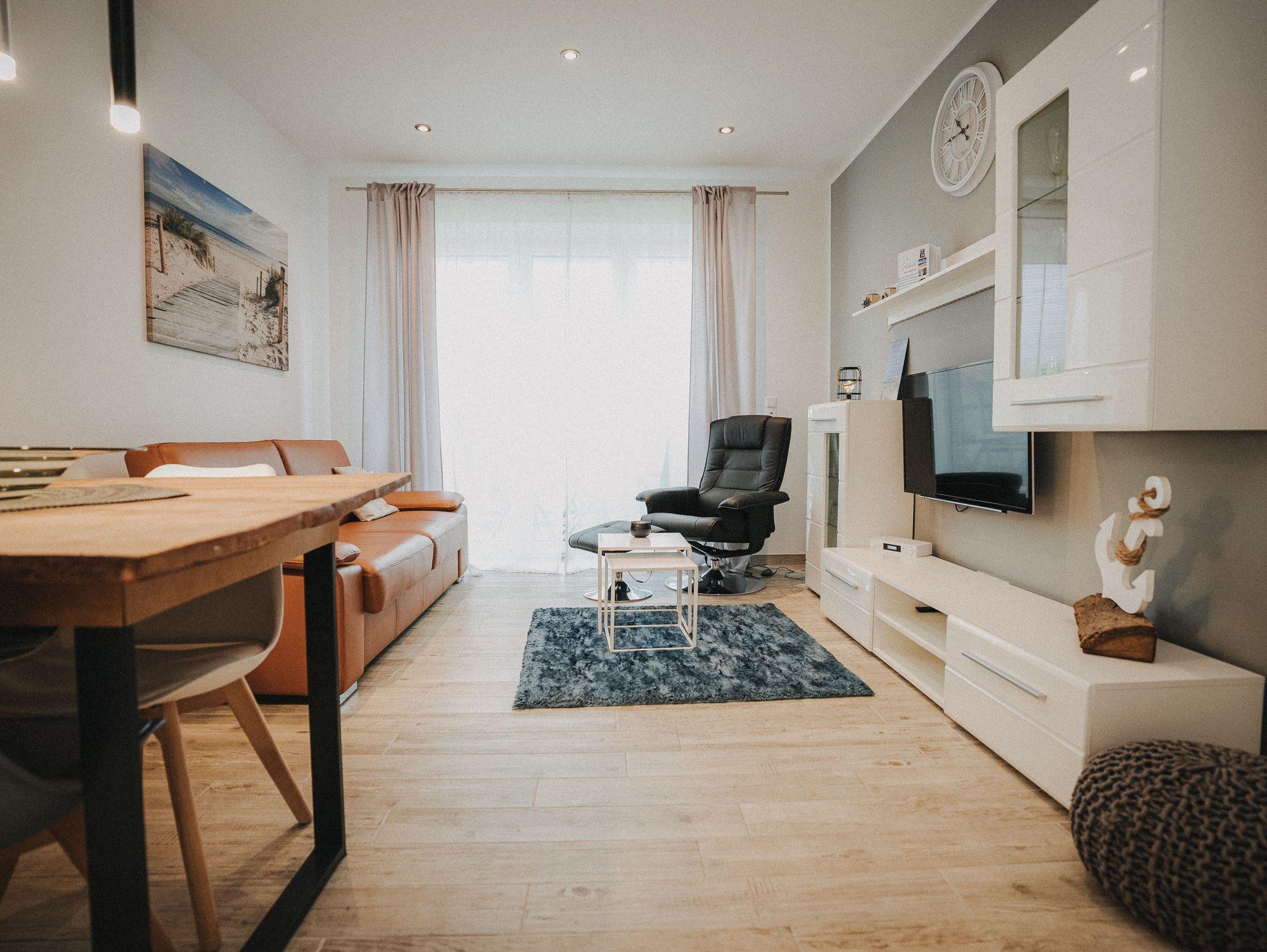 Unsere schicke Ferienwohnung Friedas Friesentraum heißt Sie herzlich willkommen: Es empfängt Sie ein heller Eingangsbereich mit Flur und Garderobe. Stärken Sie sich in der voll ausgestatteten Küchenzeile mit Esstisch in Naturholzoptik - Entspannen Sie im maritim gestalteten Wohnbereich mit großem Flat-TV auf der Ledercouch - Ziehen Sie sich zurück ins Schlafzimmer mit Doppelbett - Konsolen wandhängend - , Kleiderschrank und zusätzlichem Flat-TV. Von hier aus gelangen Sie ins schicke komfortable Duschbad mit Flacheinstieg und Sommerregendusche - Rasten und entspannen Sie auf dem überdachten Balkon mit Mobiliar - Es steht Ihnen ebenfalls ein geräumiger Abstellraum zur Verfügung. Hier befinden sich Waschmaschine und Trockner.