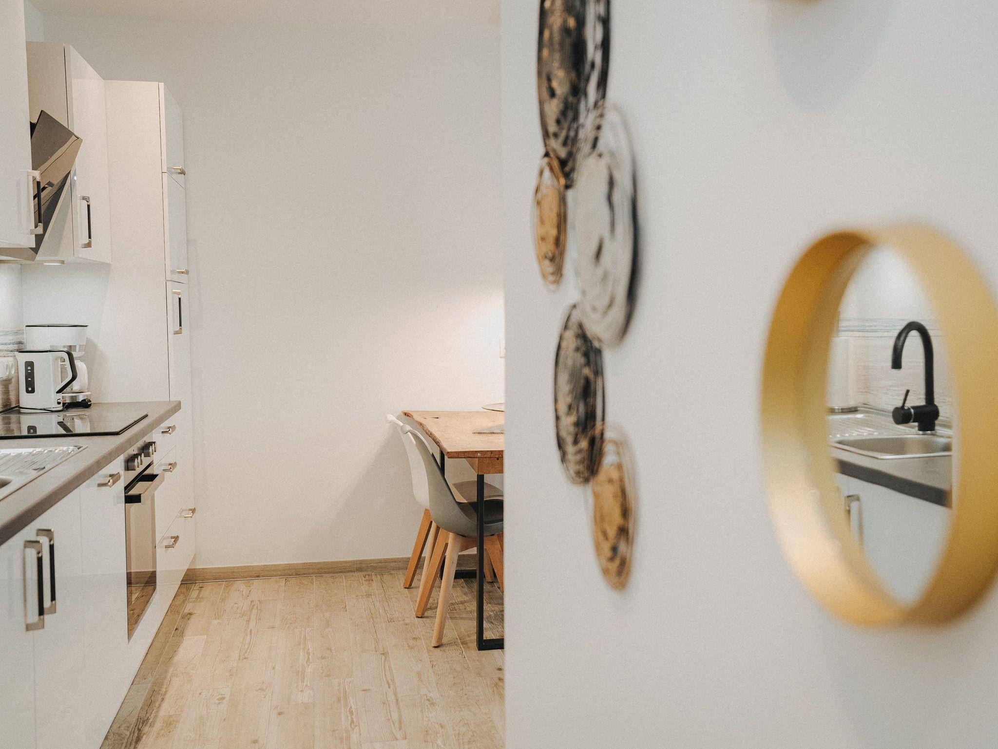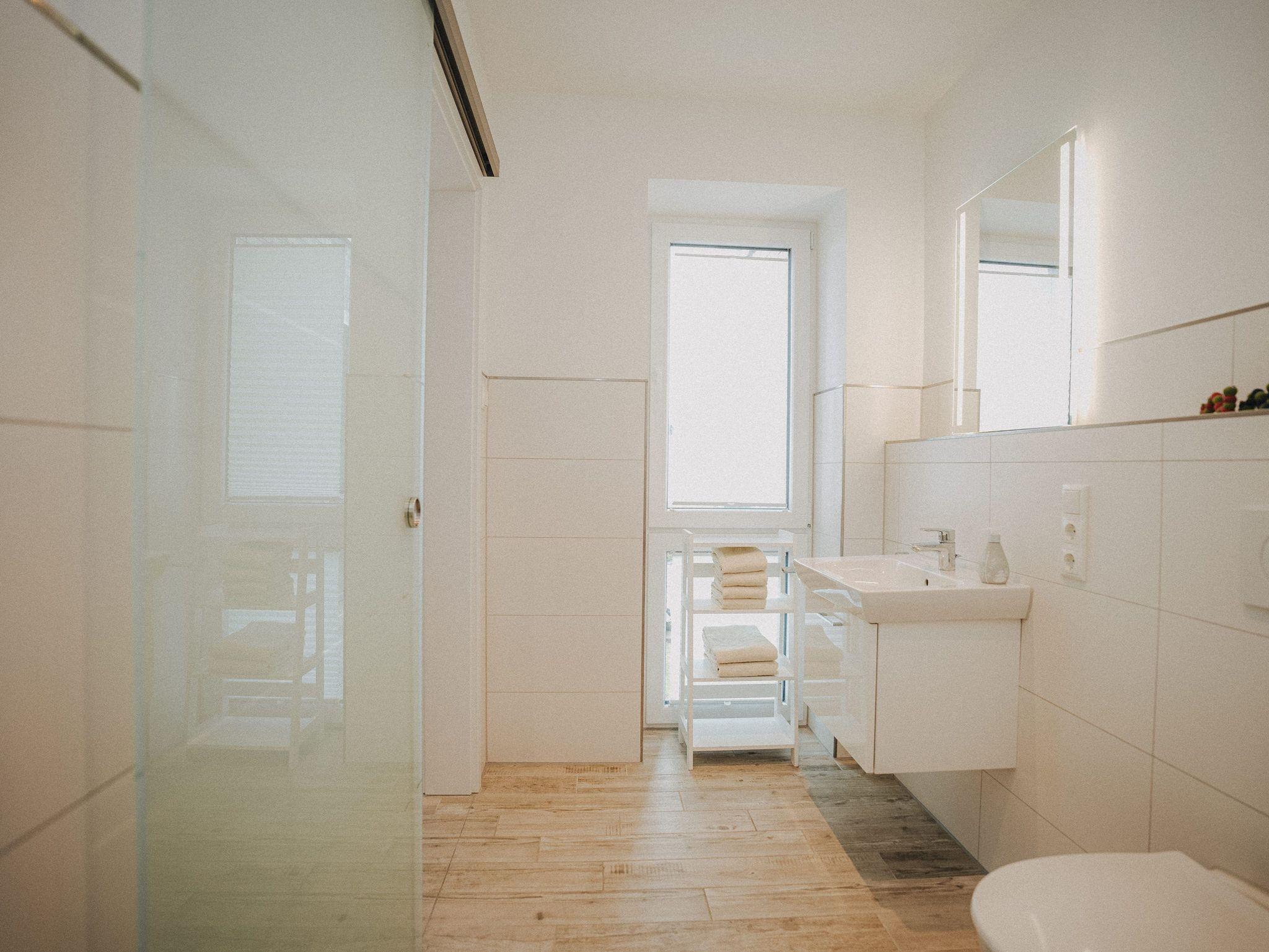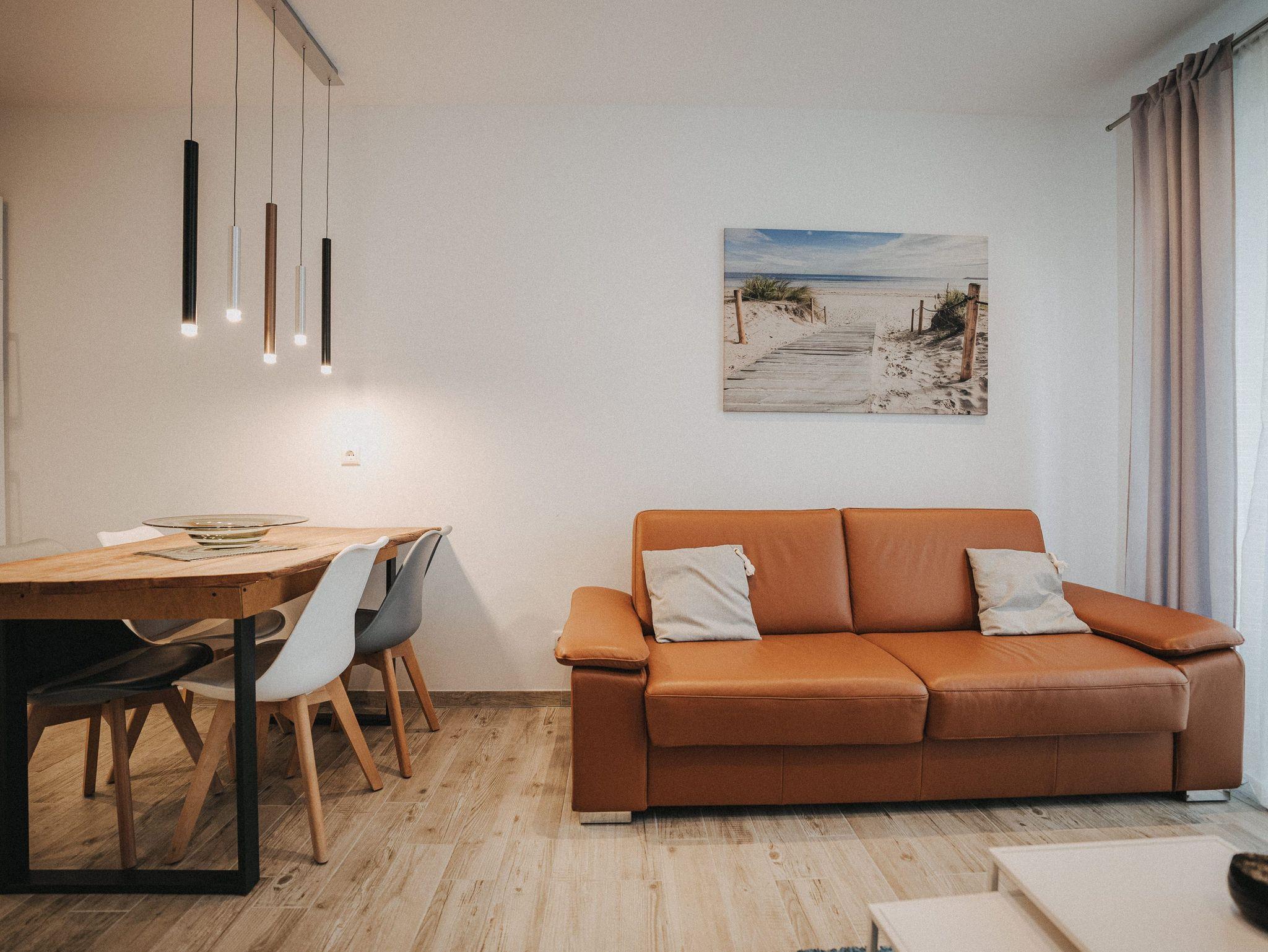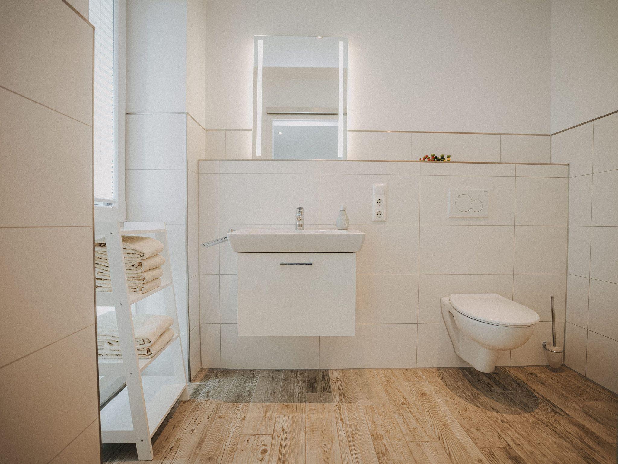 Unsere schicke Ferienwohnung Friedas Friesentraum heißt Sie herzlich willkommen: Es empfängt Sie ein heller Eingangsbereich mit Flur und Garderobe. Stärken Sie sich in der voll ausgestatteten Küchenzeile mit Esstisch in Naturholzoptik - Entspannen Sie im maritim gestalteten Wohnbereich mit großem Flat-TV auf der Ledercouch - Ziehen Sie sich zurück ins Schlafzimmer mit Doppelbett - Konsolen wandhängend - , Kleiderschrank und zusätzlichem Flat-TV. Von hier aus gelangen Sie ins schicke komfortable Duschbad mit Flacheinstieg und Sommerregendusche - Rasten und entspannen Sie auf dem überdachten Balkon mit Mobiliar - Es steht Ihnen ebenfalls ein geräumiger Abstellraum zur Verfügung. Hier befinden sich Waschmaschine und Trockner.