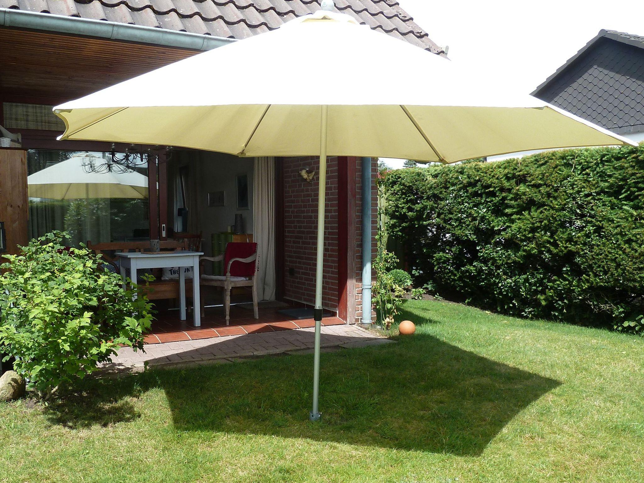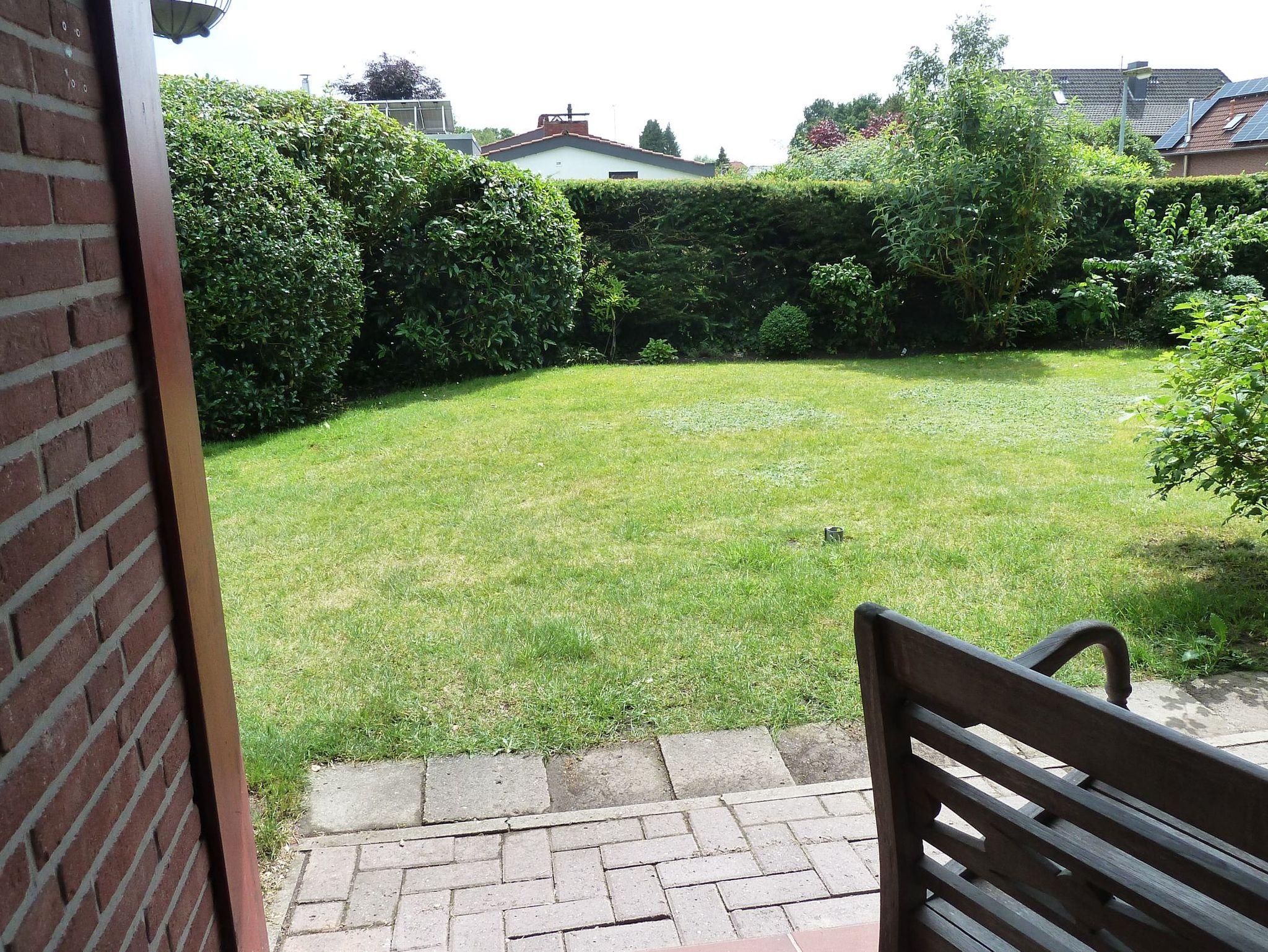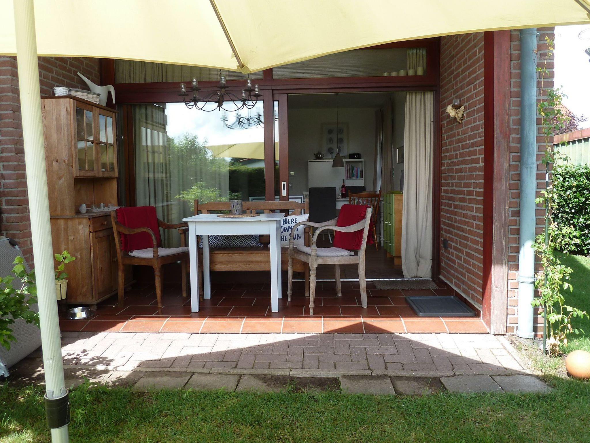 eine teilüberdachte Süd-Terrasse mit Blick in den Garten