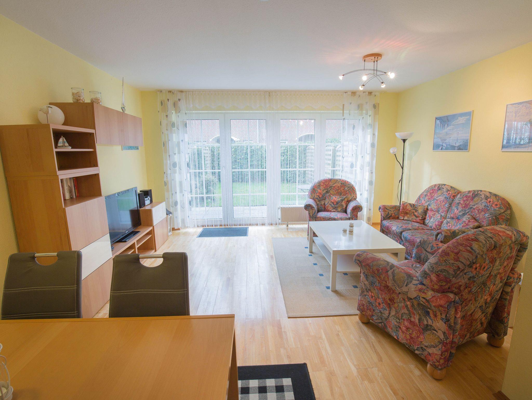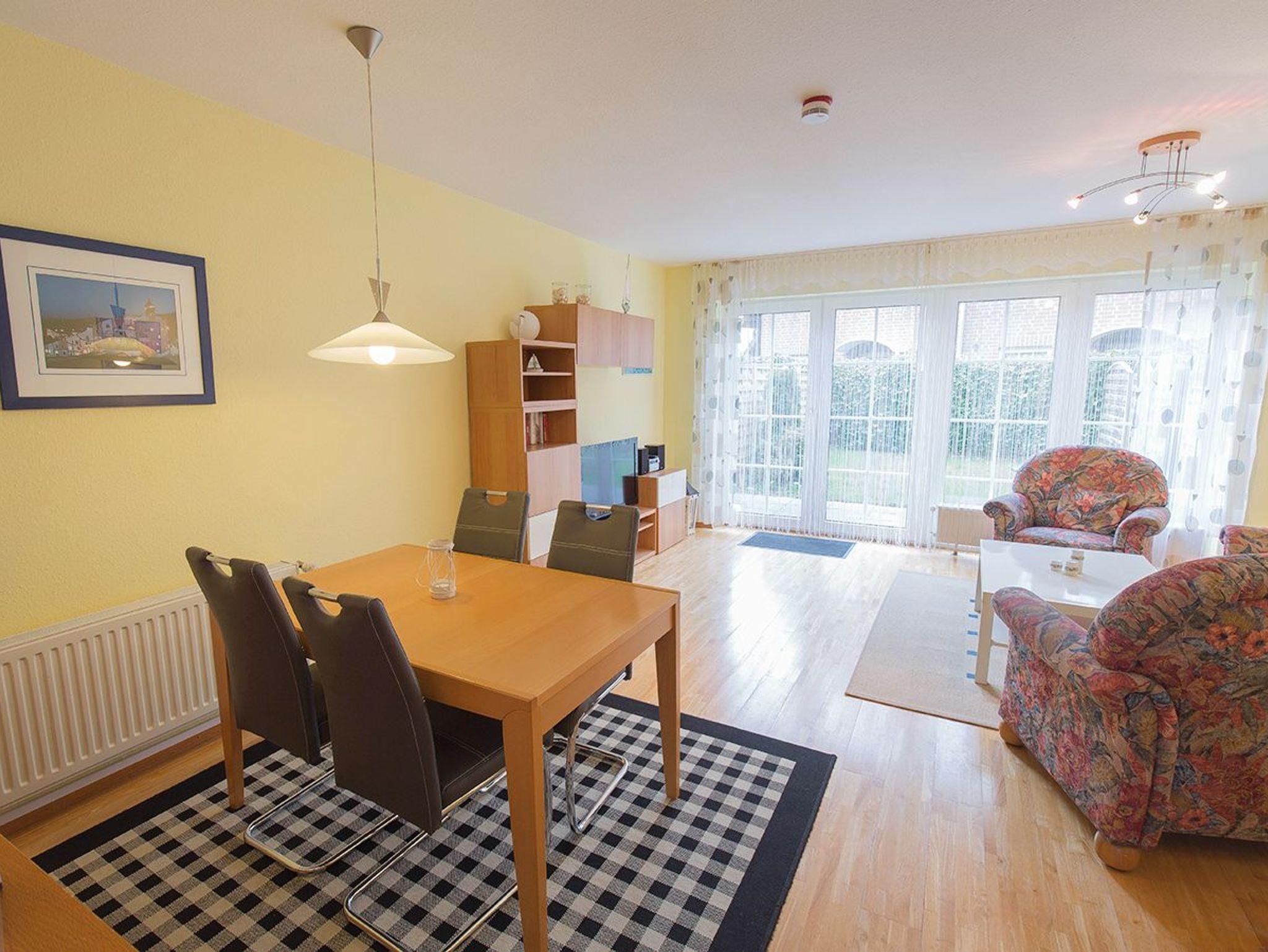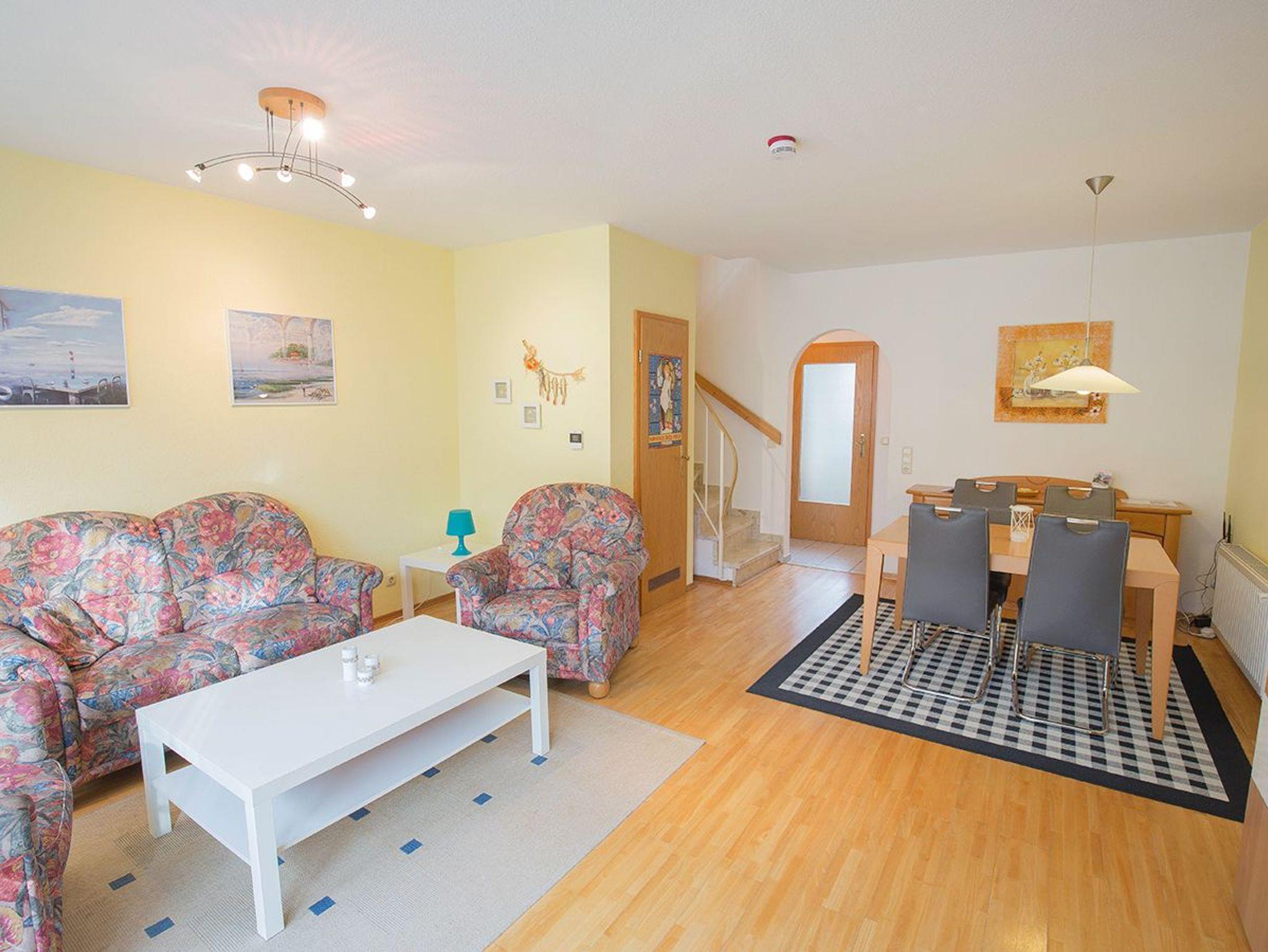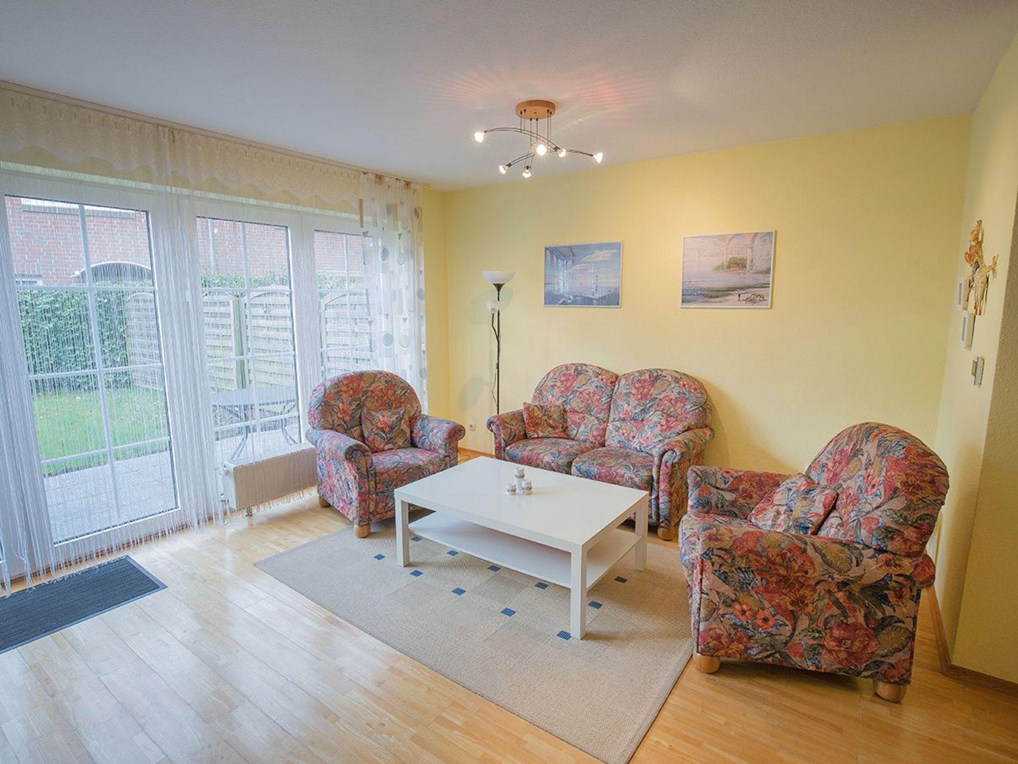 Kommen Sie alleine oder als Paar in das freundlich eingerichtete Reihenmittelhaus . Es liegt idyllisch inmitten von Wiesen und Feldern am Ortseingang. Genießen Sie hier Ruhe und Entspannung . Trotz der herrlichen Lage am Ortsrand erreichen Sie über einen Feldweg in zehn Gehminuten den Strand. Neben einem Schlafzimmer und einem Fenster-Duschbad mit Waschmaschine im Obergeschoss verfügt das Haus im Erdgeschoss über ein großes lichtdurchflutetes Wohnzimmer mit Flachbild-SAT-TV, Sitzecke im friesischen Stil und separatem Essplatz. Darüber hinaus befindet sich im Erdgeschoss eine vollständig ausgestattete Küche - mit zusätzlich einer Pad-Maschine sowie ein separates Gäste-WC und Diele mit Garderobe. Genießen Sie frische friesische Luft auf der Terrasse mit Rasenstück.
