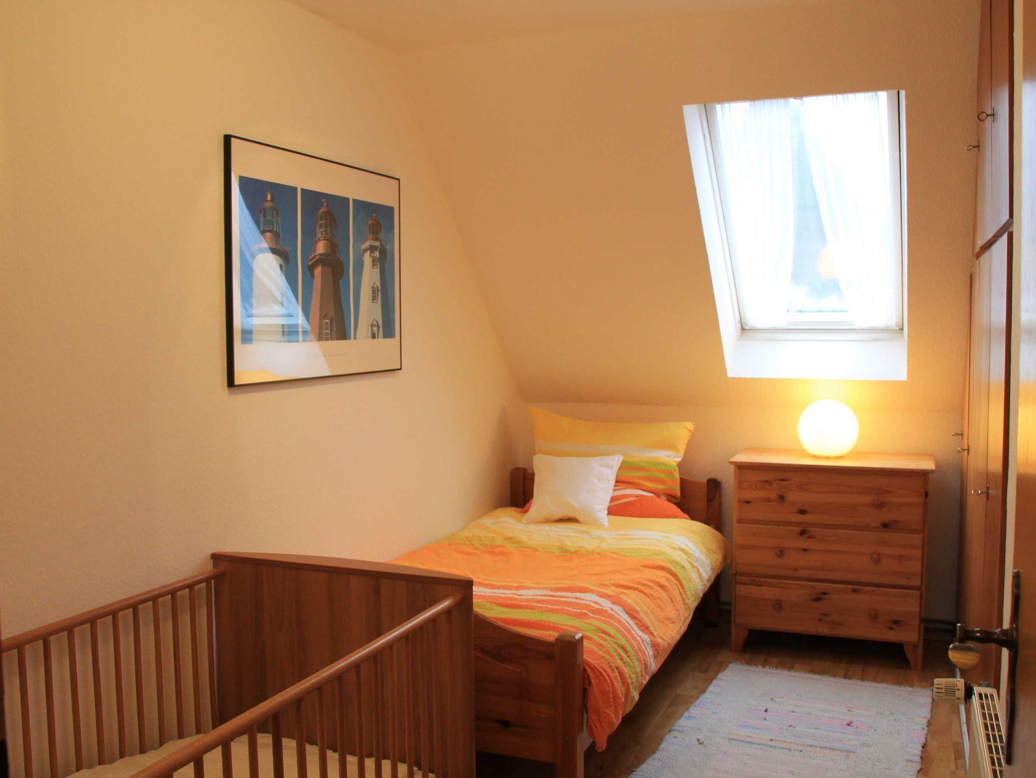 Kinderbett und Hochstuhl sind vorhanden.