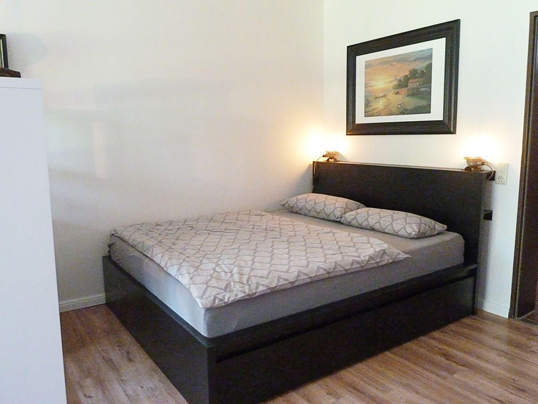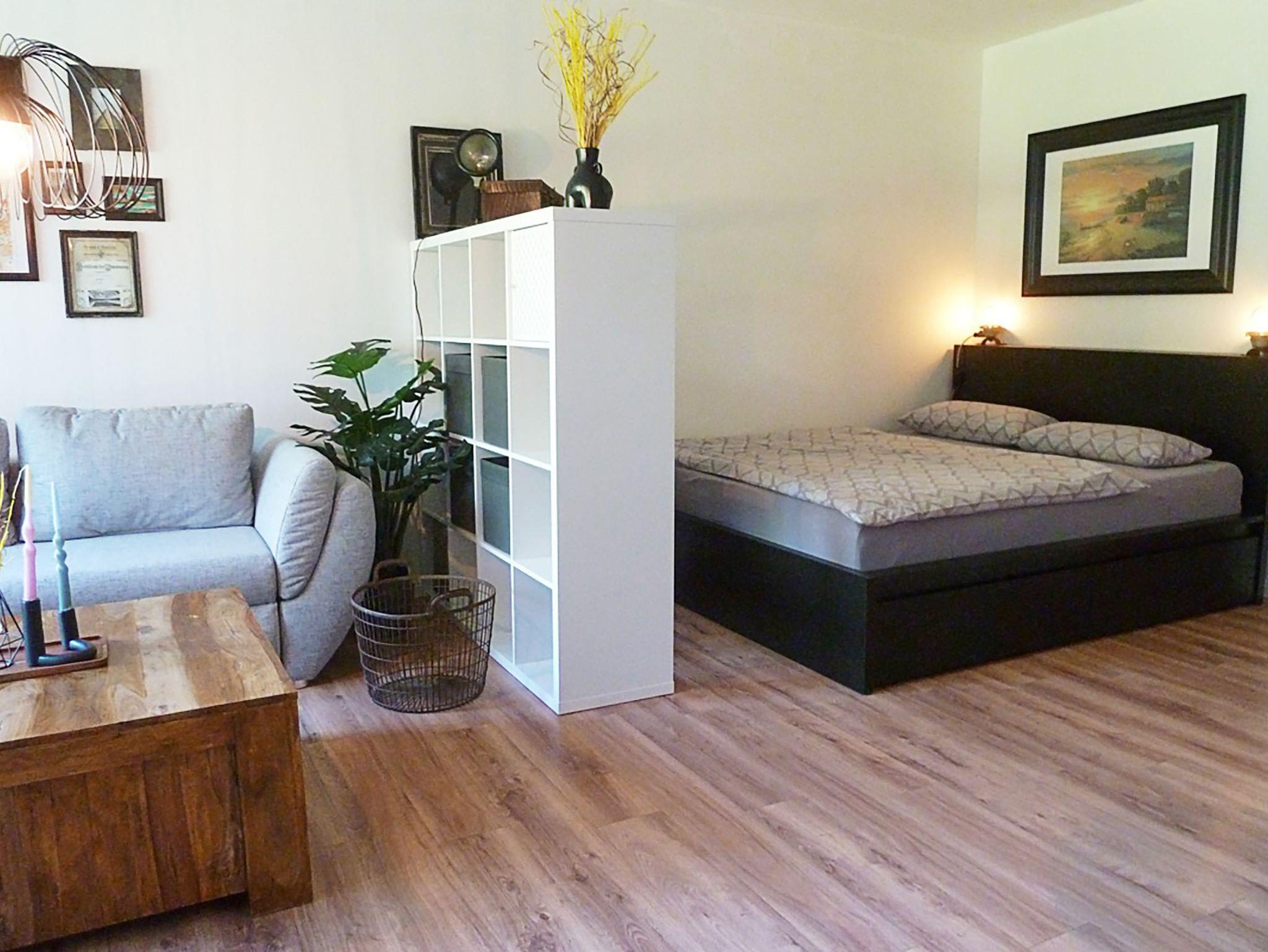 Der Wohn- Schlafraum ist geschmacklich und stilvoll eingerichtet. Das Doppelbett in der Größe von 160 x 200 cm fügt sich in den Wohnbereich sehr schön ein.