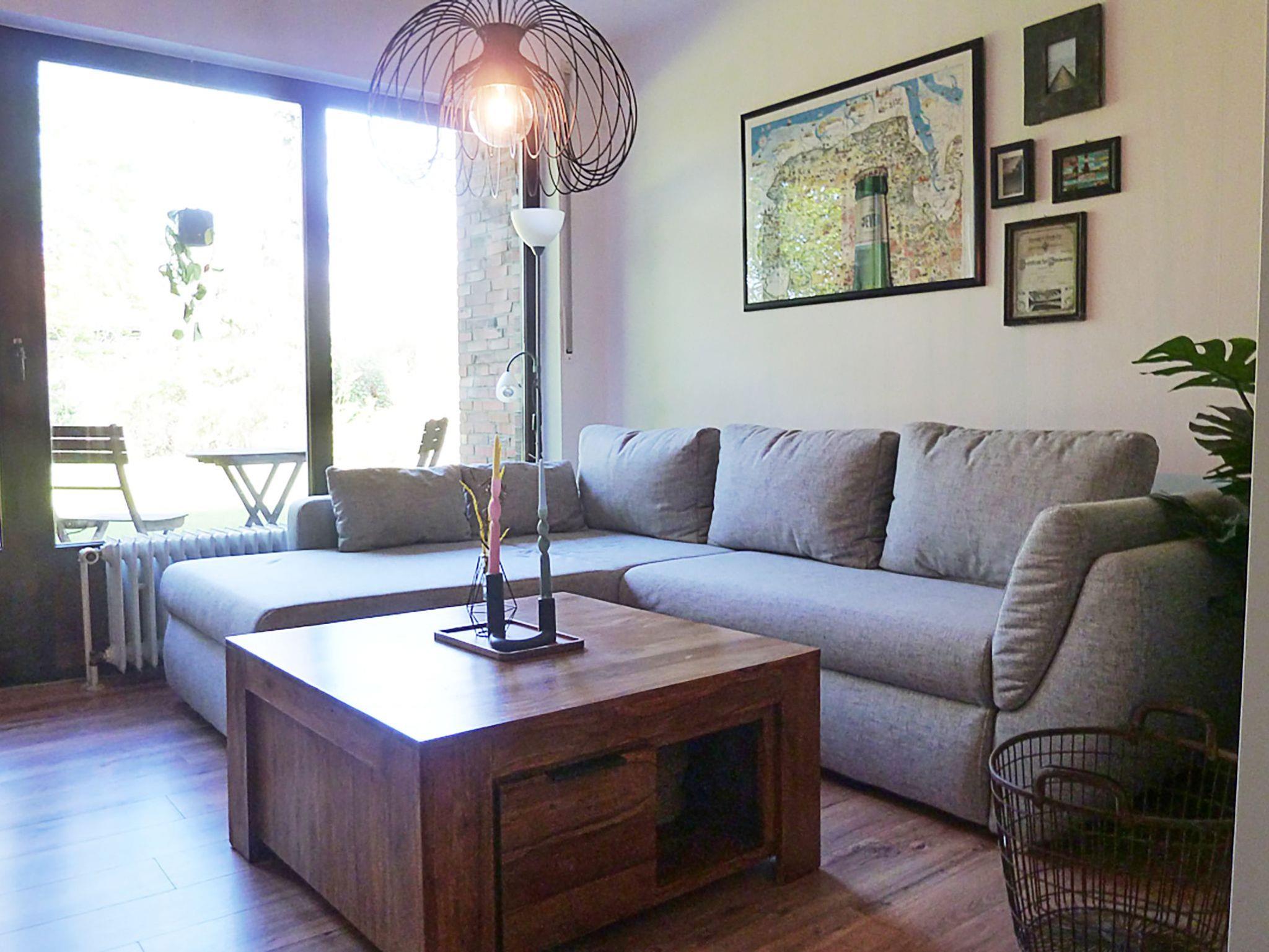 Vom Sofa aus blicken Sie nicht nur auf den Flachbildschirmfernseher sondern auch in den großzügigen Garten mit eigener Terrasse in Südwestrichtung.