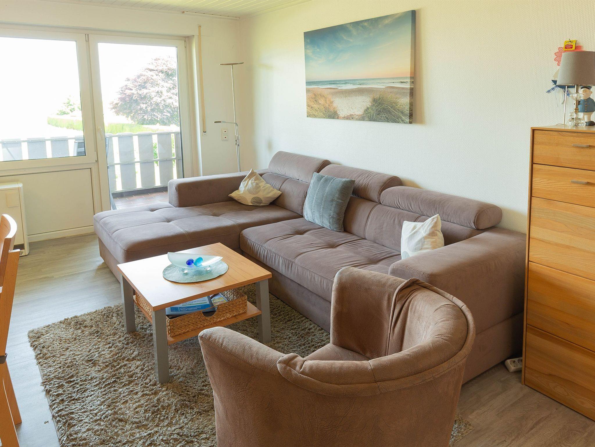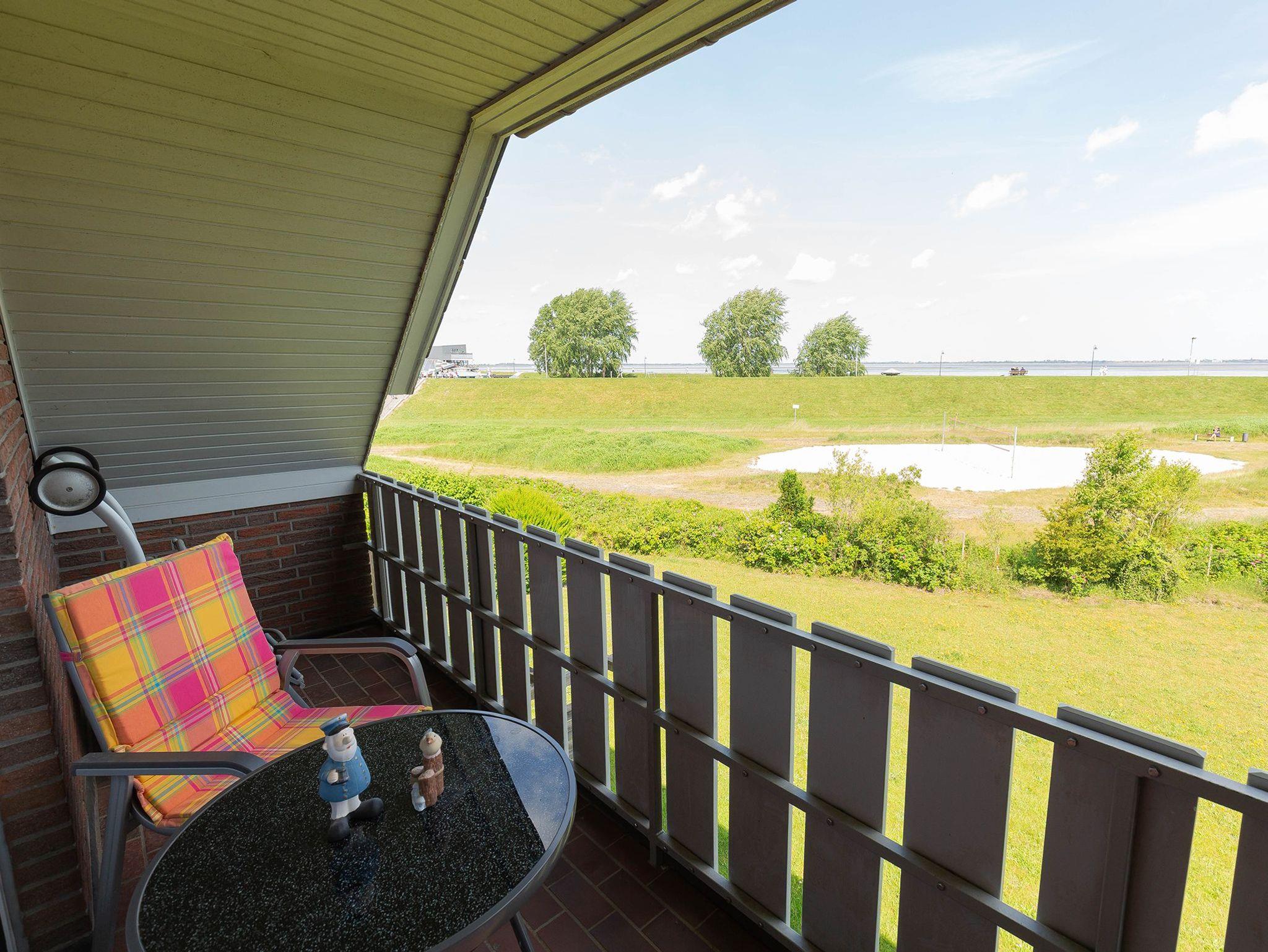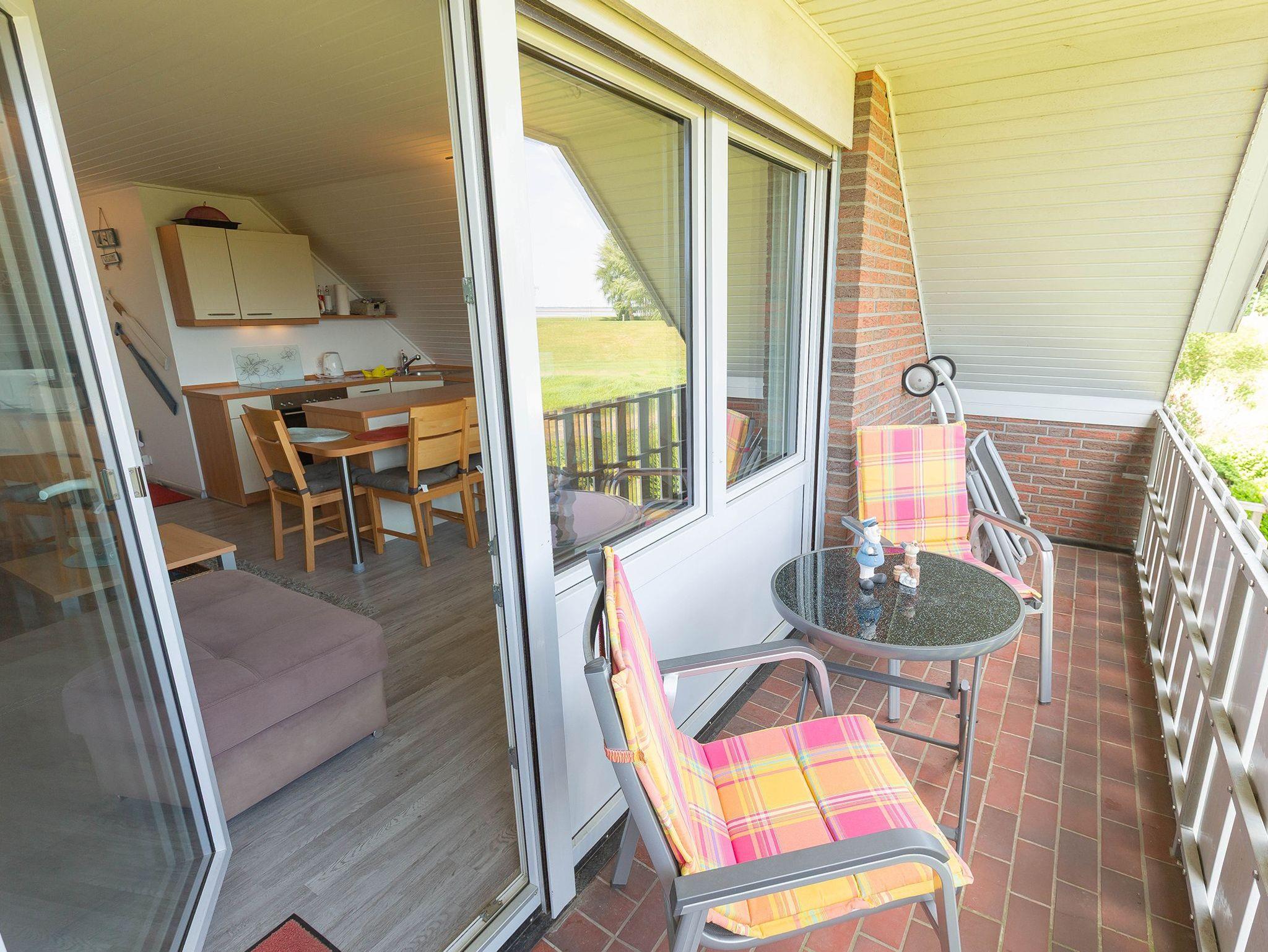Direkt am Deich mit Blick auf den Jadebusen finden Sie unsere Wohnung Deichblick I am Kukshörner Weg 12b. Im ersten Stock erstreckt sich die Wohnung auf zwei Etagen. Auf Ebene eins finden Sie das Doppelschlafzimmer, das Wohn-/Esszimmer sowie das komplett sanierte Bad mit bodentiefer Dusche. Das Schlafzimmer mit Doppelbett hat ein weiteres TV-Gerät und hier ist ihr direkter Zugang zum Südbalkon. Im Wohnbereich - der Flat-Screen, DVD-Player und CD-Player bietet, gelangt man auf den weiteren Balkon mit einem schönen Blick auf den Jadebusen.
