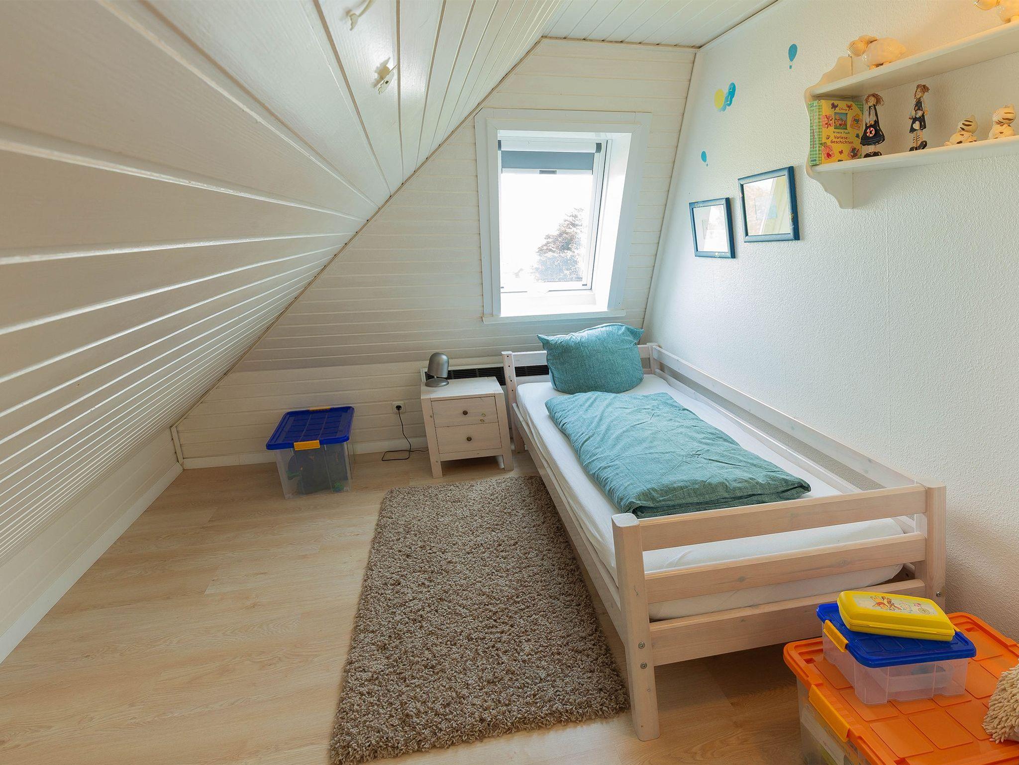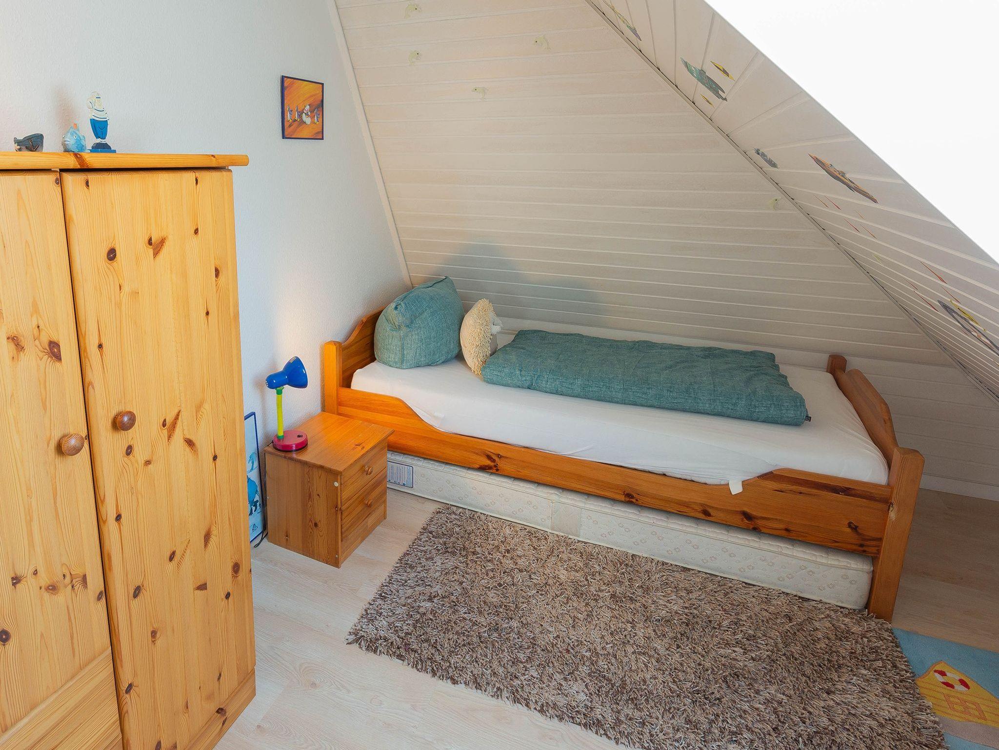 Die in den Wohnraum integrierte Einbauküche mit gehobener Ausstattung lässt keine Wünsche für ein entspanntes Kochen offen. Über eine Wendeltreppe geht es hinauf zu den beiden Schlafzimmern in die zweite Etage - jeweils bestückt mit einem Einzelbett.