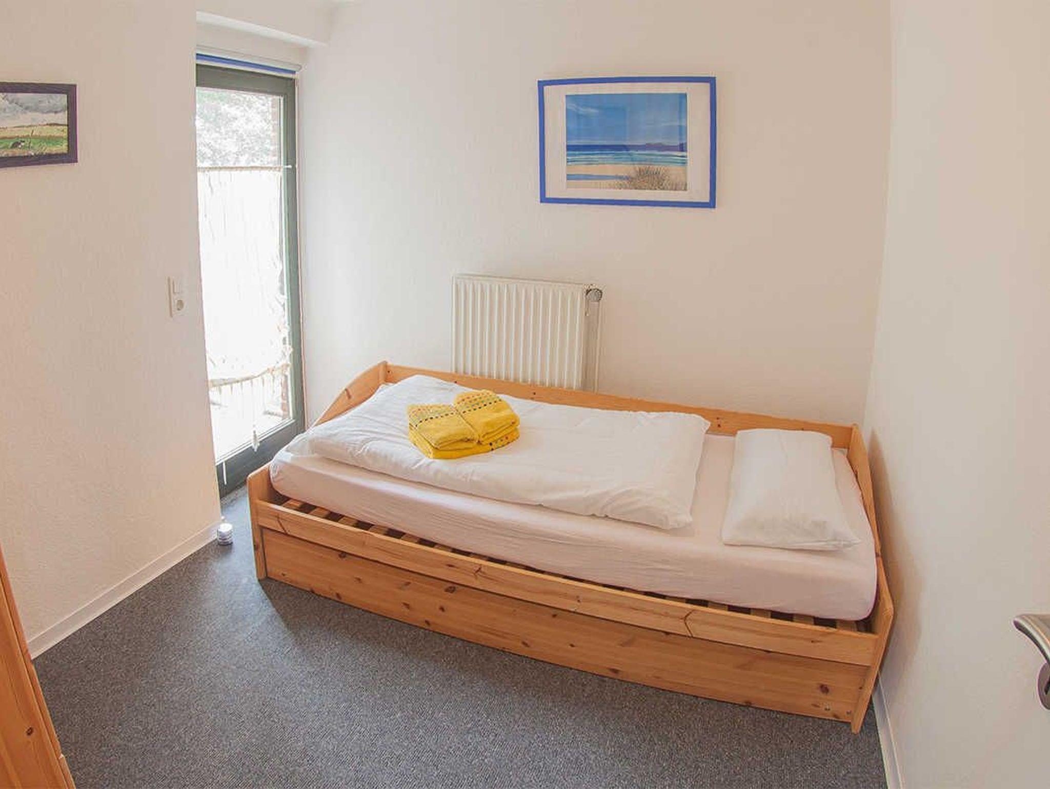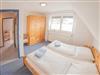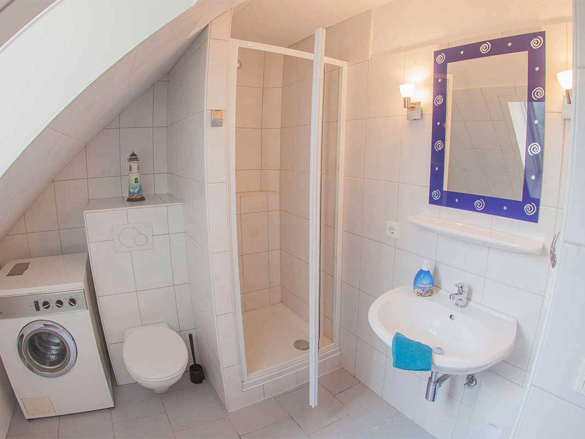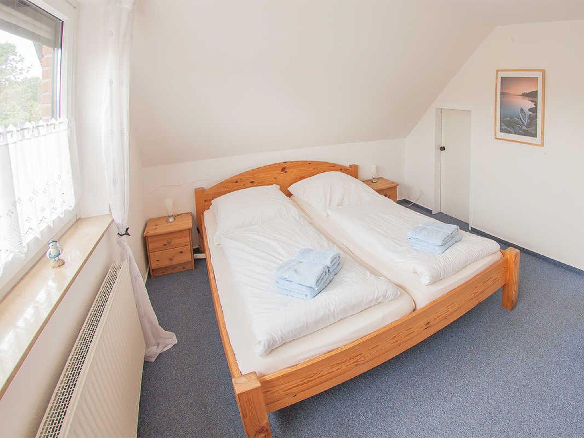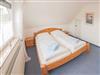 Im Obergeschoss liegt das helle Fensterduschbad mit Waschmaschine und die beiden Schlafräume mit Teppichboden: je ein Zimmer mit Doppelbett und ein Schlafraum mit ausziehbarem Tandembett.