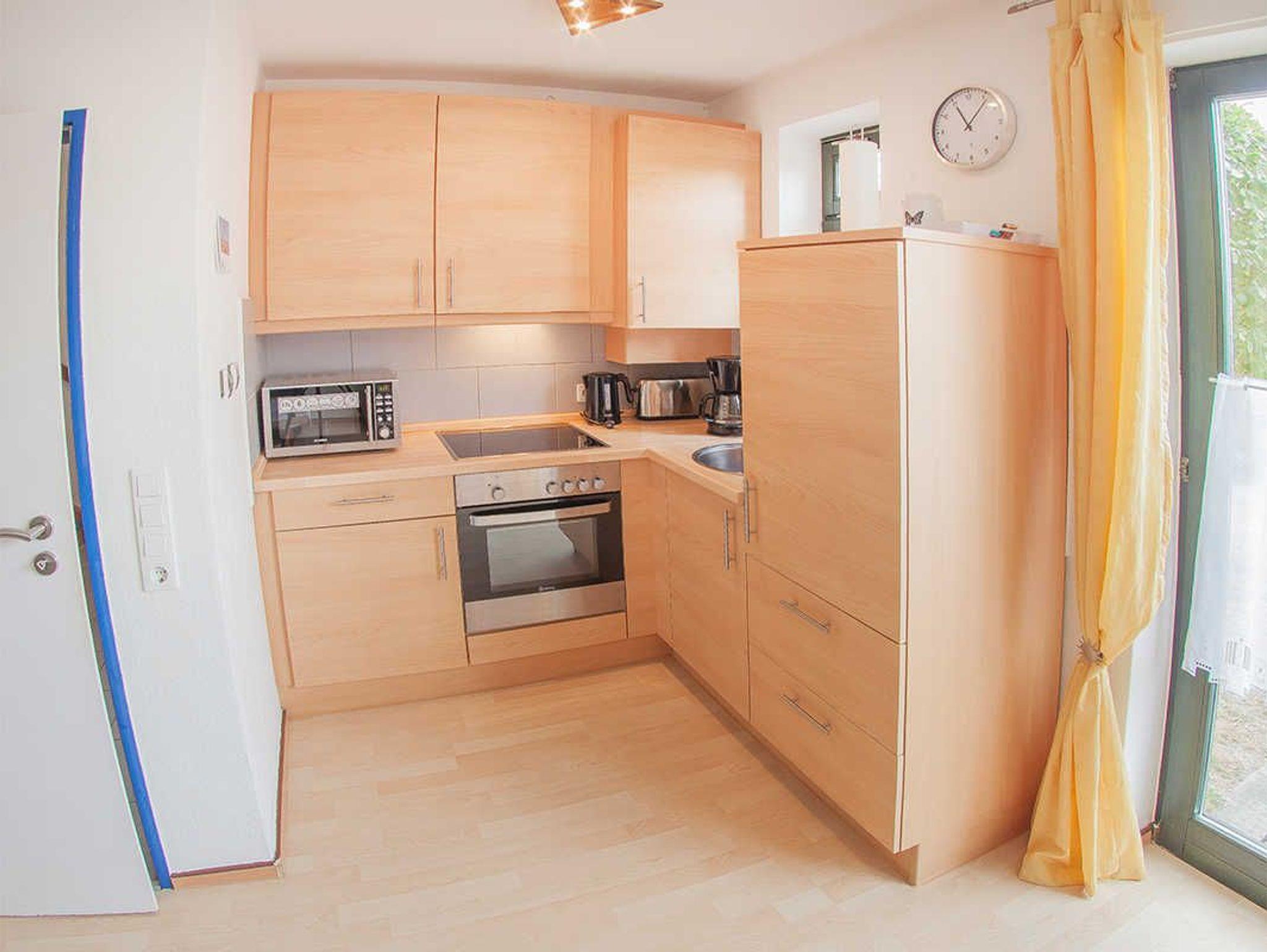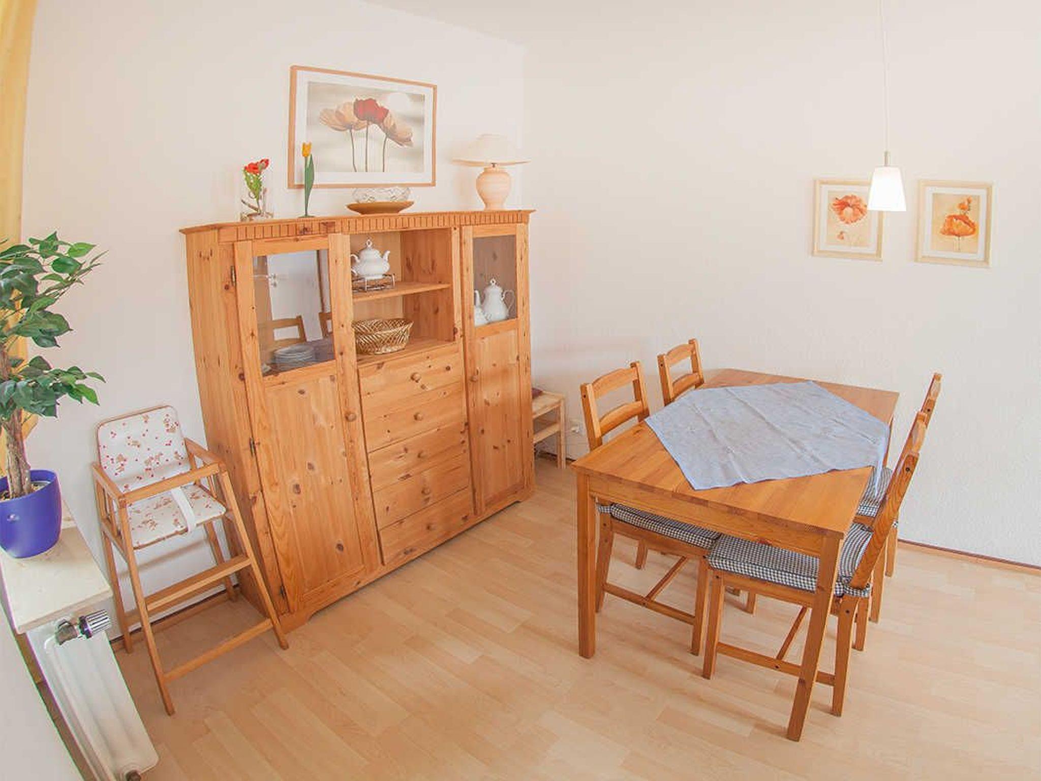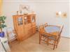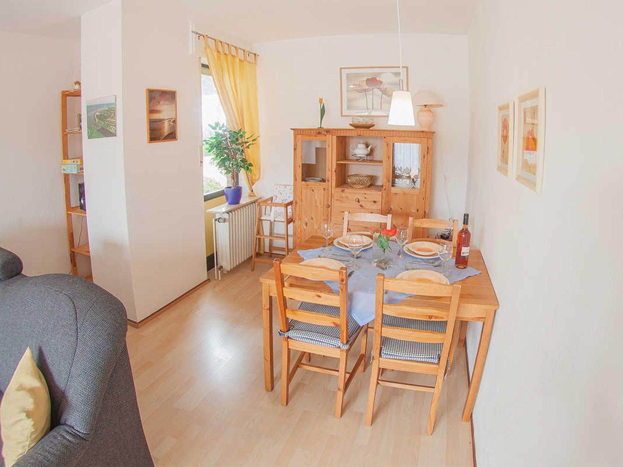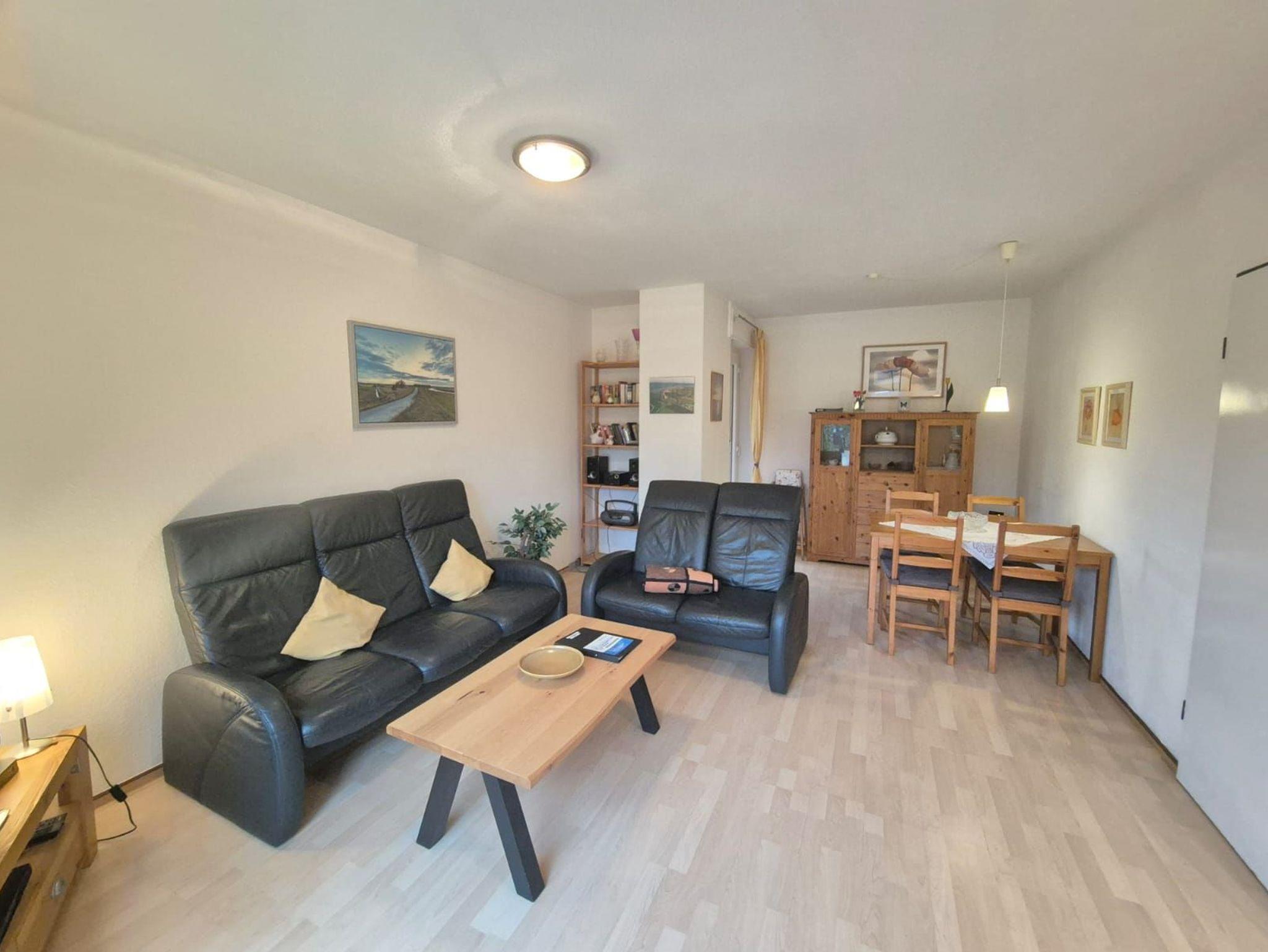 Im Eingangsbereich finden Sie den Flur mit Garderobe und Gäste-WC. Weiter geht's zum kombinierten Küchen-Essbereich mit Kinderhochstuhl und dem gemütlichen Wohnzimmer mit Ausgang zur möblierten Terrasse. Hier genießen Sie die Sonne sichtgeschützt auf der Südseite. Die Wohnung hat Laminatfußboden und Fliesen.