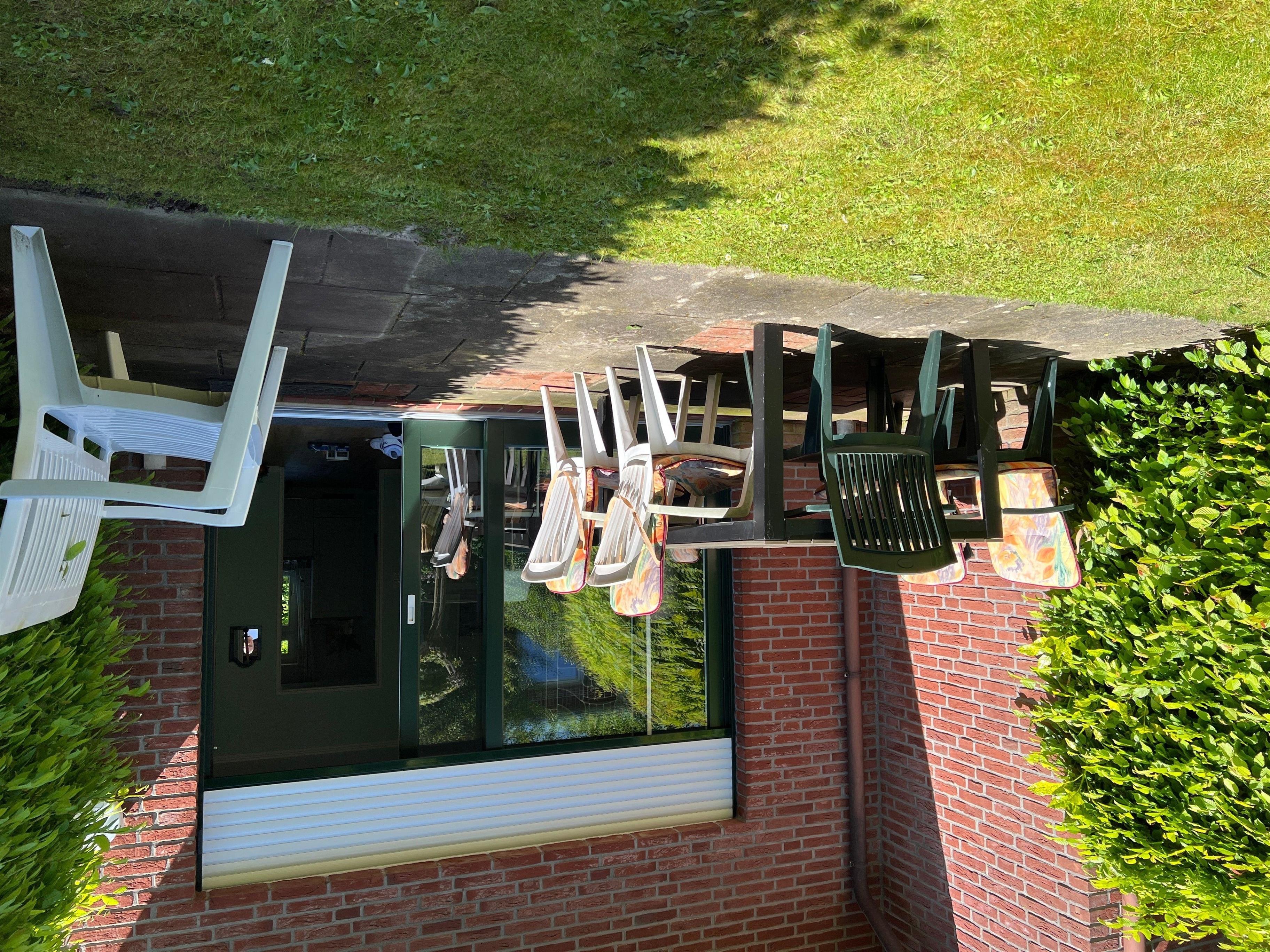 Vom Wohnzimmer aus gelangen Sie auf die Terrasse und den Garten, die durch Hecken, Bäume und Sträucher vor neugierigen Blicken schützen. Dort stehen ein Tisch, Stühle und eine Bank sowie eine Sonnenliege für Sie bereit.