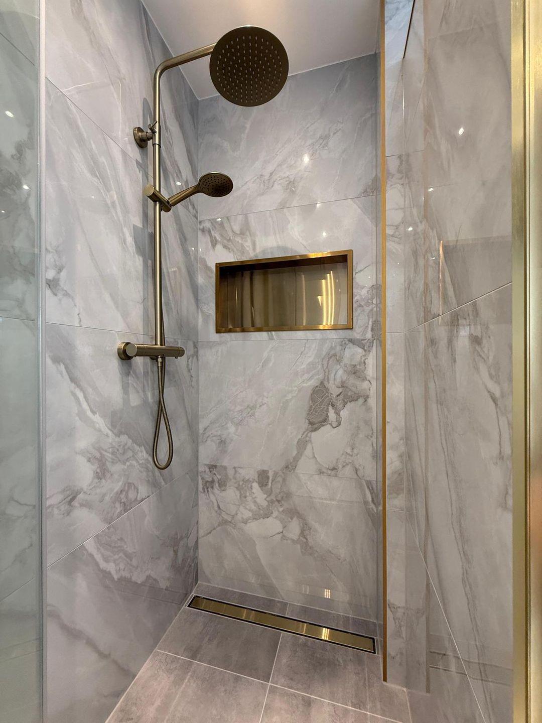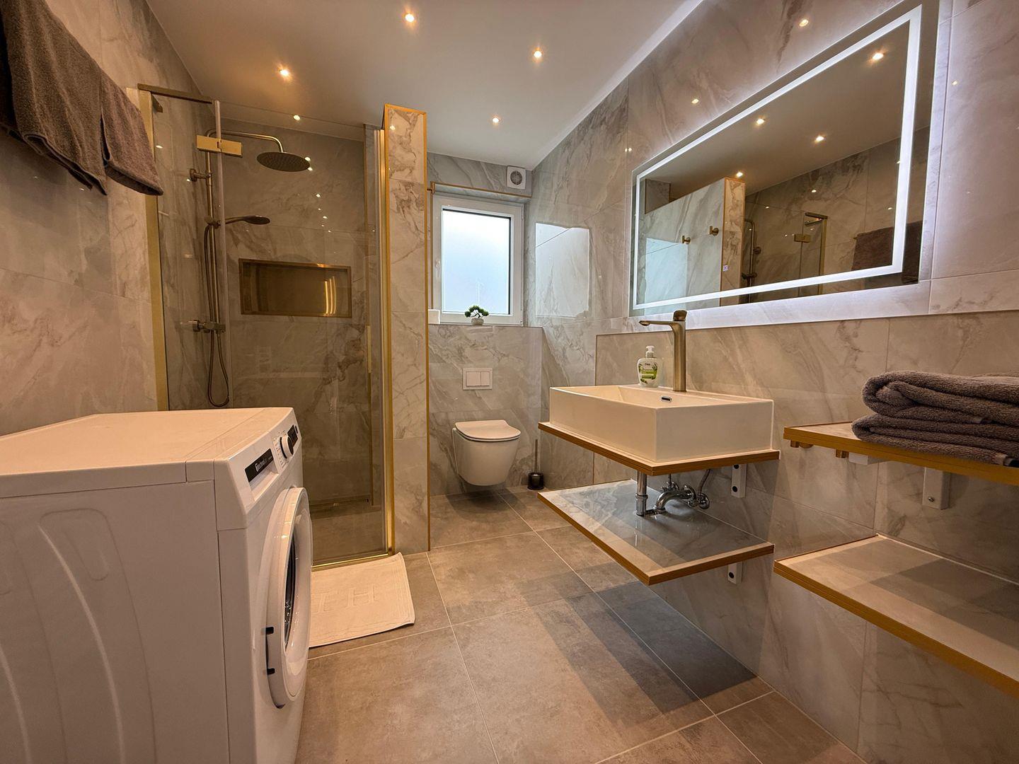 Das Badezimmer bietet eine bodengleiche Dusche, Waschbecken, Spiegel und Fenster für Tageslicht. Warmes Wasser ist selbstverständlich vorhanden.