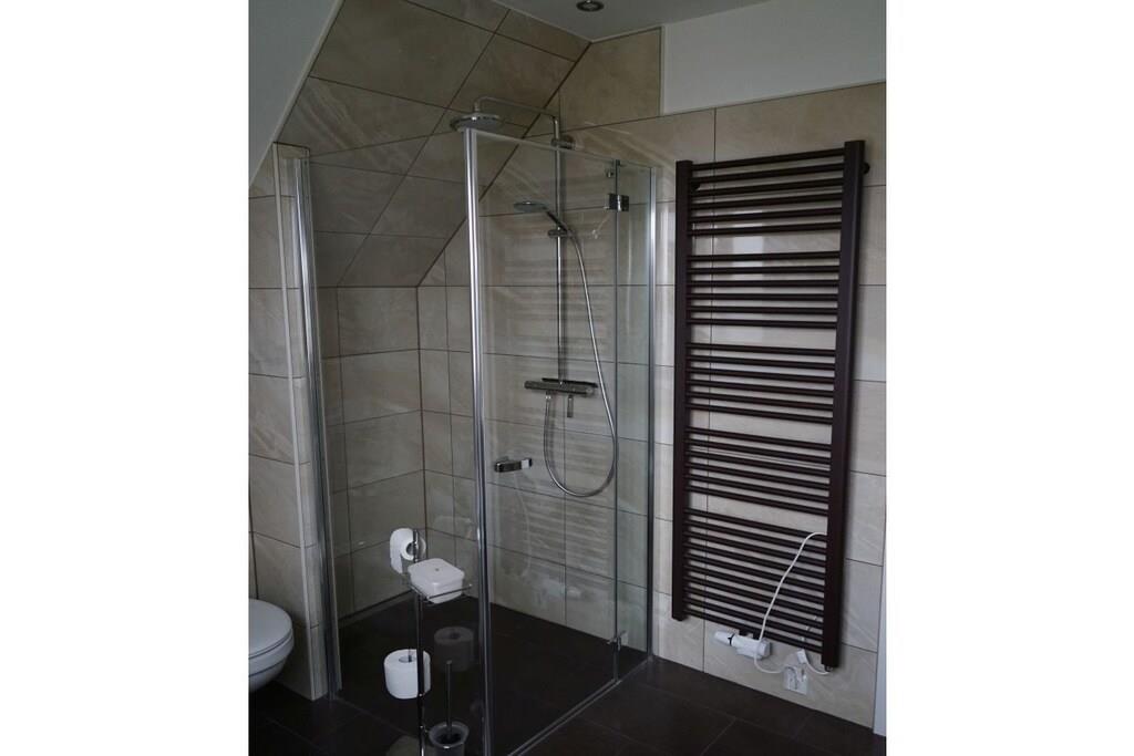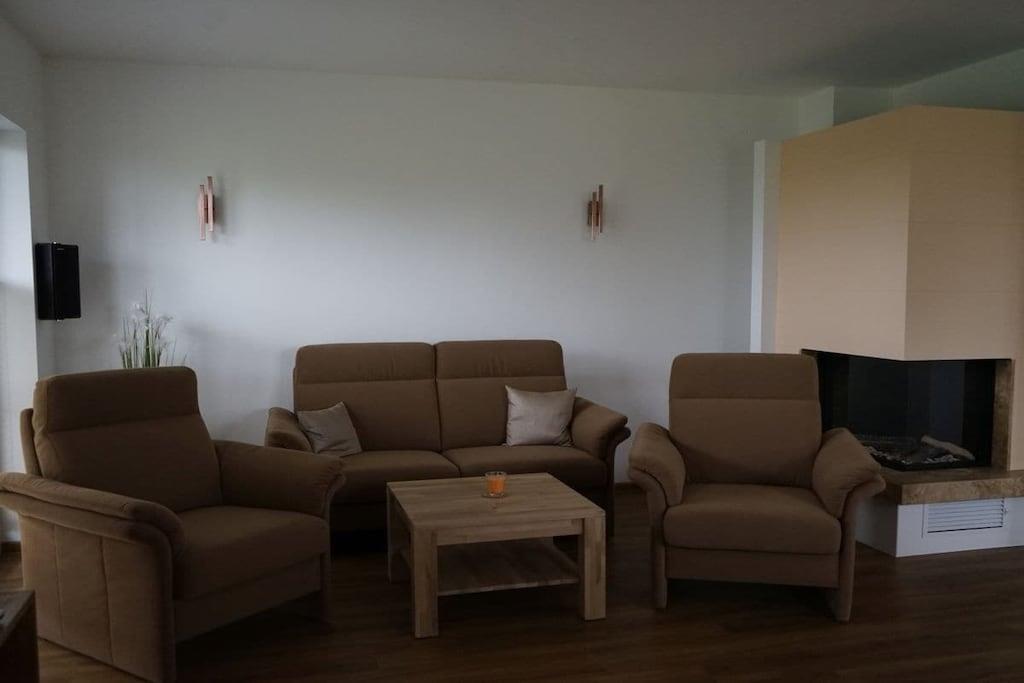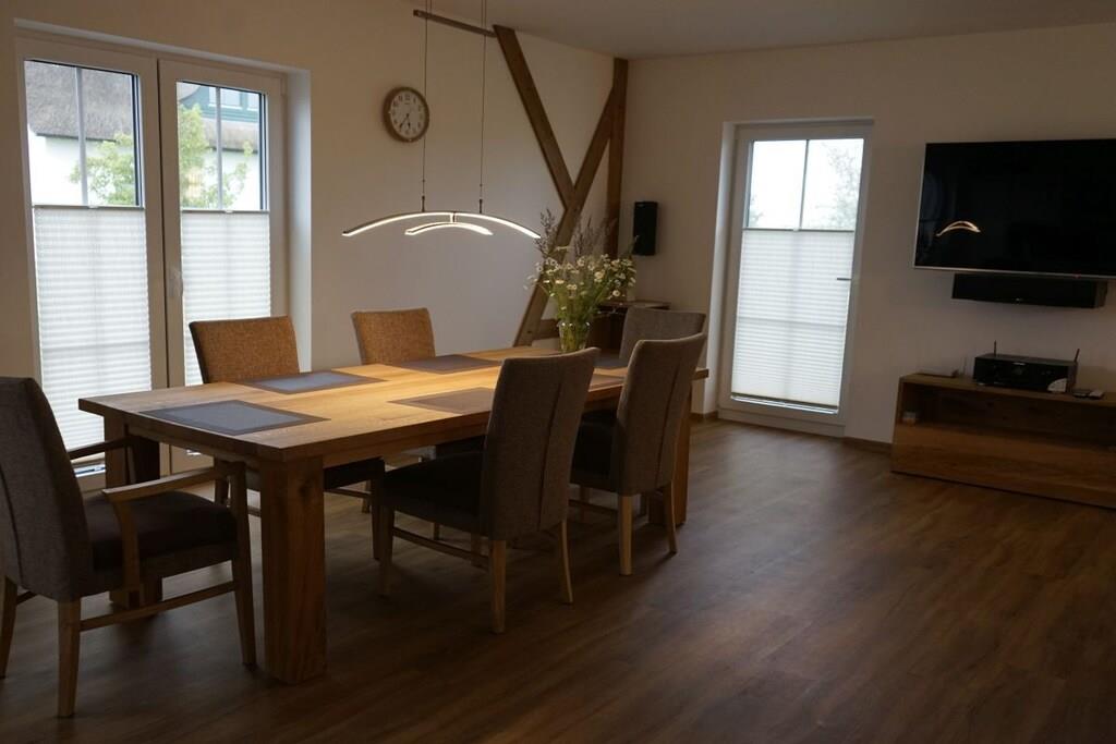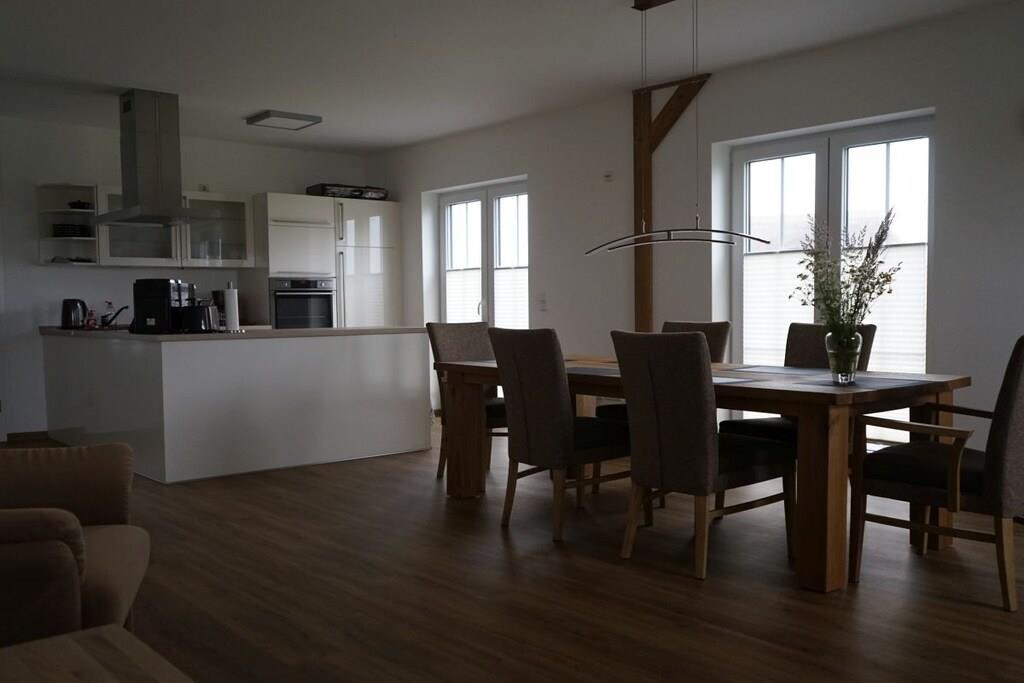The semi-detached house offers a high standard of amenities on three floors. The house is designed for use by a maximum of 4 adults, 1 child up to 5 years old, and 1 child up to 2 years old. It is our goal to provide a high standard of seating and sleeping comfort and wellness-oriented relaxation. One of the bathrooms is equipped with a whirlpool. The attic features a sauna for 4 people and loungers. In the living room, you can enjoy warmth and coziness at the touch of a button thanks to a gas fireplace. The open-plan kitchen is well-equipped and spacious, so even preparing and presenting meals could be a holiday highlight. The master bedroom is furnished with a box-spring bed. Another highlight of the room is the permanently phosphorescent starry sky.