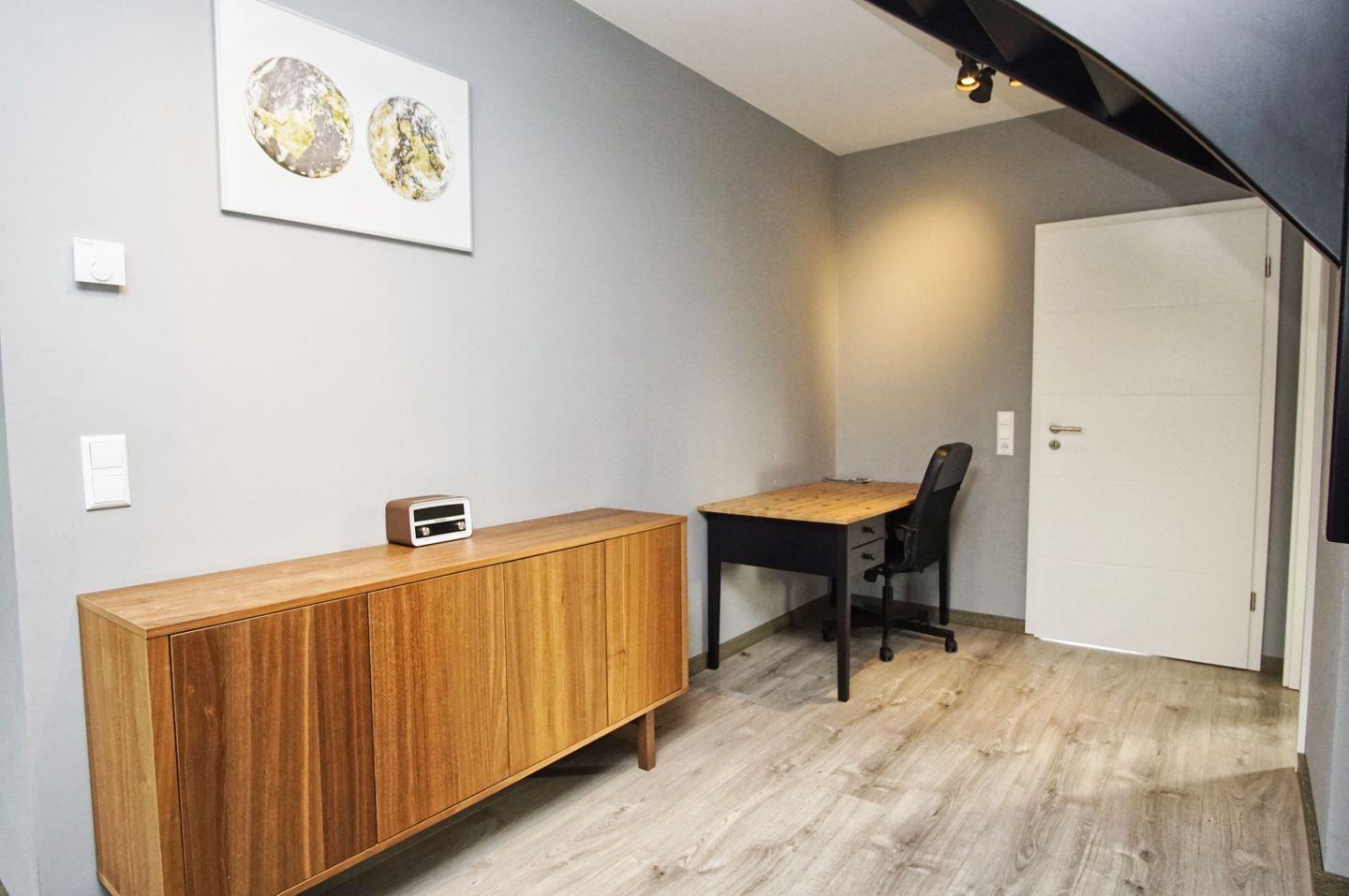 WOHNEN // Wohnraum im EG mit Essbereich, mit bequemer Couch, Kaminofen, Flachbild-TV, Essbereich, Schreibtisch,