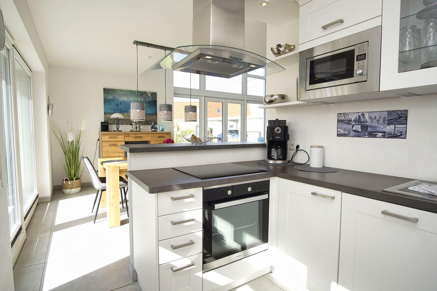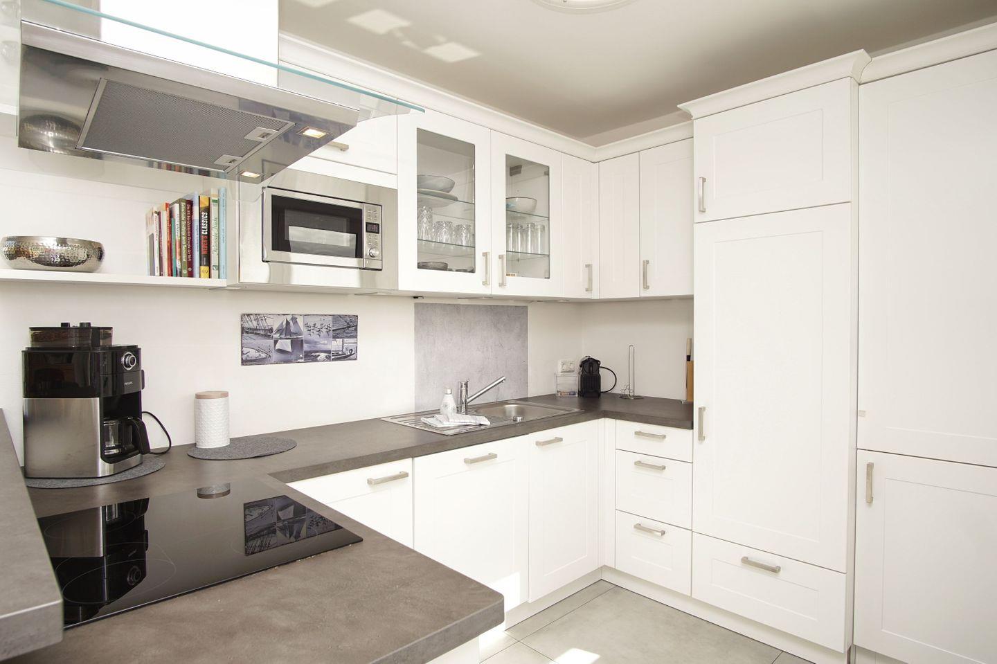 KÜCHE // offene Küche, Ceranfeld, Kühlschrank mit Gefrierfach, Backofen, Mikrowelle, Toaster, Wasserkocher, Kaffeemaschine, Kaffeevollautomat, reichlich Besteck, Geschirr und Küchenutensilien ++
