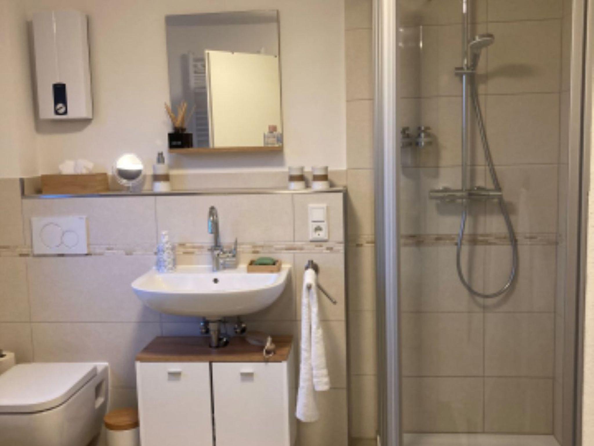 Im Erdgeschoß befindet sich neben dem Flurbereich eine gut ausgestatte Küche, ein kleines Wohnzimmer und ein WC mit Waschtrockner. In der ersten Etage befinden sich zwei Schlafzimmer und ein neues Bad mit Dusche.