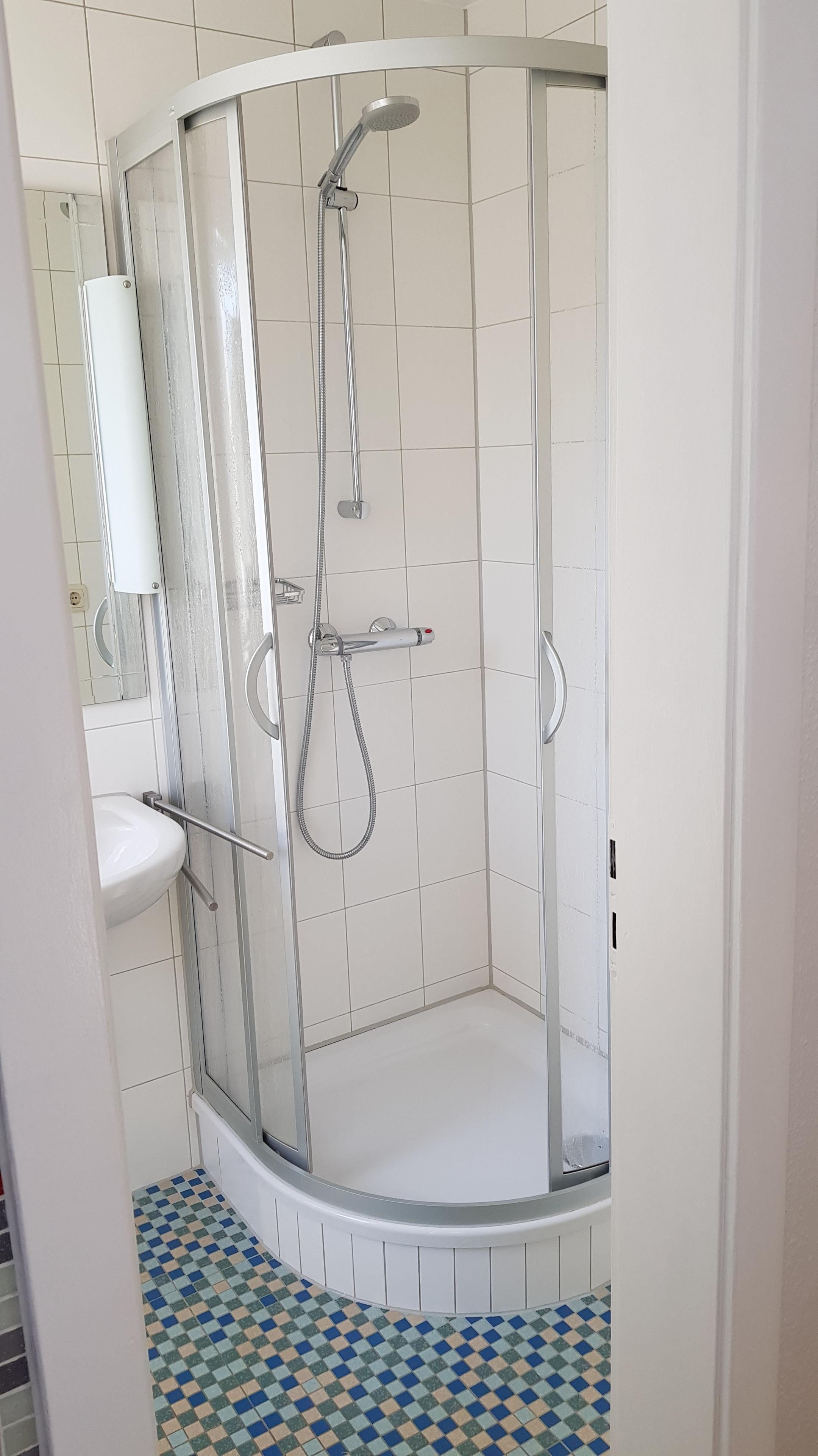 Das geflieste Tageslichtbad verfügt über Dusche, Waschbecken, WC. Hier finden Sie auch eine Waschmaschine und einen Haartrockner.