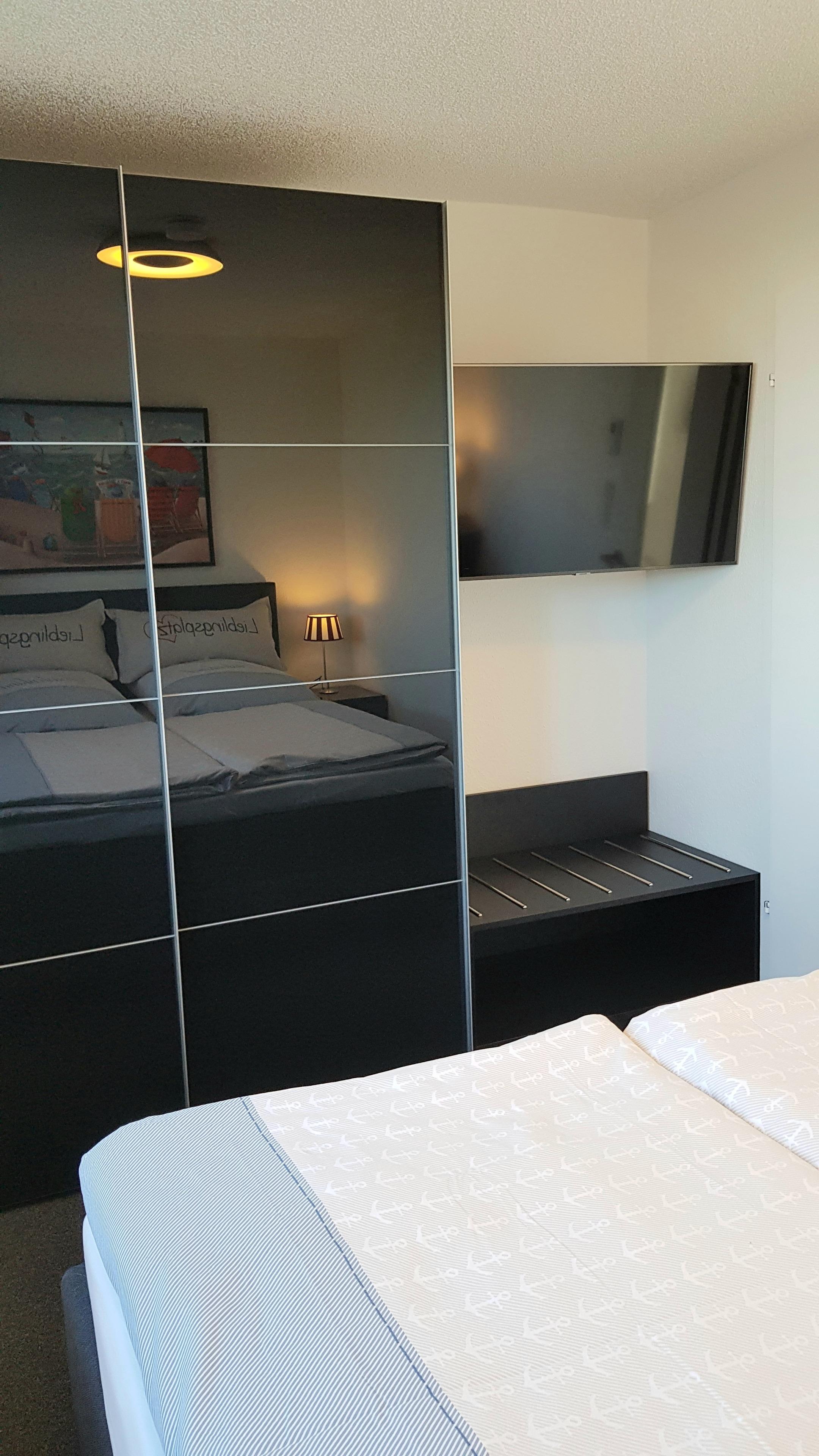Das Schlafzimmer ist mit einem hochwertigen Boxspringbett von SWISS SENSE, 160 x 200 cm, ausgestattet. Genügend Stauraum, auch für längere Aufenthalte, finden Sie im großen Kleiderschrank mit Schiebetüren. Auch im Schlafzimmer befindet sich ein Smart-TV neuester Generation. Für Ihr Gepäck befindet sich im Schlafzimmer außerdem eine Kofferablage. Die Fenster im Schlafzimmer sind mit Verdunkelungsmöglichkeit ausgestattet.