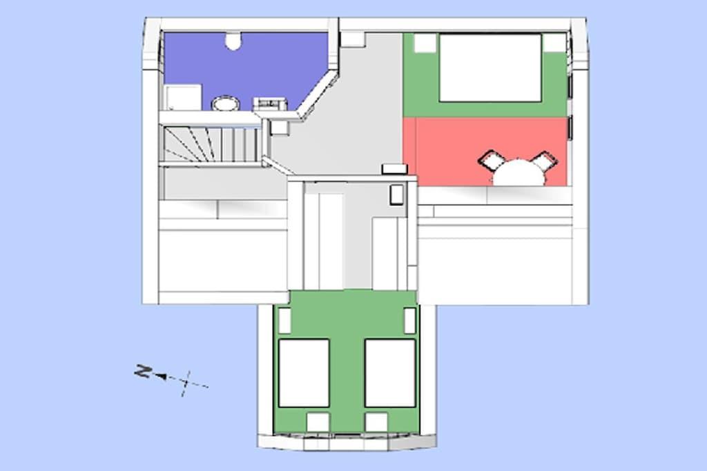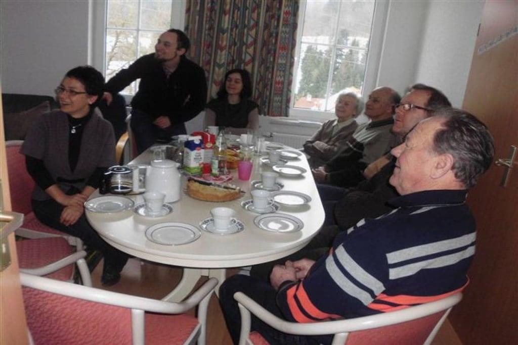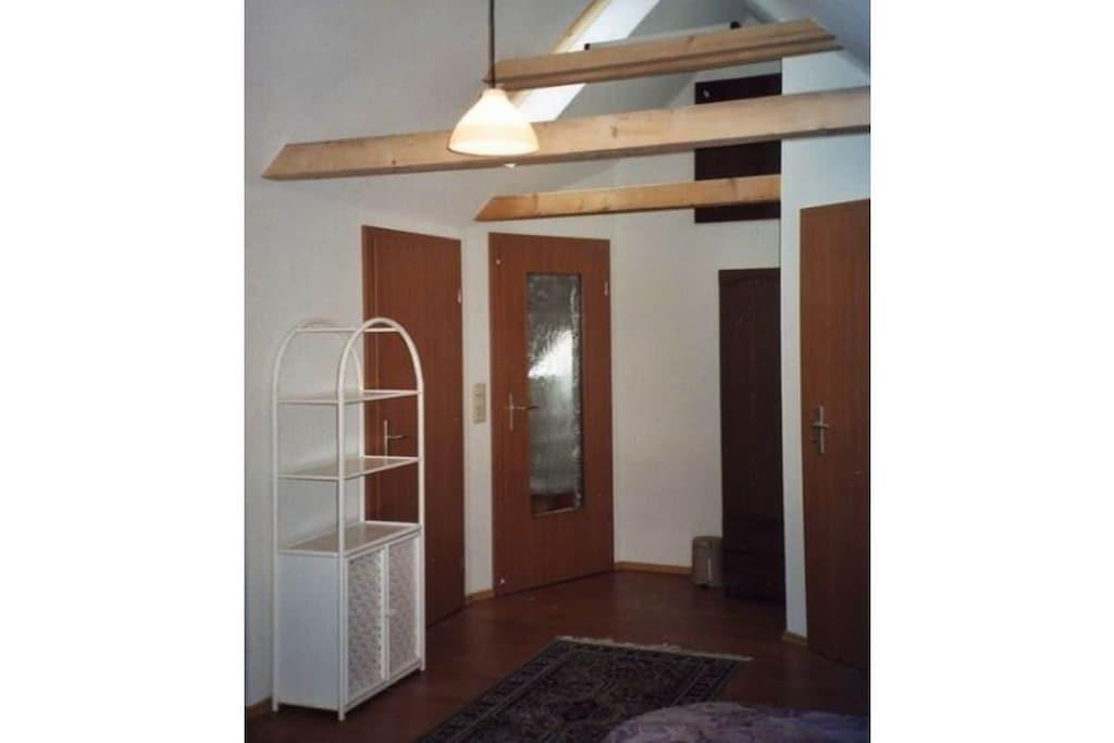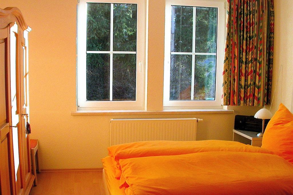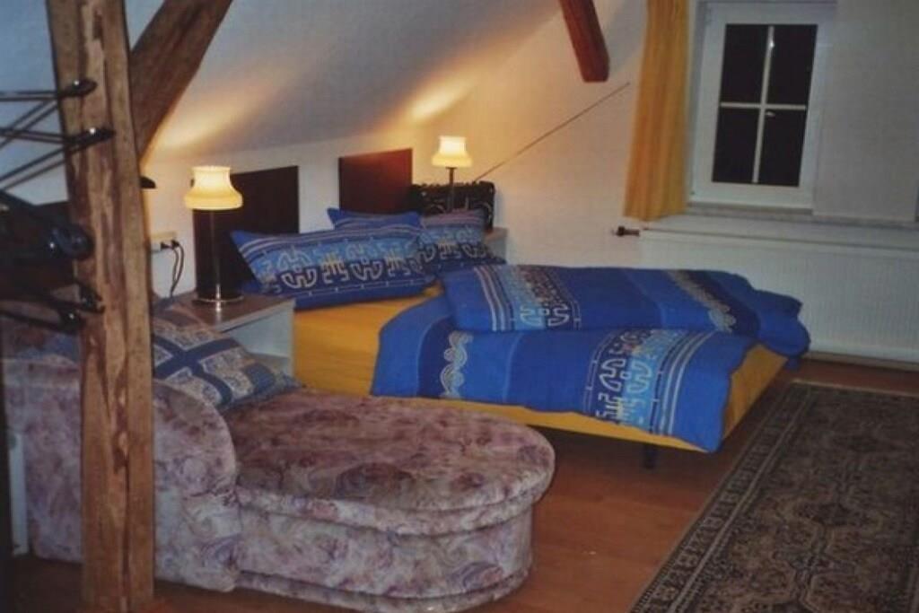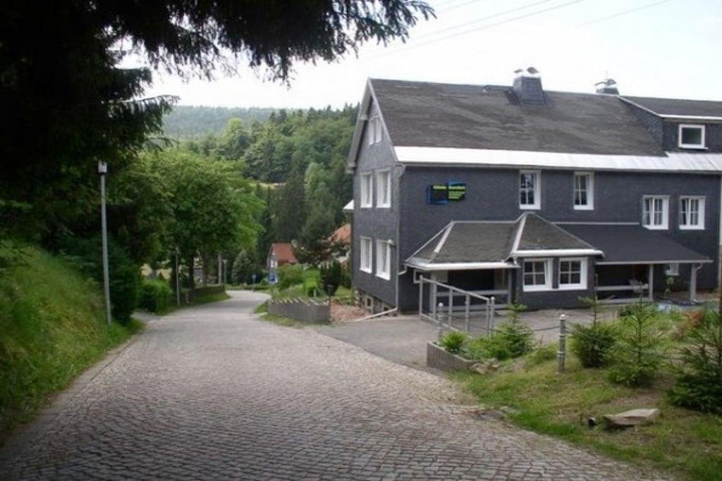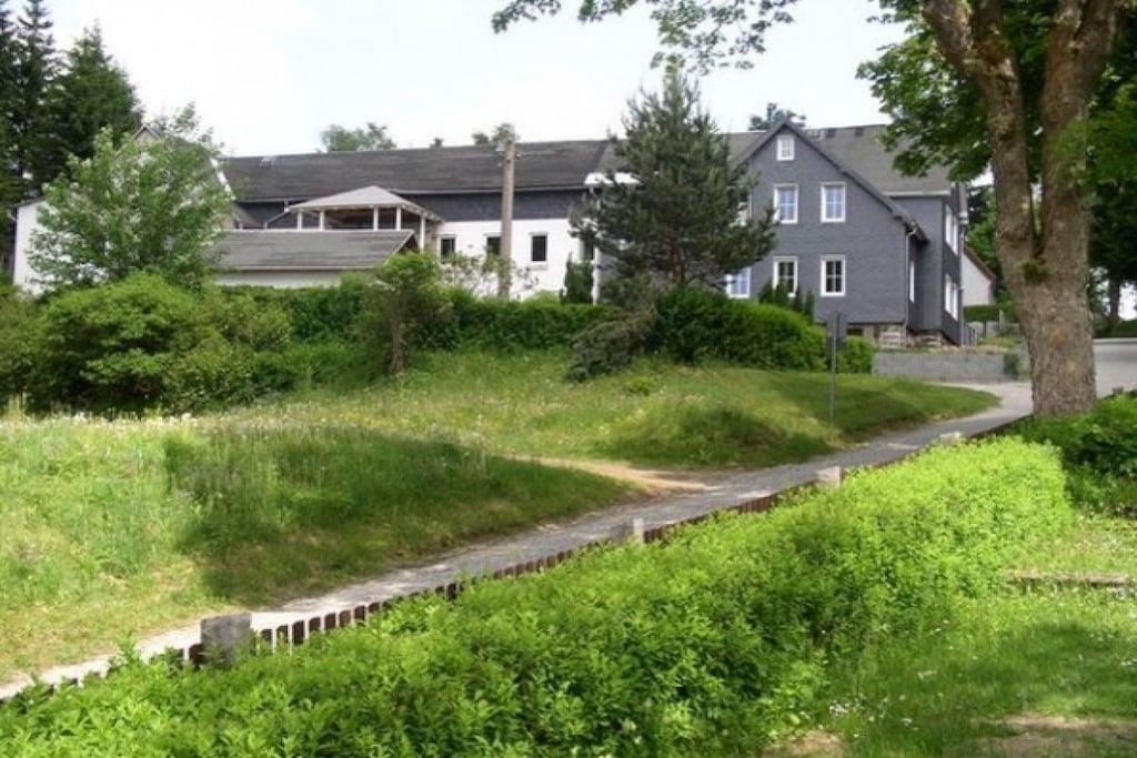 Vi tilbyder en rummelig lejlighed på 154 personer fordelt på to etager med privat udendørs adgang. Du kan leje lejligheden med 5 soveværelser = 10 senge (plus 2 mulige ekstra senge og en barneseng). Da vi opkræver en fast pris pr. person, vil antallet af soveværelser, der faktisk benyttes, blive reduceret for mindre grupper på 4 eller flere, hvilket resulterer i en lavere samlet pris. På denne måde kan du vælge præcis den størrelse, du ønsker, med trinvise priser tilgængelige for bookinger på kun én nat eller mere. I alt: 5 soveværelser til 2 personer hver, 3 badeværelser, 4 toiletter, 1 køkken med spisebord til 4 personer, 1 stue med spisebord til op til 10 personer. Vi glæder os til at byde dig velkommen til at tilbringe din ferie hos os i Thüringer Wald.