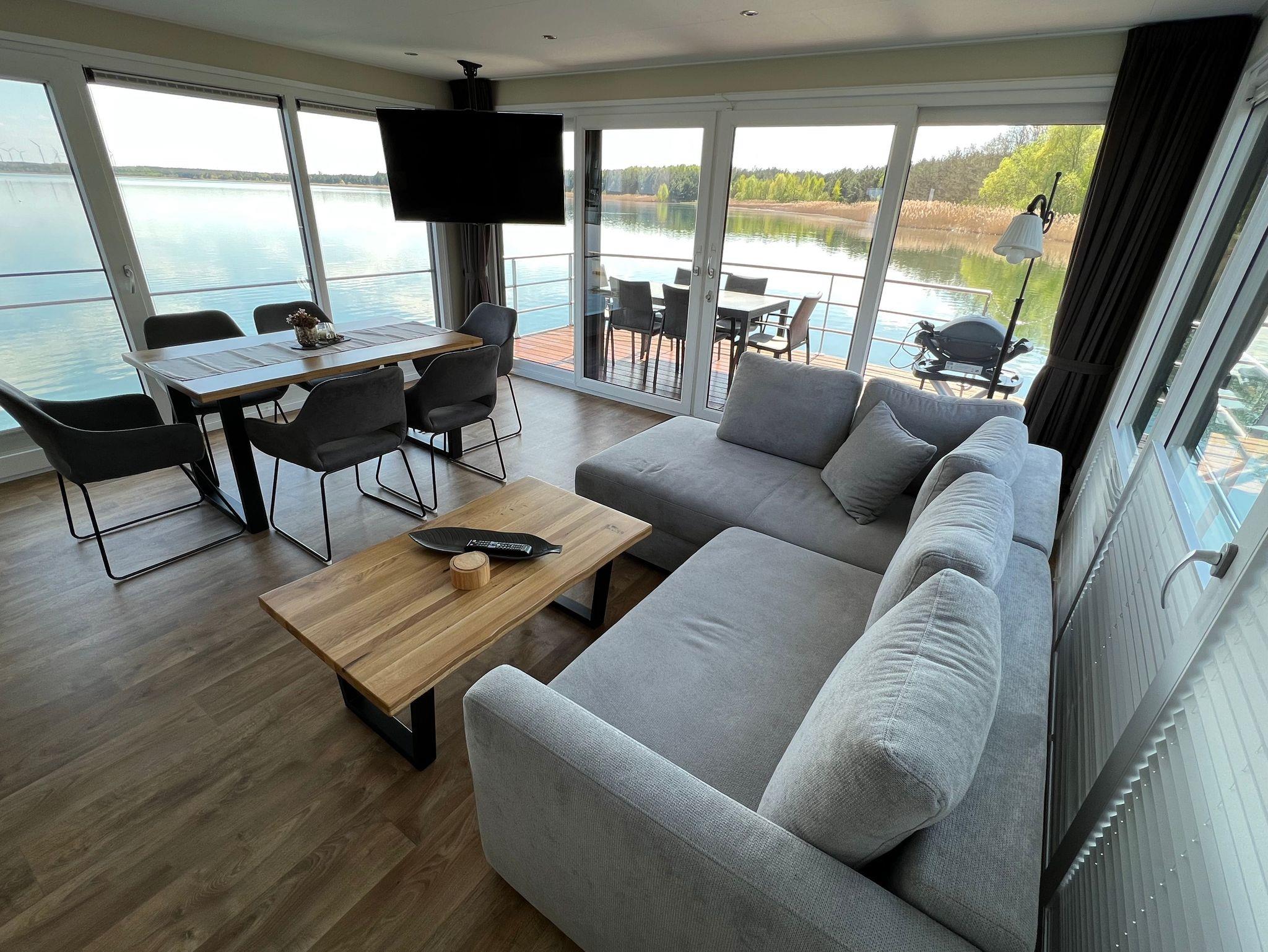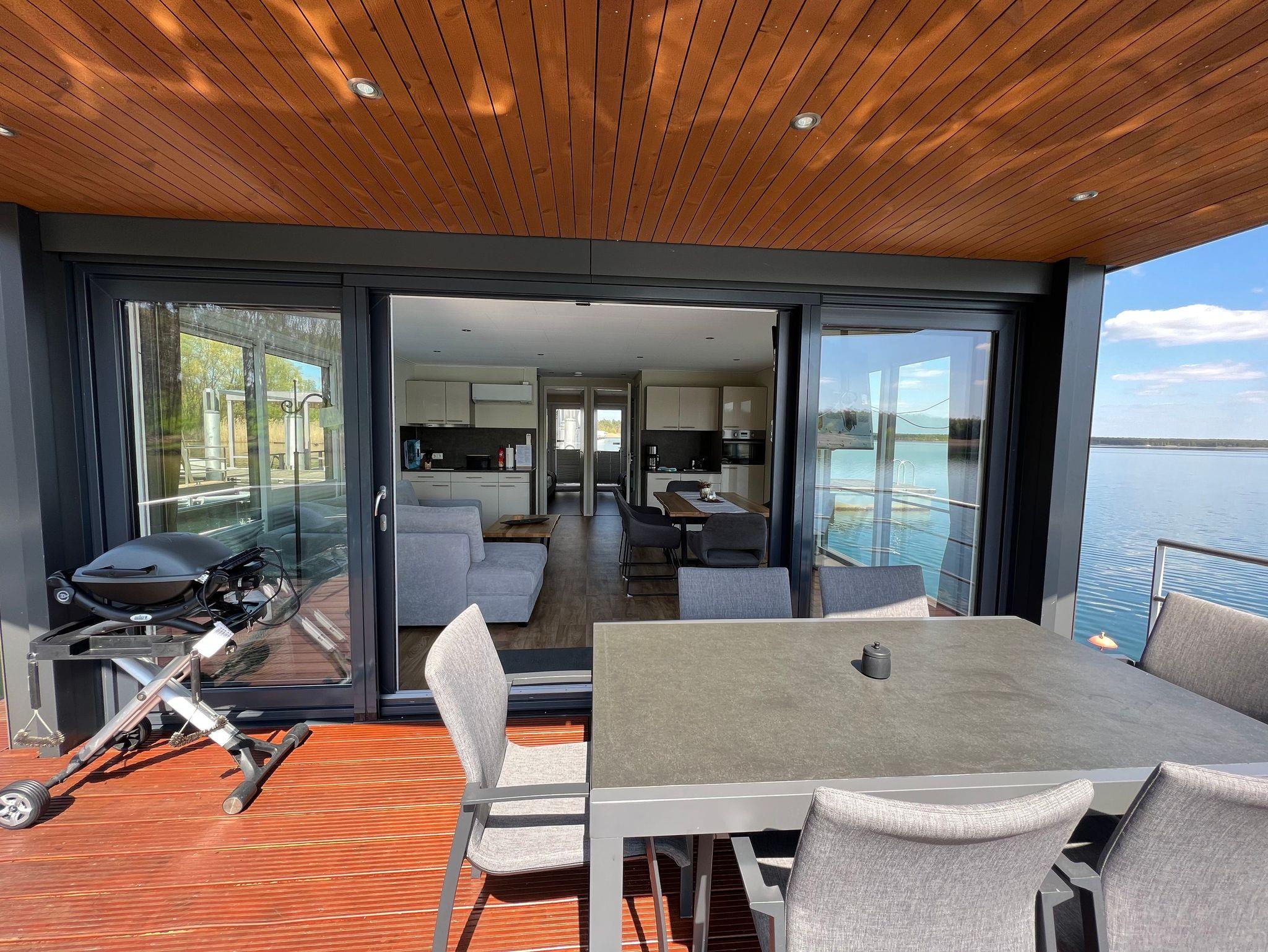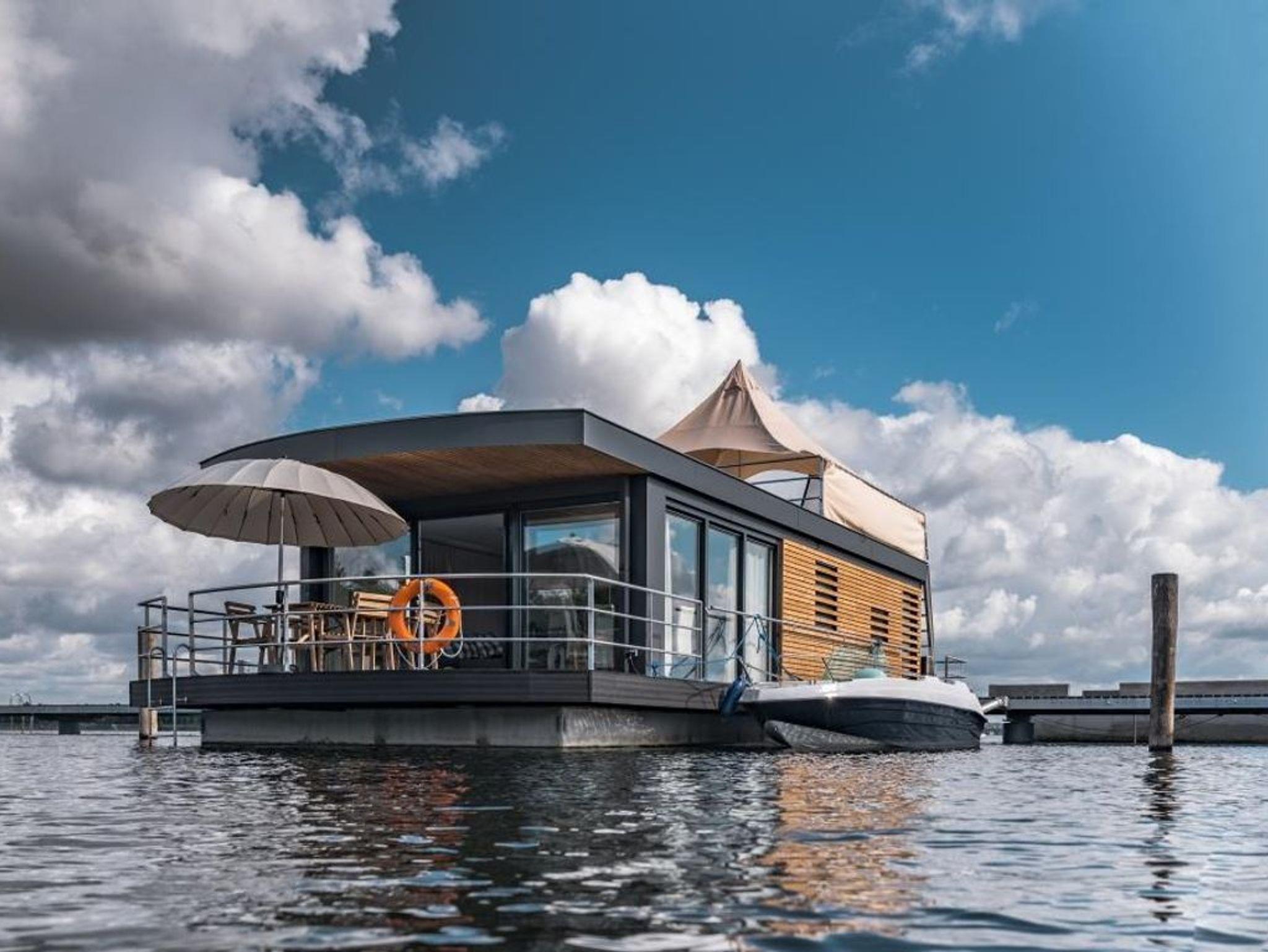 Dieses schwimmende Ferienhaus hat einen offenen Wohn-, und Essbereich mit integrierter, voll ausgestatteter Küche und bietet, Dank dem dreiseitigen Glasfront, einen tollen Ausblick auf den Gräbendorfer See. Es besitzt zwei separate Schlafzimmer mit je einem Doppelbett und Einbauschränken für ausreichenden Stauraum. Des Weiteren verfügt es über eine moderne Heizungs-/Klima-Technik, ein gefliestes Badezimmer mit Dusche und Waschtisch, ein separates WC mit Waschtisch sowie ein Panorama-Wohnzimmer mit Elektrokamin.