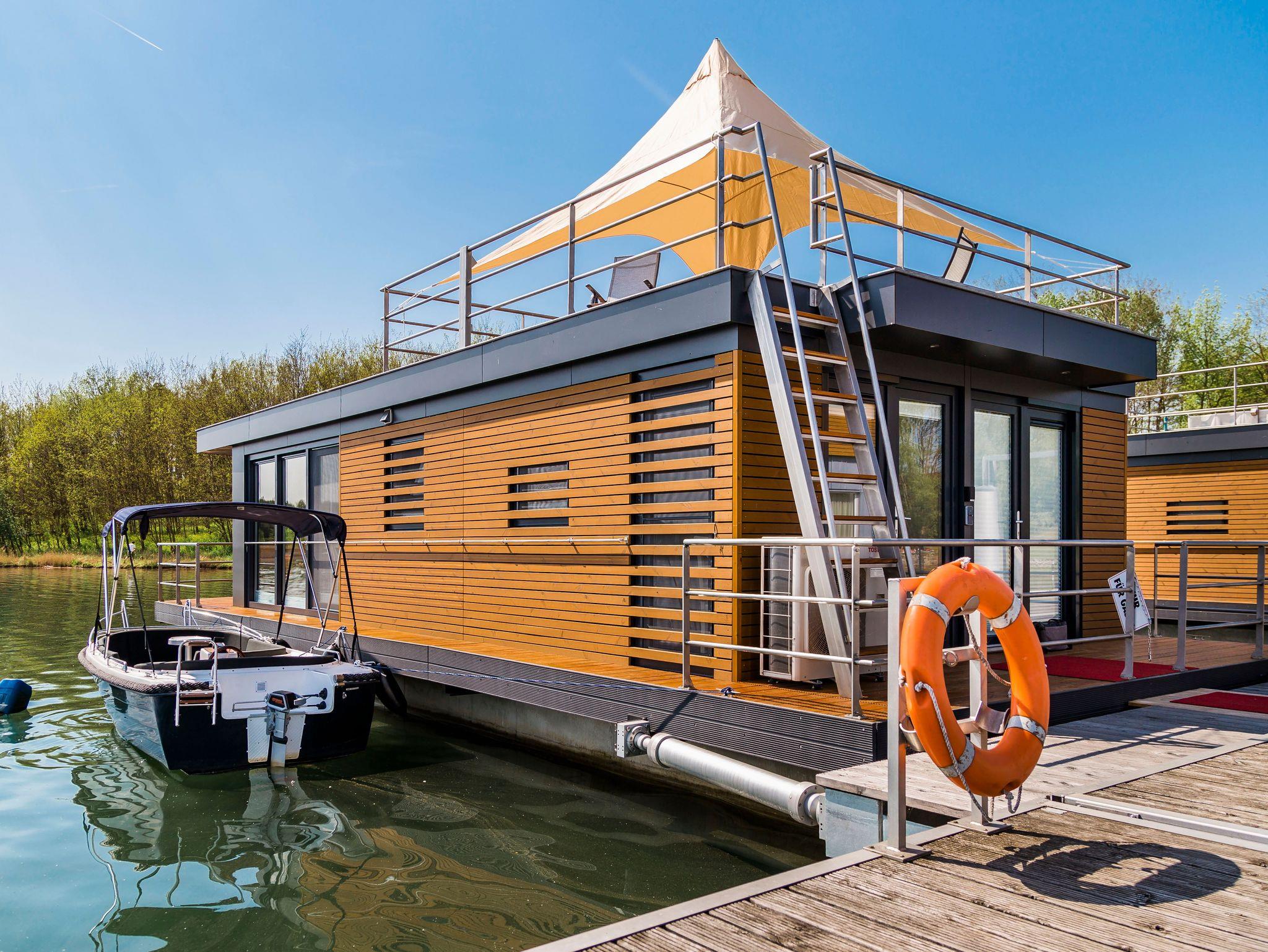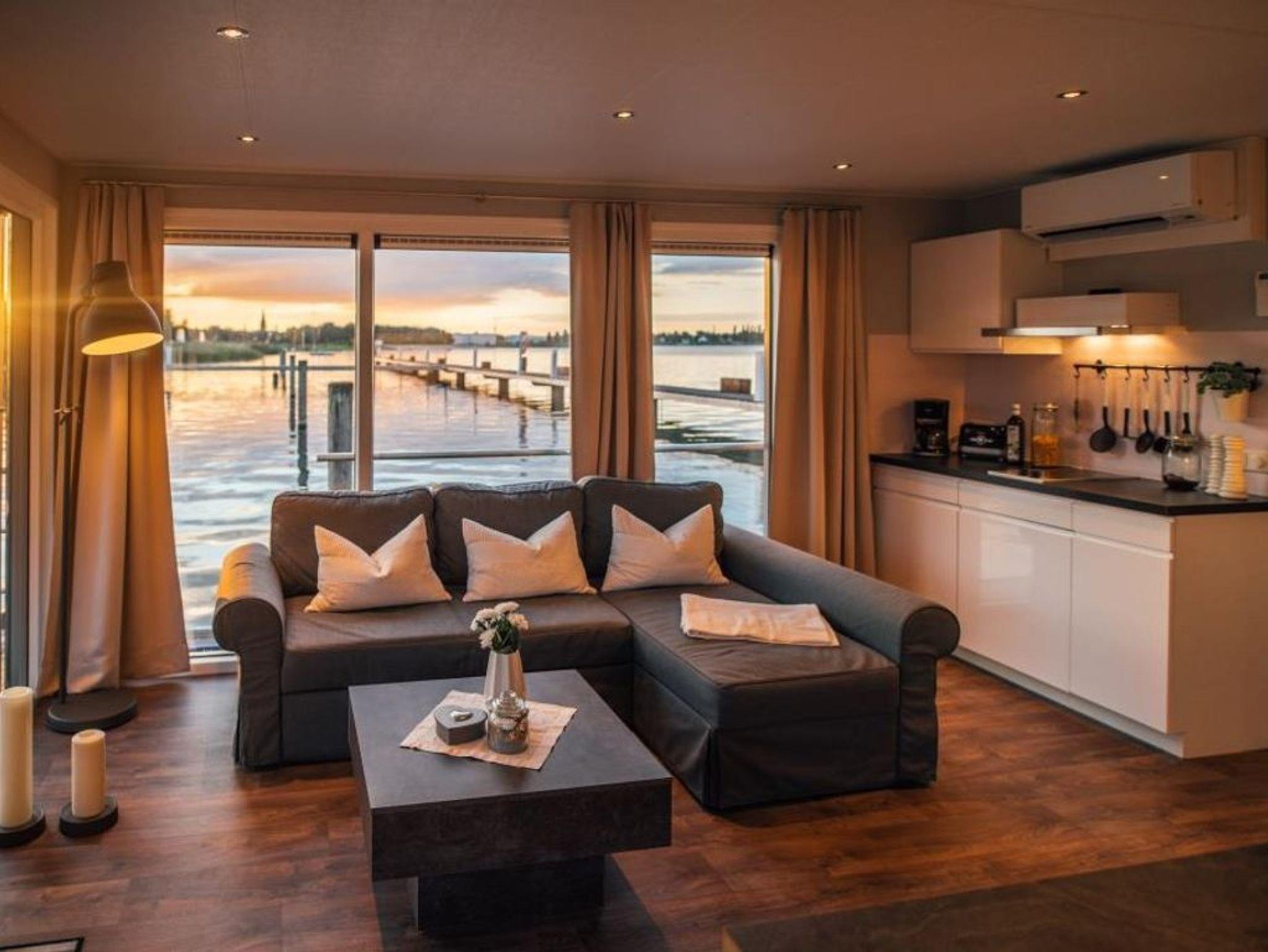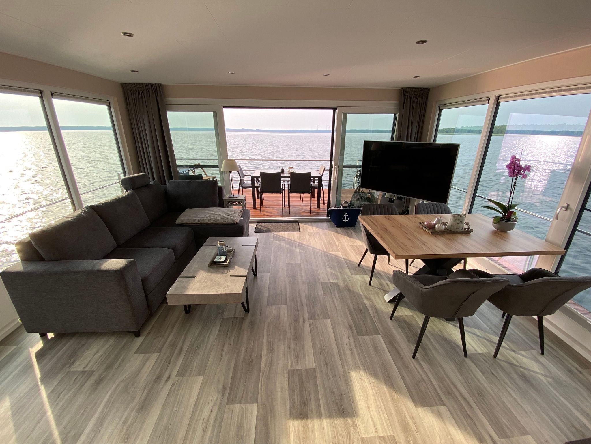 Dieses schwimmende Ferienhaus hat einen offenen Wohn-, und Essbereich mit integrierter, voll ausgestatteter Küche und bietet, Dank dem dreiseitigen Glasfront, einen tollen Ausblick auf den Gräbendorfer See. Es besitzt zwei separate Schlafzimmer mit je einem Doppelbett und Einbauschränken für ausreichenden Stauraum. Des Weiteren verfügt es über eine moderne Heizungs-/Klima-Technik, ein gefliestes Badezimmer mit Dusche und Waschtisch, ein separates WC mit Waschtisch sowie ein Panorama-Wohnzimmer mit Elektrokamin.