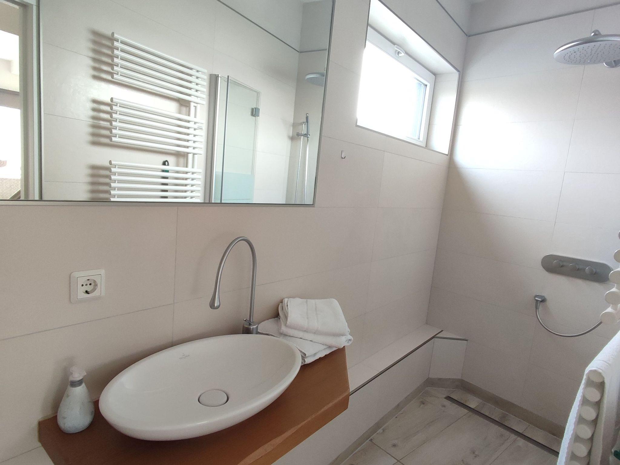 Ein modernes Bad mit Dusche und Waschtisch sowie ein separates WC