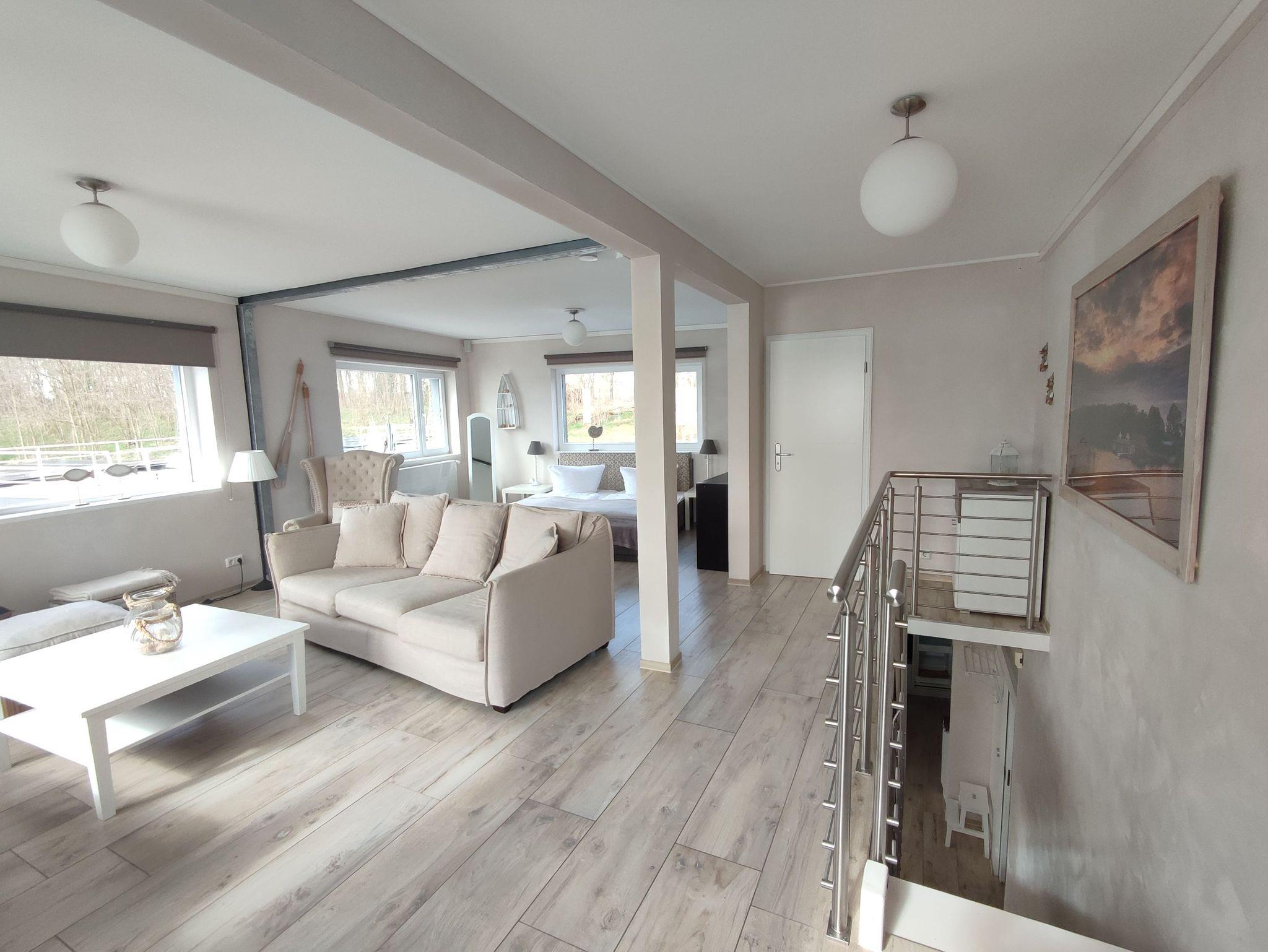 Es verbindet den Charme eines Hausbootes mit neuesten technischen Anforderungen und Feinheiten im modernen Design. Mit seiner exklusiven Ausstattung entspricht es den gehobeneren Ansprüchen an ein großzügiges Ferienhaus und bietet viel Platz für einen unvergesslichen Familienurlaub bis 6 Personen auf 2 Etagen. Wohn-/Schlafräume zwischen Erd- und Obergeschoss sind nur durch eine offene Treppe (ohne Tür) voneinander getrennt.