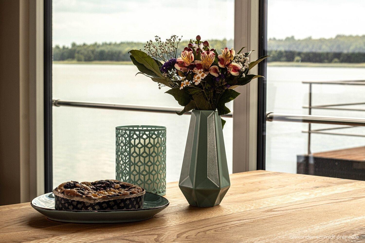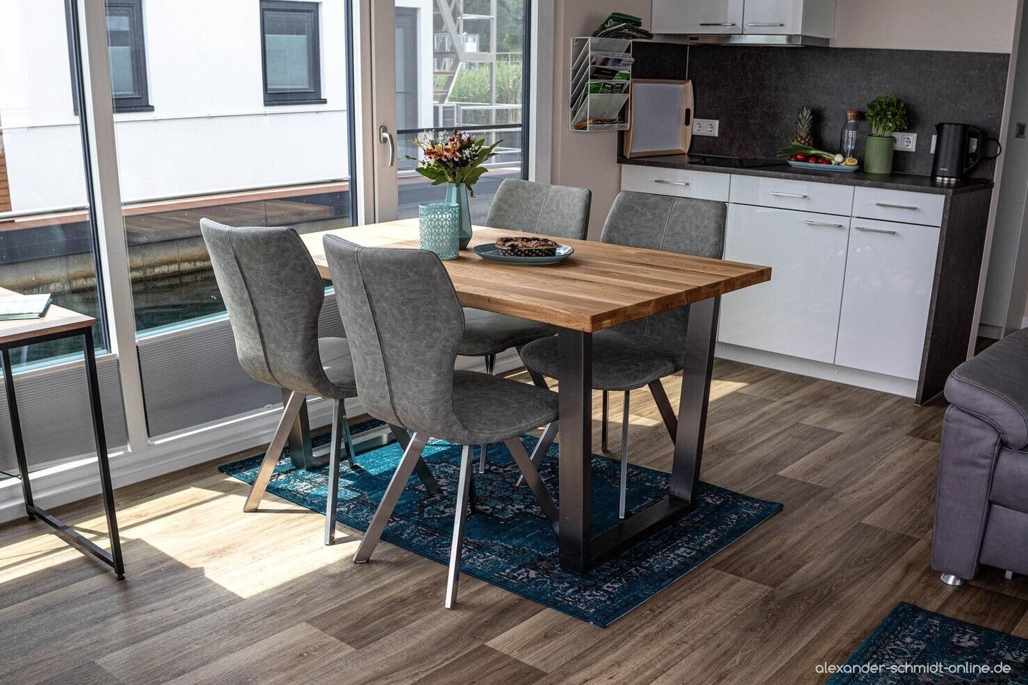 Aus dem Wohn- und Essbereich gelangen Sie auf die Terrasse. Hier können Sie Ihre Mahlzeiten genießen. Auf der Dachterrasse kann man sehr gut entspannen und die Seele baumeln lassen. Erleben Sie das Gefühl von Freiheit auf dem Wasser!