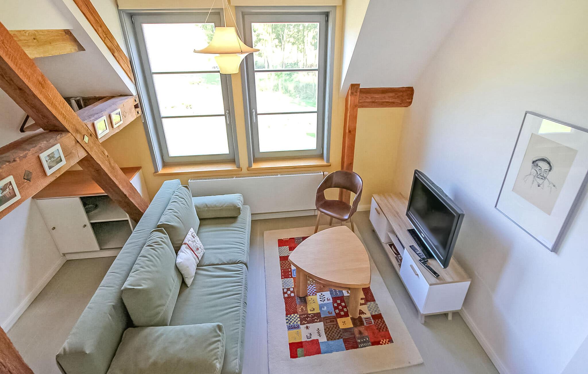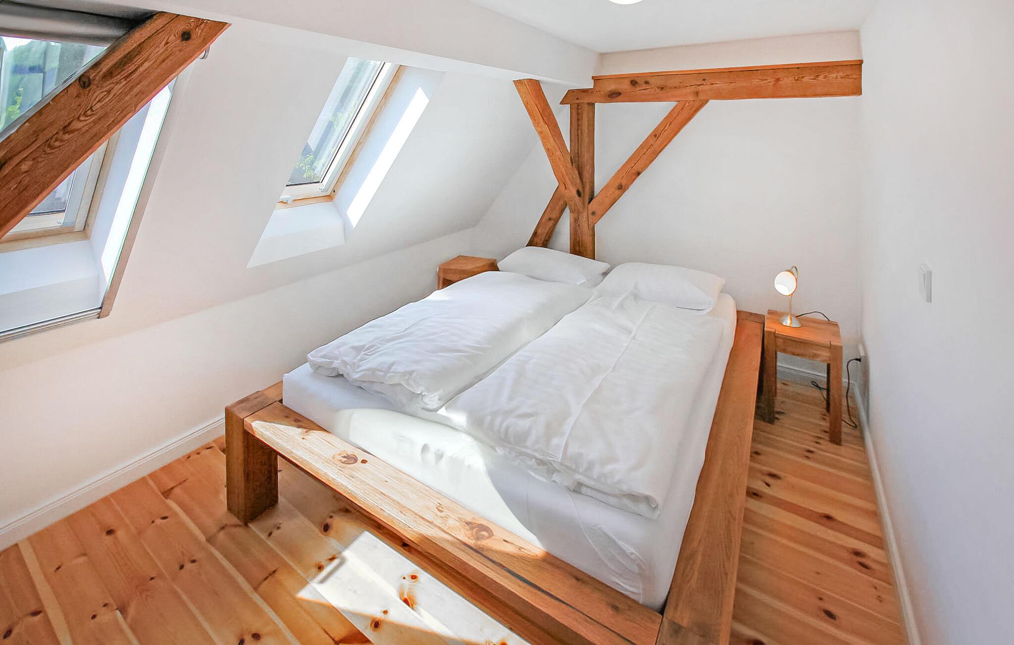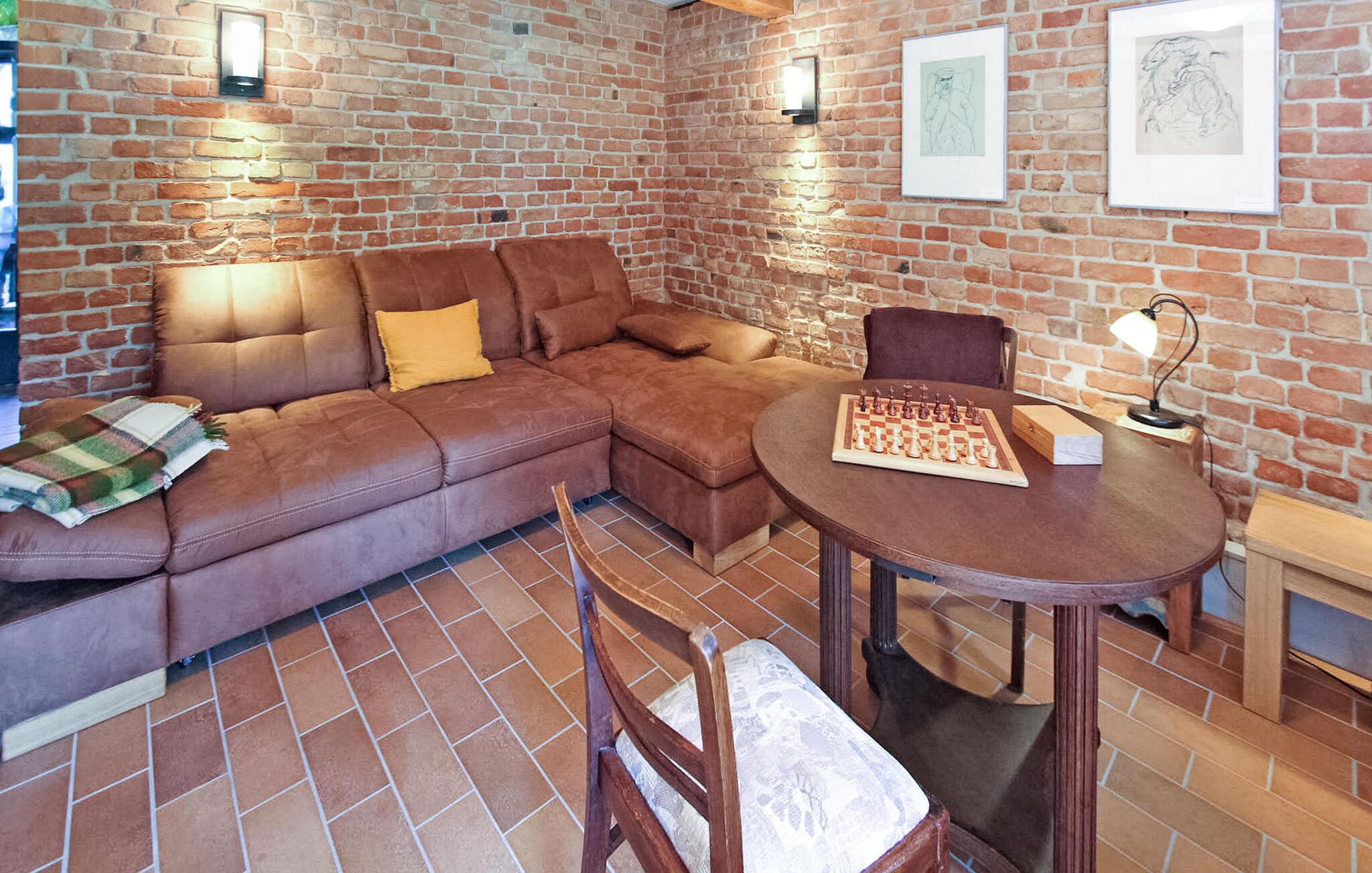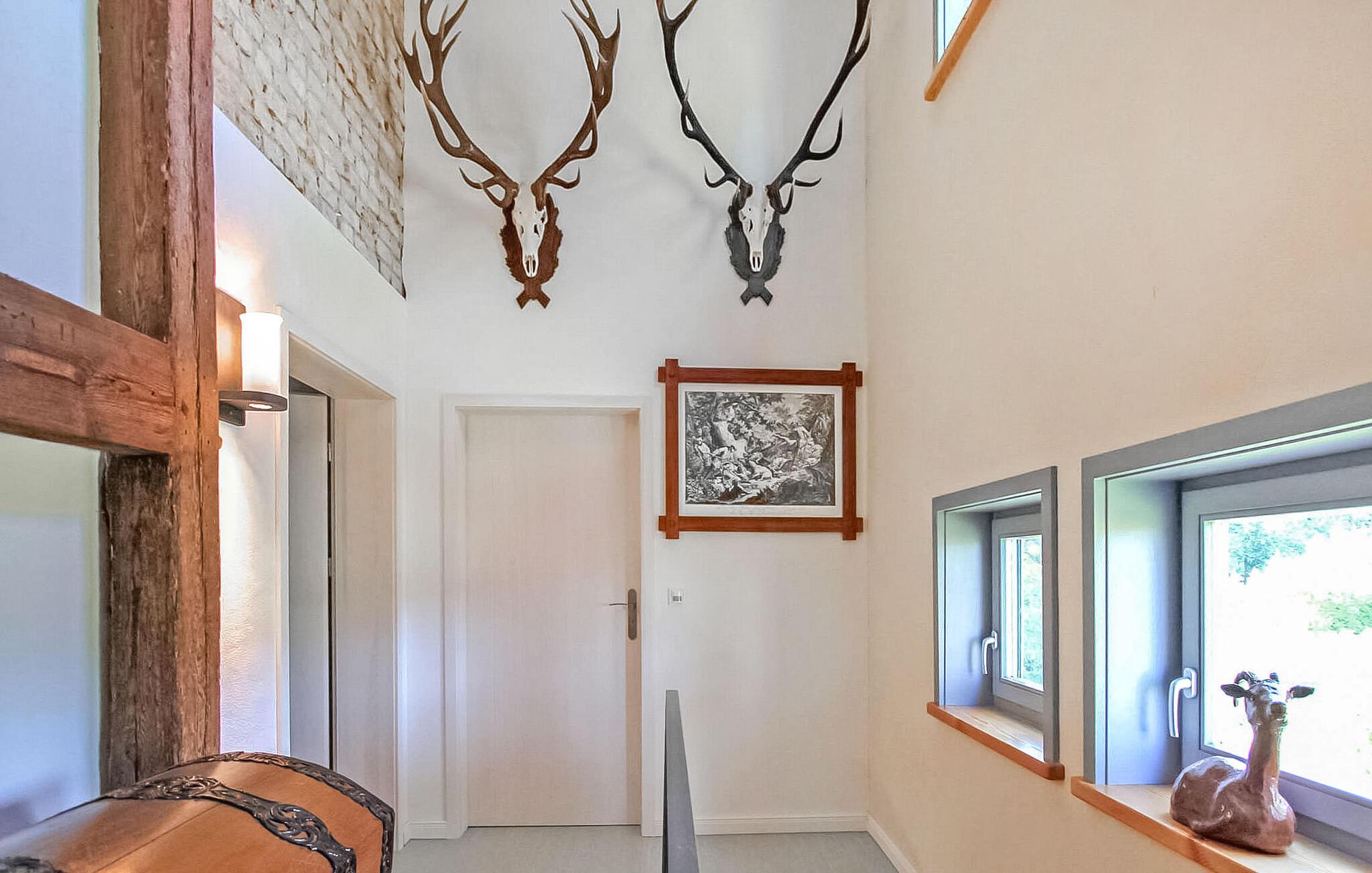 Skov, enge, åbent landskab og en fredet bygning. Dette komfortable feriehus, en tidligere lade, ligger på en fritliggende naturgrund på 5000 kvadratmeter i rolige omgivelser i skovbrynet i Riesenbrück-distriktet. Fødestedet for Paul Holz, en nationalt betydningsfuld maler og illustrator fra Vorpommern, ligger på den gamle gård. Feriehuset blev omfattende renoveret i 2016 og indrettet til en høj standard. Faciliteterne opfylder enhver kræsen smag. Bygningen er designet til et komfortabelt ophold for mindre grupper eller familier. Stueetagen har et stort fællesrum med spisebord, polstret siddegruppe, pejs (første levering af brænde inkluderet, derefter 3 € pr. kurv), fladskærms-tv og hi-fi, et moderne og fuldt udstyret køkken, en kombineret stue/soveværelse med dobbeltseng og et gæstetoilet. På øverste etage er der to separate lejligheder, hver med en stue med en eller to sovesofaer og et tv, en hems med dobbeltseng (tilgængelig via en pladsbesparende trappe) og et badeværelse hver (et brusebad, et badekar). En højstol og en rejseseng (nem at samle) kan stilles til rådighed til små børn. Gratis Wi-Fi og Netflix er også tilgængelige. Hele feriehuset er meget rummeligt, både indendørs og udendørs, og tilbyder masser af plads til retræter og afslapning, selv for større grupper. Udenfor er der flere møblerede siddeområder (nogle overdækket), et bål- og grillområde, liggestole, cykelopbevaring og parkeringspladser. Brug af den udendørs sauna er tilgængelig efter anmodning. Enkle cykler kan lejes på stedet efter aftale. Det er muligt at observere lokale klovdyrarter såsom kronhjorte, dåhjorte, rådyr og vildsvin direkte fra ejendommen. Kikkerter og spotting scopes kan lejes på stedet efter anmodning. Uden for den primære feriesæson bookes indkvarteringen også ofte af mobile samlehold eller virksomheder. Vi tilbyder rummelige indkvarteringer til særlige, overkommelige priser, selv for mindre grupper. Kæledyr: Et kæledyr er udtrykkeligt tilladt på denne ejendom.