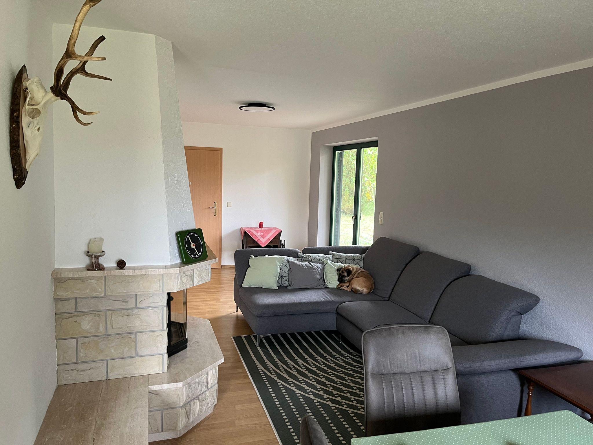 Wohnzimmer: Laminat, Kamin, Fernseher, gemütliche Sitzgelegenheiten (Schlafcouch)