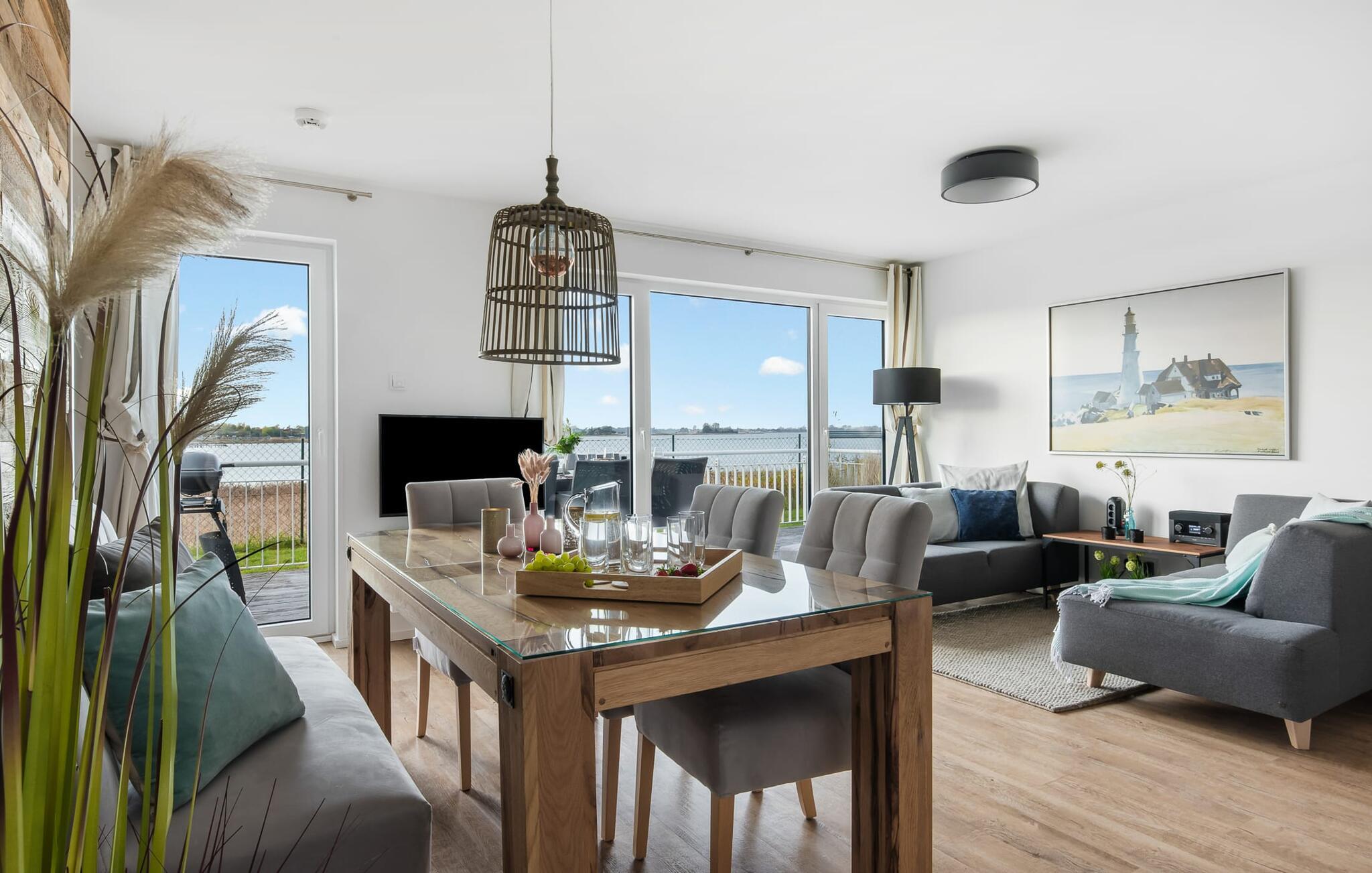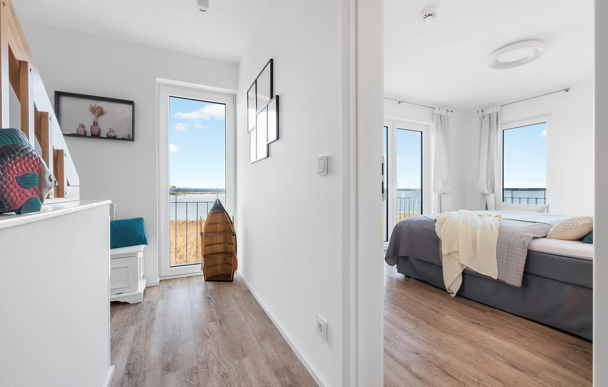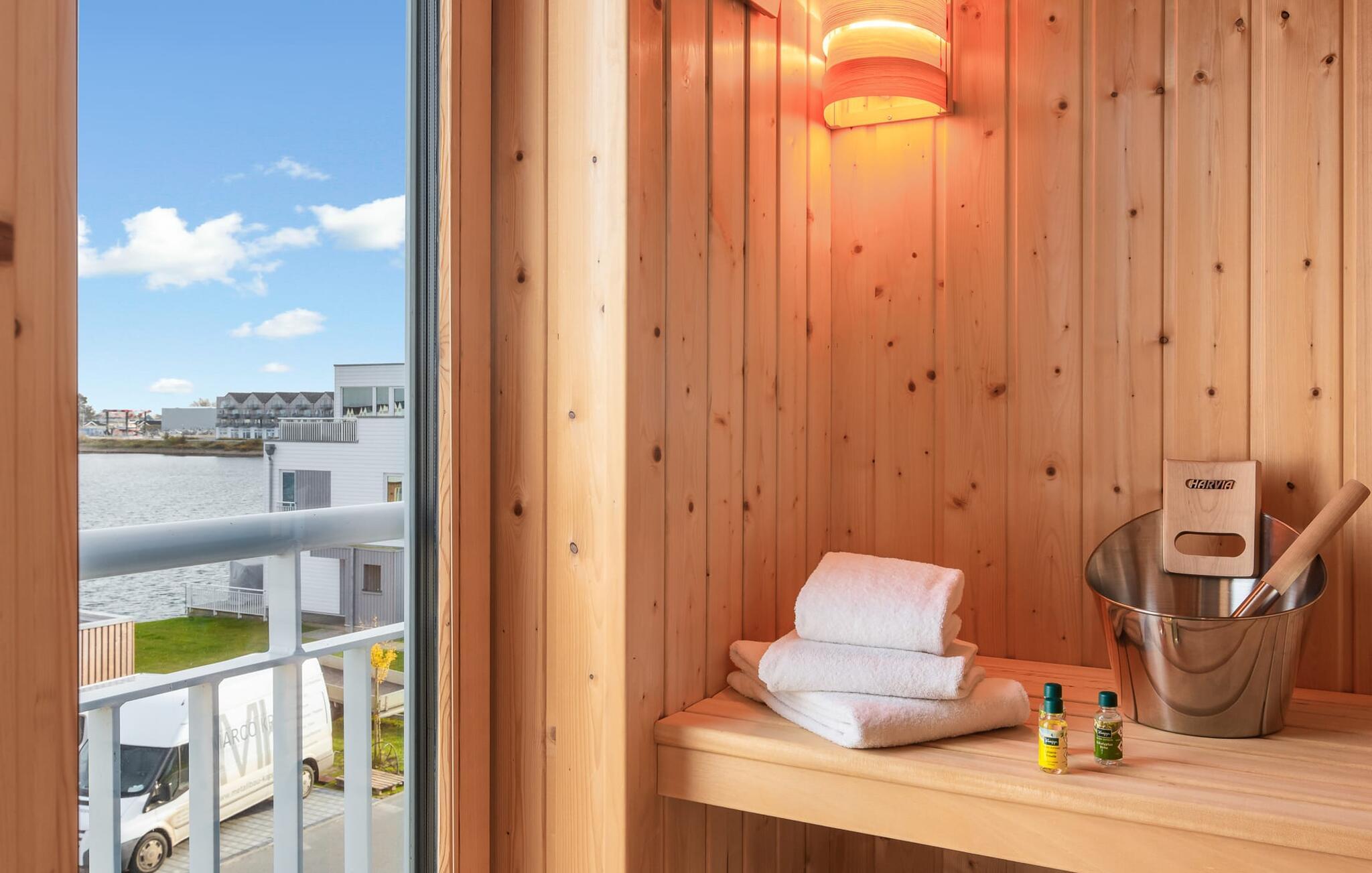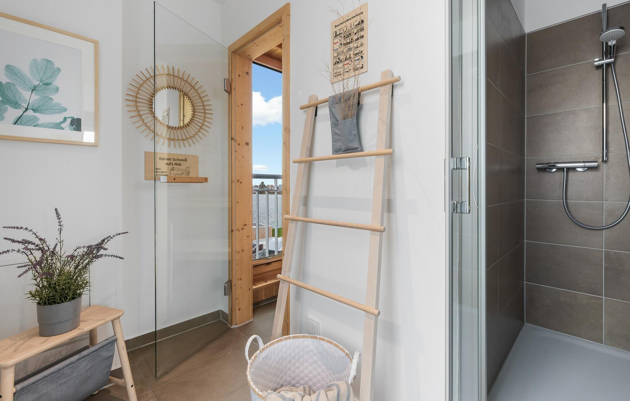 At ankomme og føle sig godt er garanteret i dette feriehus. Den udsatte beliggenhed med fri udsigt over Slien, et privat wellness-område og de rummelige terrasser kendetegner VILLA D'ORO. Omgivet af vand på et smalt næs mellem Slien og sejl- og sportsbådshavnen i feriestedet Olpenitz ved Østersøen ligger dette helt specielle feriehus VILLA D'ORO. Sandstranden kan nås på få minutter til fods, og eventyrlegepladsen ligger også i umiddelbar nærhed. Højdepunktet i det rummelige hus er studiet med tilstødende tagterrasse Uanset om det er en havnebiograf eller et flyveshow med vilde gæs, ænder og svaner, er der naturlig underholdning her. En pejs, gulvvarme og et privat wellnessområde sørger for hyggelig hygge i hver sæson. Den lyse opholds- og spisestue i ferieboligen er i stueetagen. Gulv-til-loft vinduer giver frit udsyn til sandet og sejlskibe, der passerer. En pejs og hjemmeunderholdningsprogrammet inklusive adgang til TV Now og Disney+ sikrer komfort i den mørke årstid. Det fuldt udstyrede køkken-alrum lader intet tilbage at ønske og byder på fuld feriekomfort. I kan slappe af på tre boligniveauer i VILLA D'ORO. Højdepunktet er et studie på anden sal med en tilstødende tagterrasse og udsigt over Sleien til Maasholm. På første sal er der to lyse soveværelser med direkte udsigt til vandet, når I falder i søvn og vågner. Det store soveværelse vender ud mod Slien og er indrettet med en dobbeltseng. Det andet soveværelse har udsigt over lystbådehavnen og har også en komfortabel dobbeltseng. Begge soveværelser kan mørklægges. En sovesofa i studiet tilbyder et behageligt sted at sove med en fantastisk udsigt. På første sal er der også det store badeværelse med udsigt over havnen og en stor bruseniche i gulvniveau. Den finske sauna med endnu en tilstødende bruser er placeret i studiet på 2. sal og får wellness-hjerter til at banke hurtigere. Et gæstetoilet i stueetagen giver ekstra komfort. Der er to parkeringspladser foran huset. Og kommer I med cykler, kan I nemt opbevare dem i jeres eget cykelskur. Vores favoritsted: Slap af i den finske sauna og se travlheden på havnen Bemærk venligst: OstseeResort Olpenitz er meget populært, og der bygges fortsat i parken. Ikke desto mindre kan I se frem til en 5-stjernet standard og et førsteklasses ophold. Byggeaktiviteterne kommer ikke til at forstyrre jer på ferien, og derfor gives der ikke yderligere afslag i prisen.