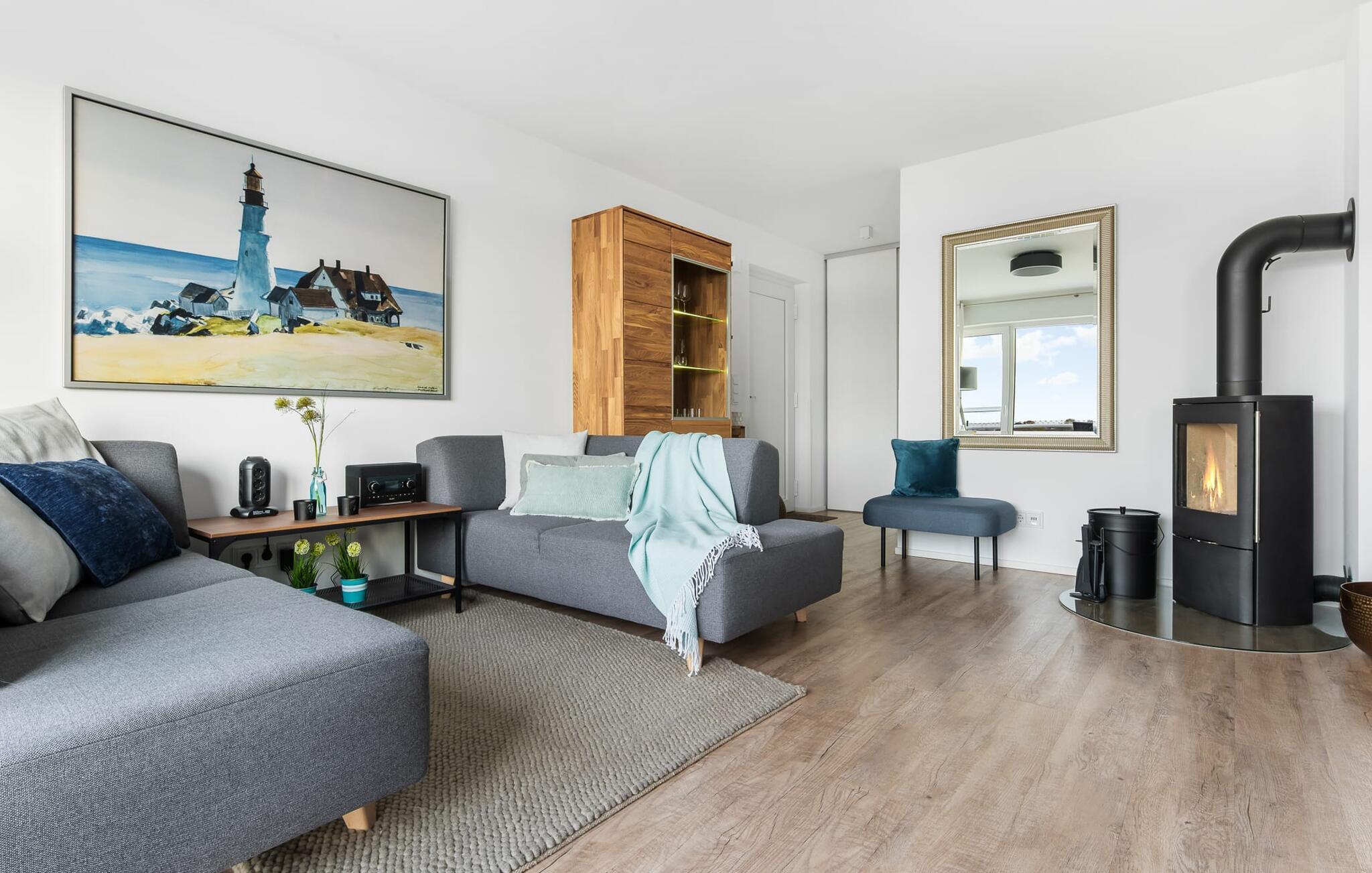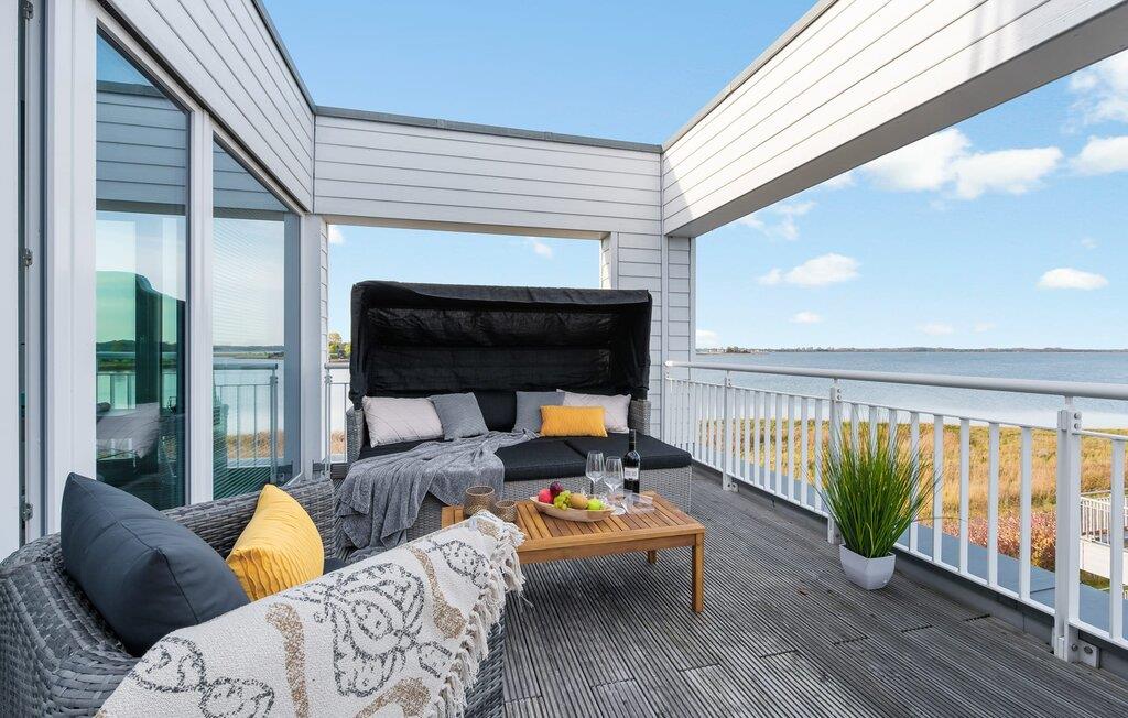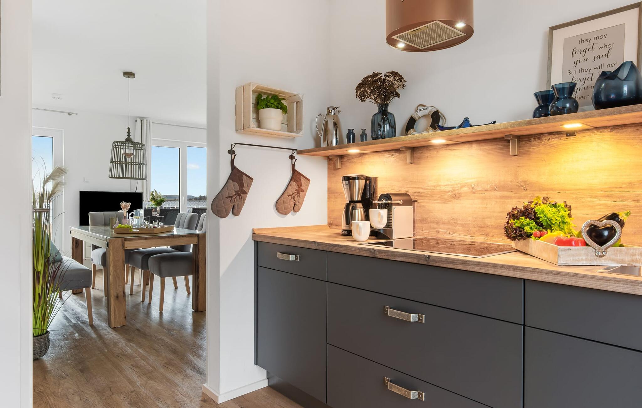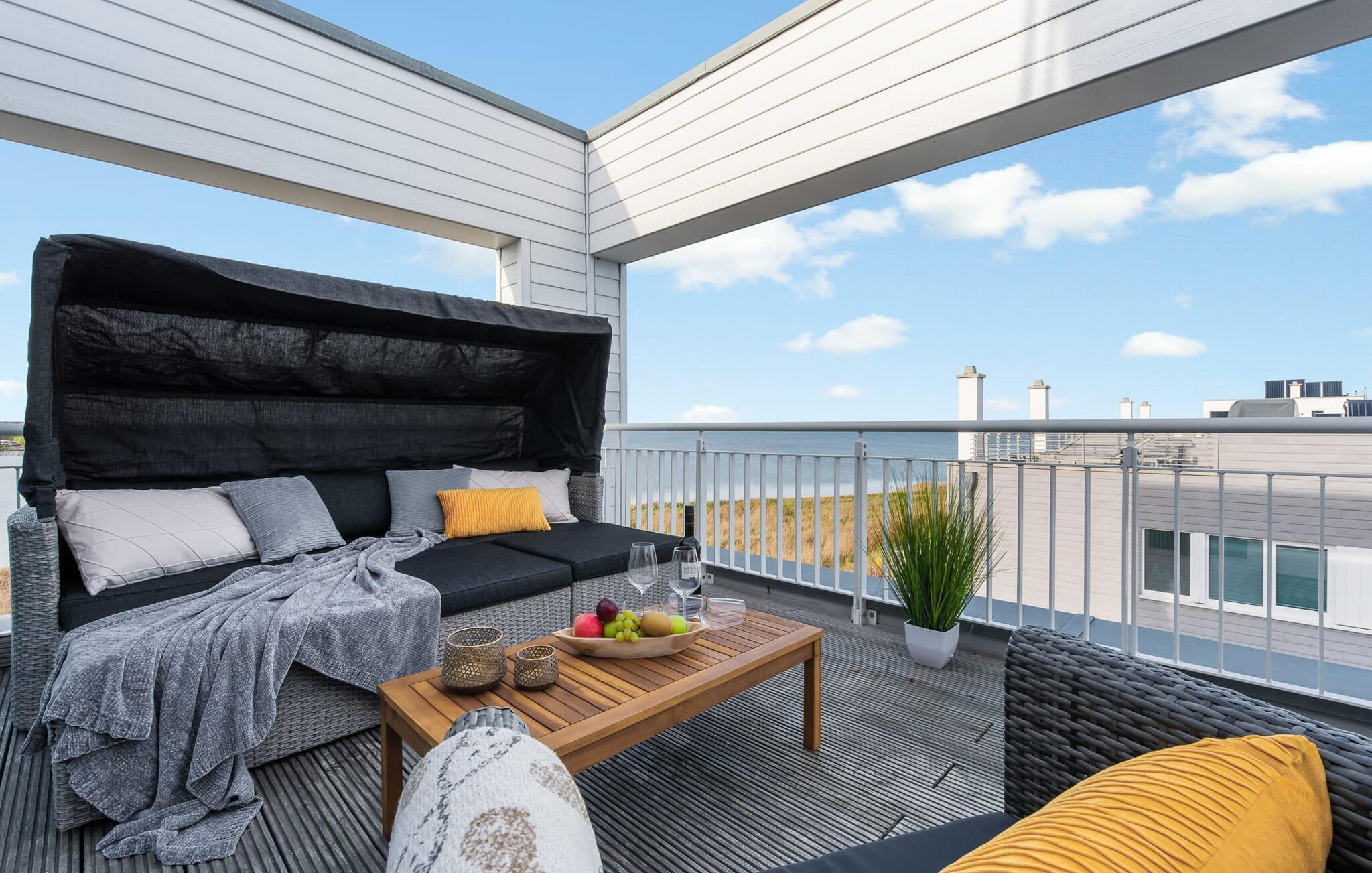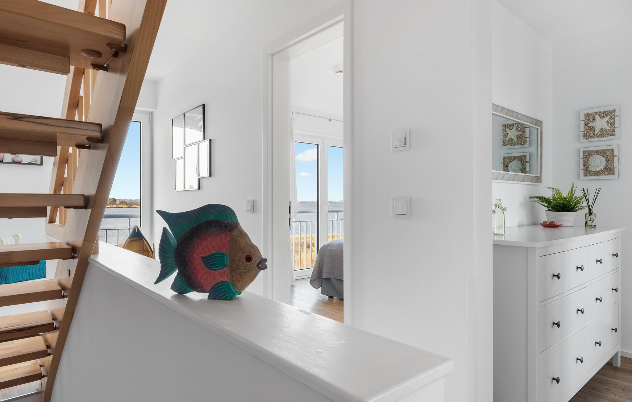 At ankomme og føle sig godt er garanteret i dette feriehus. Den udsatte beliggenhed med fri udsigt over Slien, et privat wellness-område og de rummelige terrasser kendetegner VILLA D'ORO. Omgivet af vand på et smalt næs mellem Slien og sejl- og sportsbådshavnen i feriestedet Olpenitz ved Østersøen ligger dette helt specielle feriehus VILLA D'ORO. Sandstranden kan nås på få minutter til fods, og eventyrlegepladsen ligger også i umiddelbar nærhed. Højdepunktet i det rummelige hus er studiet med tilstødende tagterrasse Uanset om det er en havnebiograf eller et flyveshow med vilde gæs, ænder og svaner, er der naturlig underholdning her. En pejs, gulvvarme og et privat wellnessområde sørger for hyggelig hygge i hver sæson. Den lyse opholds- og spisestue i ferieboligen er i stueetagen. Gulv-til-loft vinduer giver frit udsyn til sandet og sejlskibe, der passerer. En pejs og hjemmeunderholdningsprogrammet inklusive adgang til TV Now og Disney+ sikrer komfort i den mørke årstid. Det fuldt udstyrede køkken-alrum lader intet tilbage at ønske og byder på fuld feriekomfort. I kan slappe af på tre boligniveauer i VILLA D'ORO. Højdepunktet er et studie på anden sal med en tilstødende tagterrasse og udsigt over Sleien til Maasholm. På første sal er der to lyse soveværelser med direkte udsigt til vandet, når I falder i søvn og vågner. Det store soveværelse vender ud mod Slien og er indrettet med en dobbeltseng. Det andet soveværelse har udsigt over lystbådehavnen og har også en komfortabel dobbeltseng. Begge soveværelser kan mørklægges. En sovesofa i studiet tilbyder et behageligt sted at sove med en fantastisk udsigt. På første sal er der også det store badeværelse med udsigt over havnen og en stor bruseniche i gulvniveau. Den finske sauna med endnu en tilstødende bruser er placeret i studiet på 2. sal og får wellness-hjerter til at banke hurtigere. Et gæstetoilet i stueetagen giver ekstra komfort. Der er to parkeringspladser foran huset. Og kommer I med cykler, kan I nemt opbevare dem i jeres eget cykelskur. Vores favoritsted: Slap af i den finske sauna og se travlheden på havnen Bemærk venligst: OstseeResort Olpenitz er meget populært, og der bygges fortsat i parken. Ikke desto mindre kan I se frem til en 5-stjernet standard og et førsteklasses ophold. Byggeaktiviteterne kommer ikke til at forstyrre jer på ferien, og derfor gives der ikke yderligere afslag i prisen.
