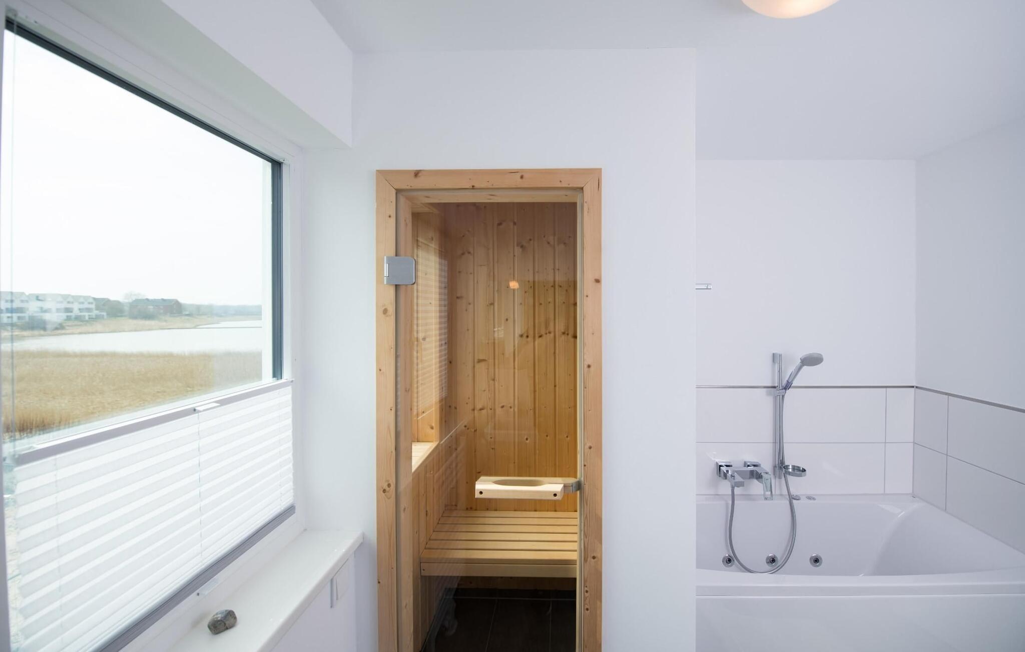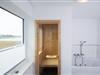 På første sal er også soveværelset med sit eget personlige wellness-program: et spabad, en sauna (infrarød varmekabine) med udsigt over vandet og en bruser gør dette badeværelse til et privat wellness-område.