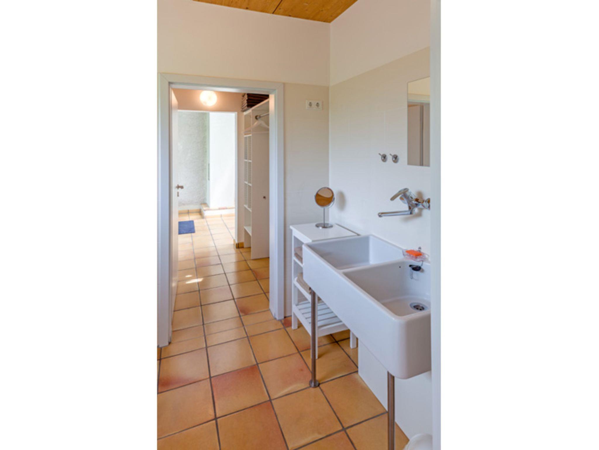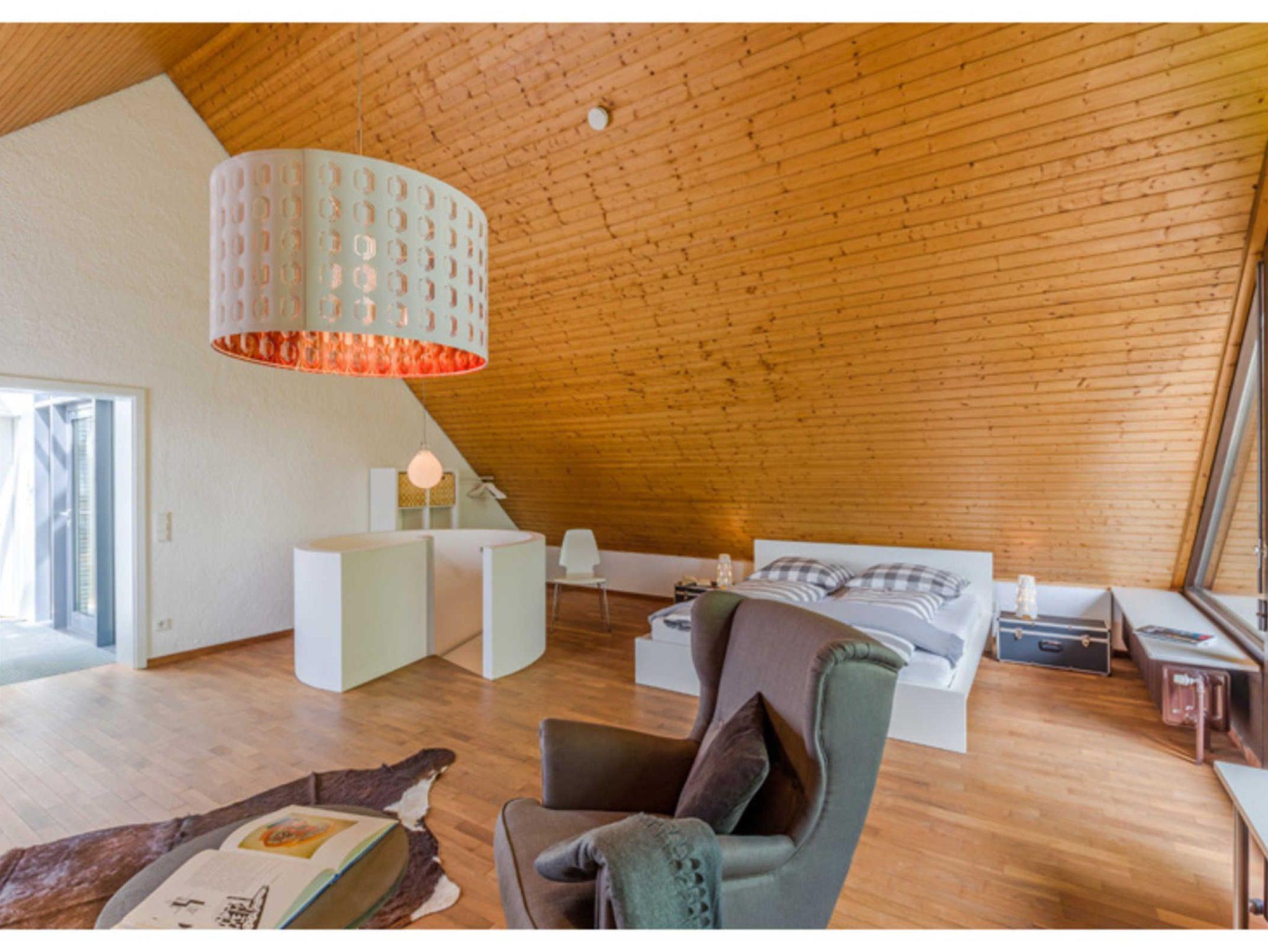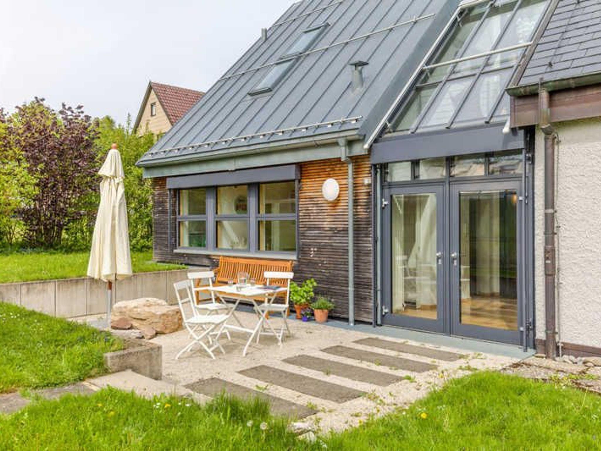 Das Feriendomizil liegt am Stadtrand von Schwenningen am Neckar in ruhiger Lage inmitten eines großen Garten, das Stadtzentrum ist ca. 1,5 km entfernt. Das Mietobjekt besitzt einen separaten Eingang, Carport für 1 Fahrzeug ist vorhanden, sowie ein nicht überdachter Stellplatz. Die Räumlichkeiten sind individuell, schlicht und hochwertig ausgestattet. Verarbeitet wurden für die Bodenbeläge Schiefer, Parkett sowie terra cotta- Fliesen, die meisten Räume sind mit Fußbodenheizung ausgestattet. Zur Verfügung stehen auf 2 Etagen mit 140 qm für 2 bis 5 Personen ein großzügiger Wohnbereich mit Aussicht in die Natur, Balkon und Terrasse, sowie ein Gartenbereich, insgesamt 3 Schlafräume (2 Doppelzimmer und1 Einzelzimmer), eine vollausgestattete Küche, 2 Bäder, separates Gäste- WC, Garderobe, Wasch- Stauraum. Eingangsbereich EG: Eingangsbereich EG mit Garderobe und Regalfächer sowie ein Ganzkörperspiegel, direkter Durchgang zur Außenterrasse. Badezimmer EG mit separatem WC: begehbare Dusche mit Glasduschwand, großer Waschtisch mit Spiegel und Ablagemöglichkeiten. Das separate Gäste-WC liegt nebenan, beide Räume verfügen über Außenfenster. Hauswirtschaftsraum/ Stauraum EG: Waschmaschine, Wäscheständer, Staubsauger, Reinigungsutensilien, kleiner Arbeitsbereich mit Telefonanschluss und Blick in die Natur, der Raum ist durch eine Schiebetür vom Küchenbereich getrennt. Küche: Bulthaup Einbauküche, ausgestattet mit Spülmaschine, Backofen, 4-Feld Cerankochbereichmit Abzugshaube, Kaffee-Maschine, Nespresso – Maschine, Toaster, Wasserkocher, Kühlschrank (biofresh) ohne Tiefkühlfach und LG- Multimediaanlage. Elektrische Jalousien können vor zu viel Sonneneinstrahlung schützen. Wohnbereich EG: Heller Wohnbereich mit Esstisch und 5 Stühlen, Blick in den Garten, Kachelofen (Erstausstattung Holz ist vorhanden), Sofa und 1 Ohrensessel, TV (mit Satelliten TV/ Radio). Zugang zur großen, teils überdachten Terrasse, elektrische Jalousien an den großen Fenstern. Gast 1/ Schlafzimmer EG (1Person): Durch eine Schiebetür vom Wohnbereich getrennt, Einzelbett (90X200cm), Ablage-möglichkeiten (Sideboard und Kleiderbügelstange) vorhanden, Business –Schreibtisch mit Internetzugang, Blick in den Außenbereich. Durchgangszimmer mit einer weiteren Schiebetür zum Turm mit Wendeltreppe ins OG. Gast 2/ Atelier OG (2Personen): Großzügiger Schlaf- Rückzugsraum mit Doppelbett (franz. Bett 180X200cm) und Balkon (ca.8qm überdacht), 2 Ohrensesseln mit Beistelltisch und Soundanlage, Ablagemöglichkeiten (Sideboard und Kleiderbügelstange) vorhanden. Wintergartenbereich OG: Ruhebereich mit Glasdach, elektrische Beschattungsanlage vorhanden, chilligem Sitzmöbel (1Person) und Beistelltisch, toller Blick in den Garten, durch Metallgitterboden vom EG getrennt. Gast 3/ Schlafzimmer OG (2Personen): Lichtdurchflutetes Schlafzimmer (durch Dachfenster und Oberlichter, elektrische Abdunkelung möglich) mit Doppelbett (separate Matratzen, je 90X200cm), großem Kleiderschrank und direktemZugang zu einem weiteren Bad. Bad OG: Das Bad verfügt über 1 großen Waschtisch mit Spiegel und Ablagefläche, Föhn, Wellnessdusche und WC, Außenfenster und Oberlichter. Weitere Informationen: Der Bereich OG ist durch eine Außentreppe mit separater Eingangstür erreichbar und durch die Wendeltreppe im Turm mit dem EG verbunden. Es steht Ihnen ein Safe zur Verfügung. Außenbereich/ Garten und Terrasse: Zum Ferienhaus gehört ein schön gestalteter Außenbereich im Garten, welcher teilweiseüberdacht ist, mit Gartenbank, großem Sonnenschirm, 2 Tischen mit insgesamt 5 Stühlen und 2 Sonnenliegen (in den Sommermonaten), schöner Blick in die Natur. Vom DTV wurde das Haus mit 5 Sternen ausgezeichnet.